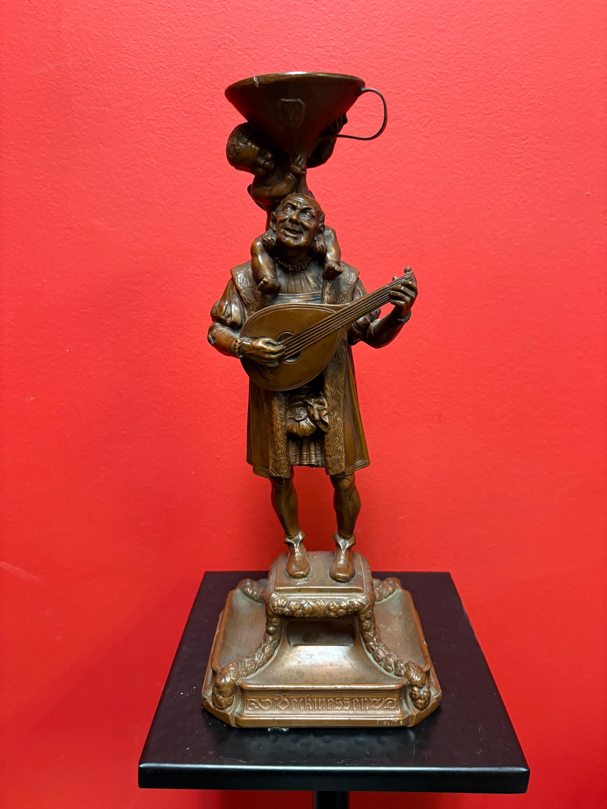 Beautiful 12 inch high antique European 19 century bronze of a mandolin player with a cherub statue candlestick great condition and great value - B