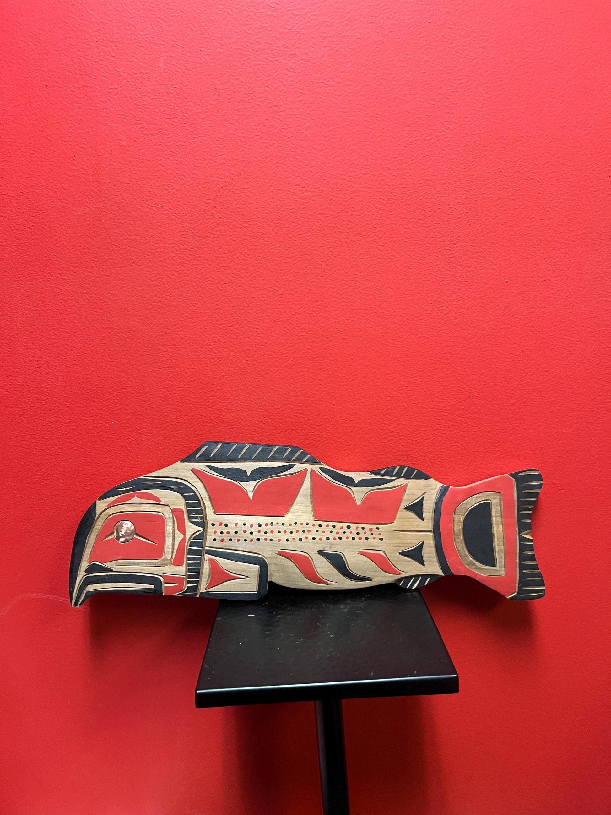 Beautiful 17 x 6 inch high indigenous first nations Squamish plaque of a salmon  by Brad Joseph Junior  signed  needs a hanger  great value