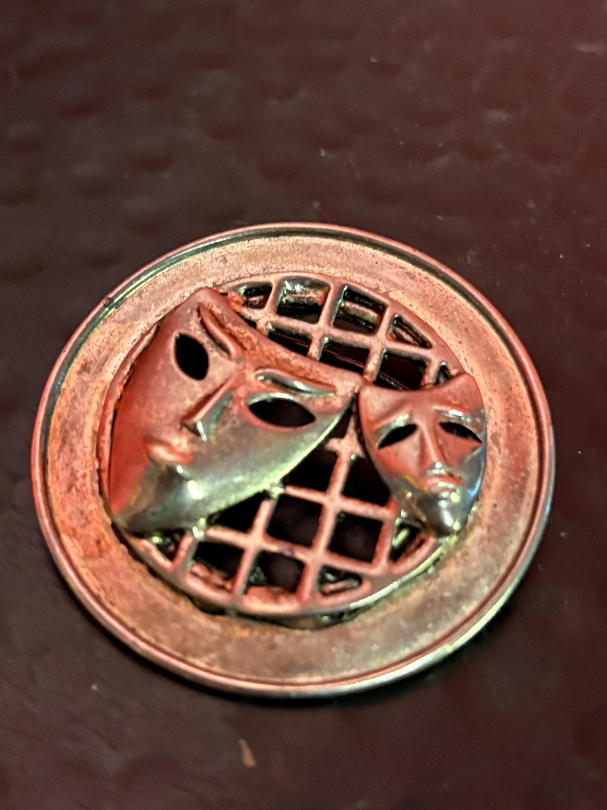 Beautiful 2 inch silver plated drama mask brooch — wonderful gift and good value