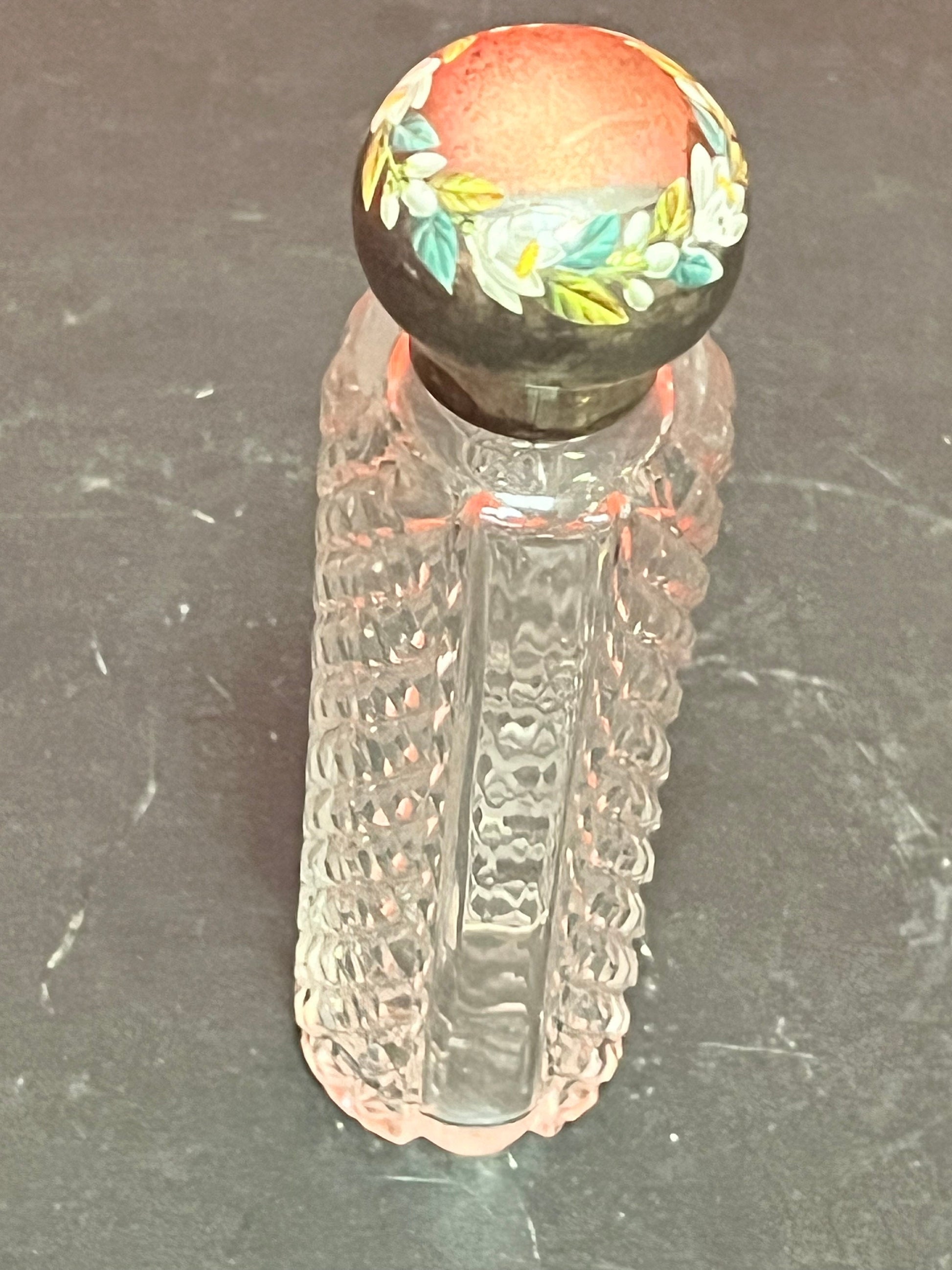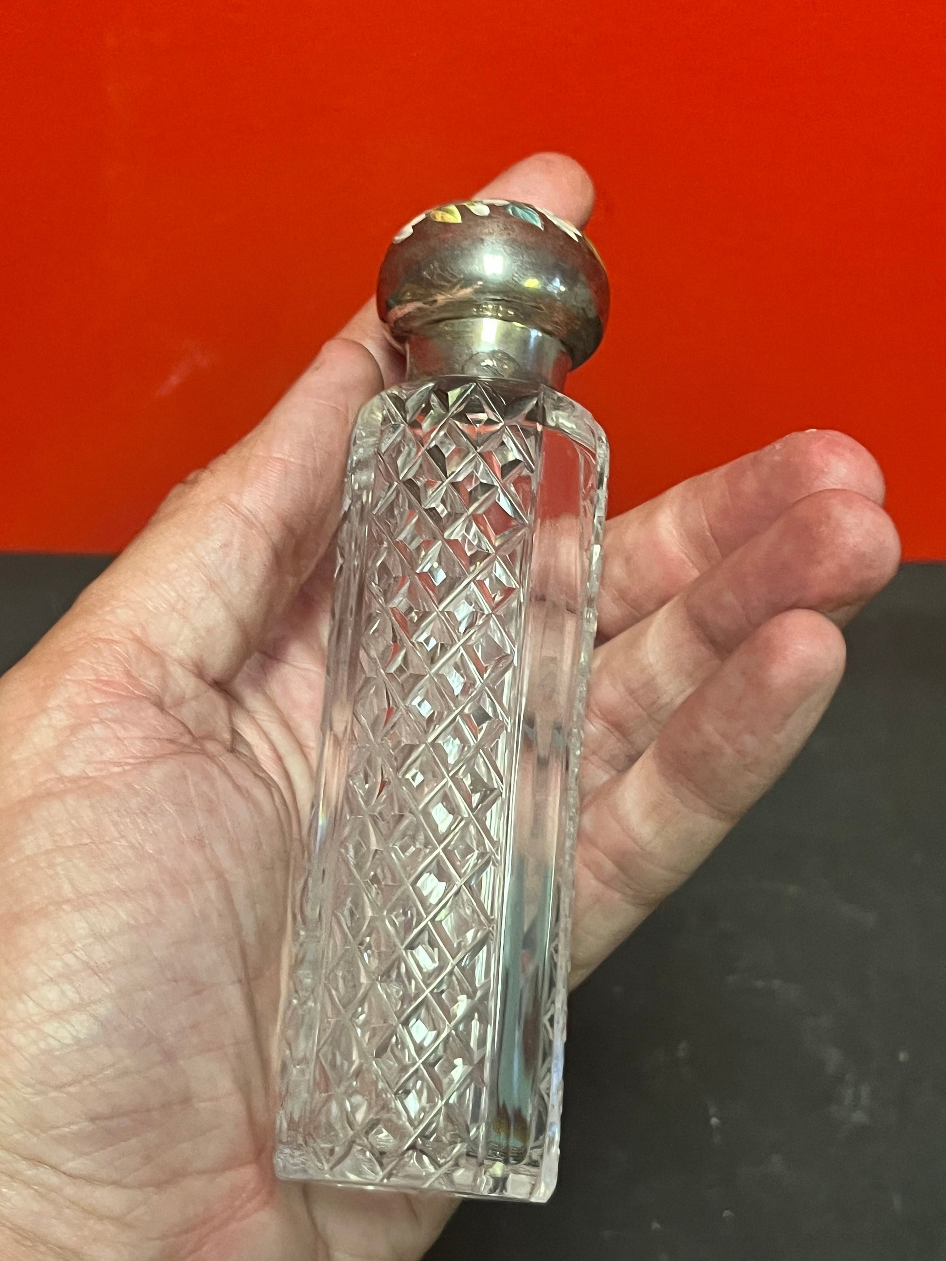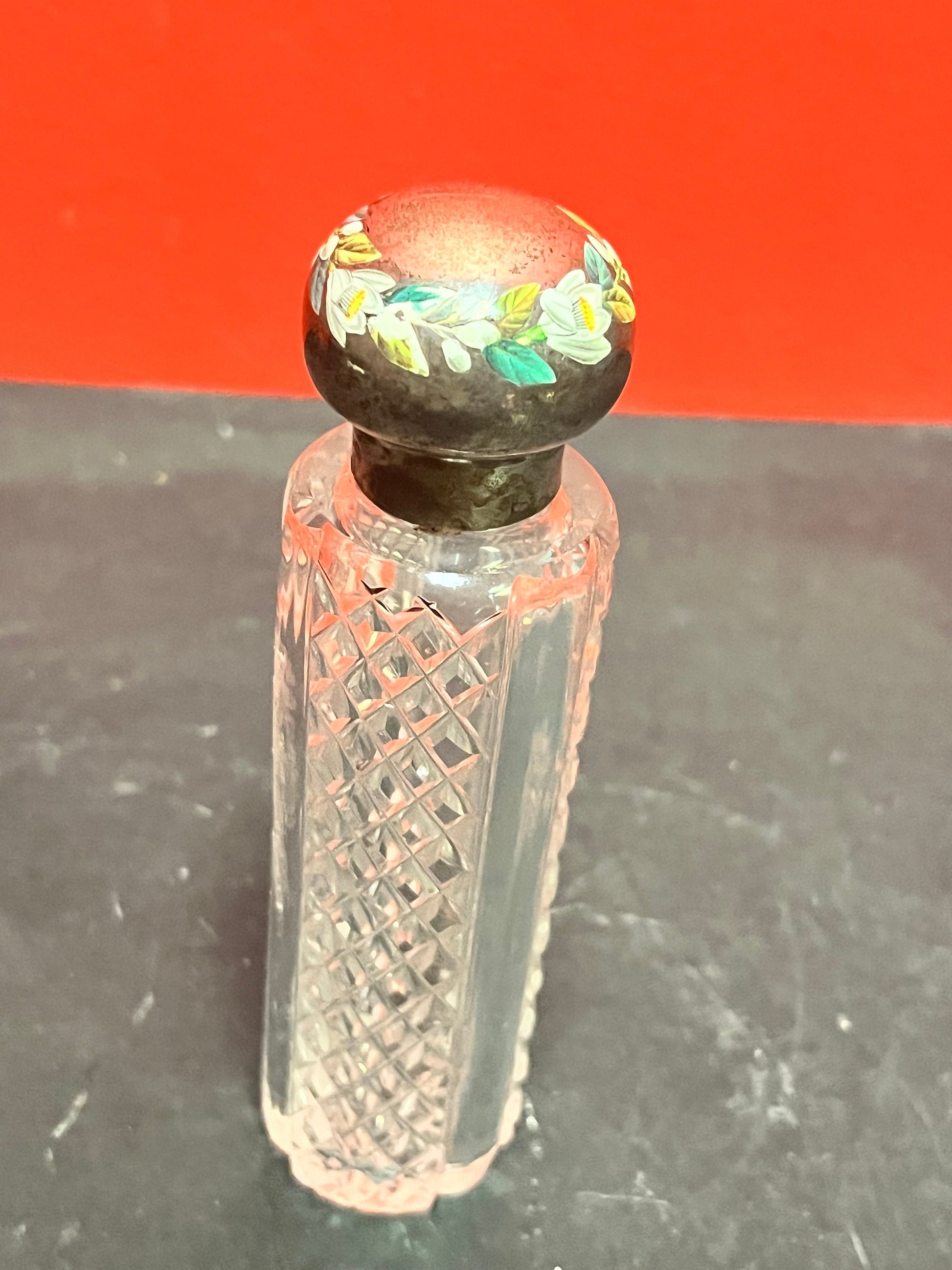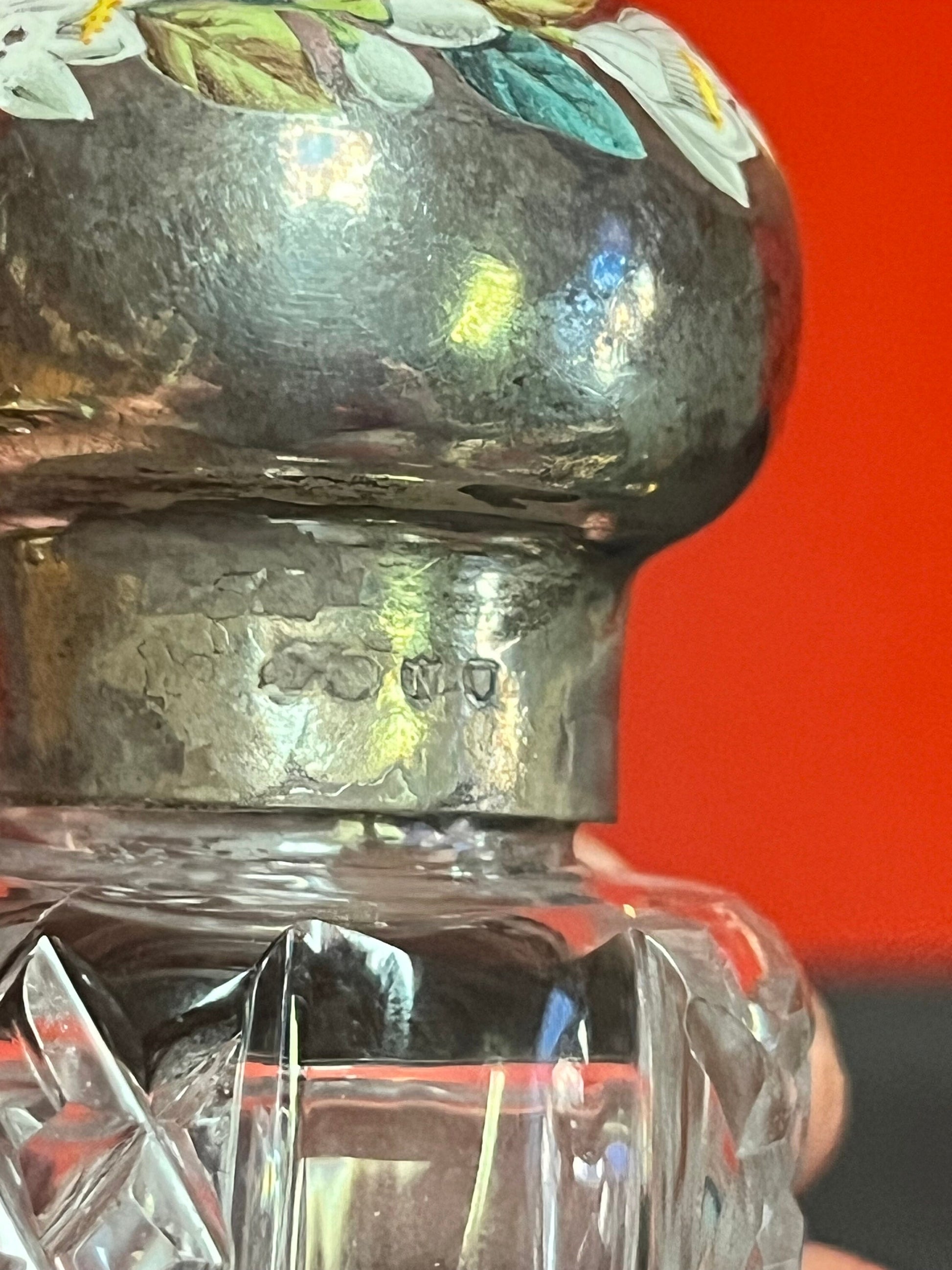 Beautiful 5 1/2 inch tall, antique crystal and silver top perfume bottle London 1888 nice enamelling on top great value