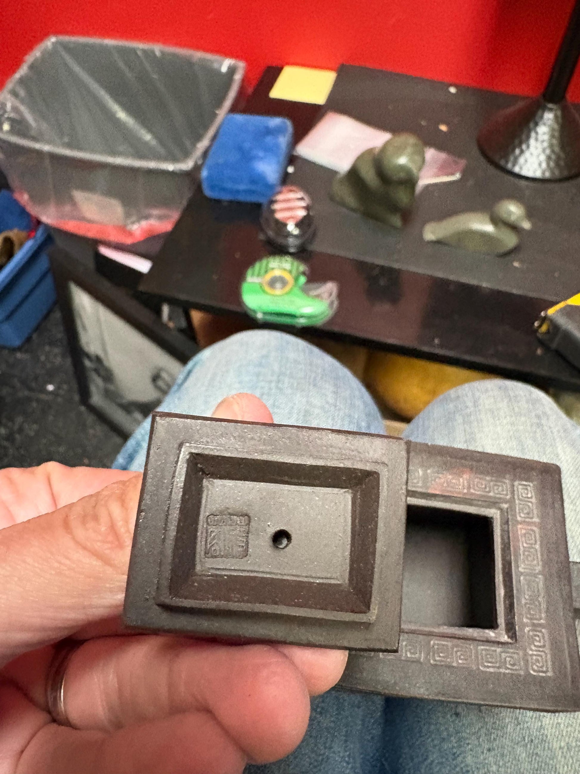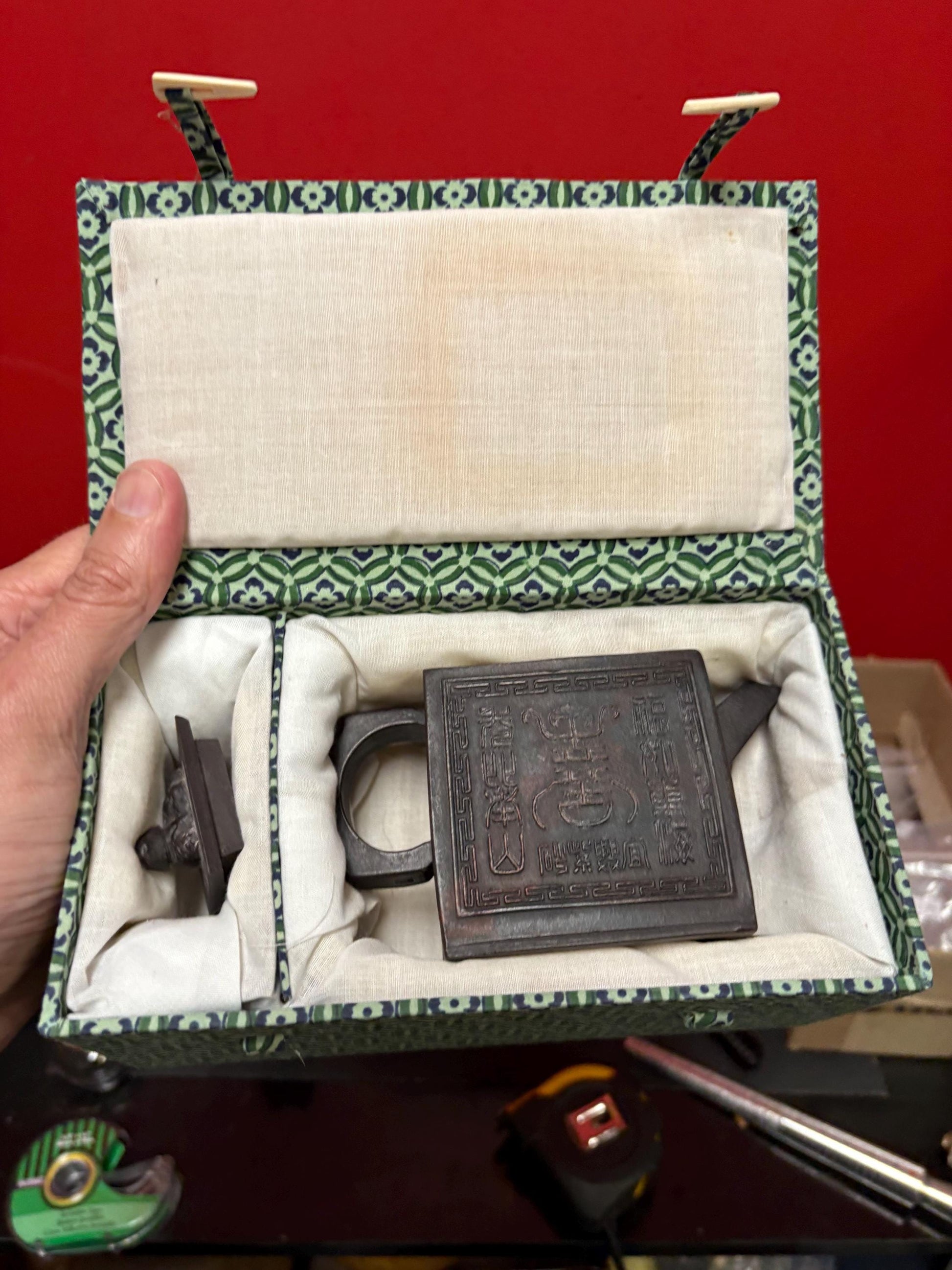 Beautiful 5 inch long by 3.5 high Chinese signed purple clay yixing teapot in perfect condition in box signed three times - B
