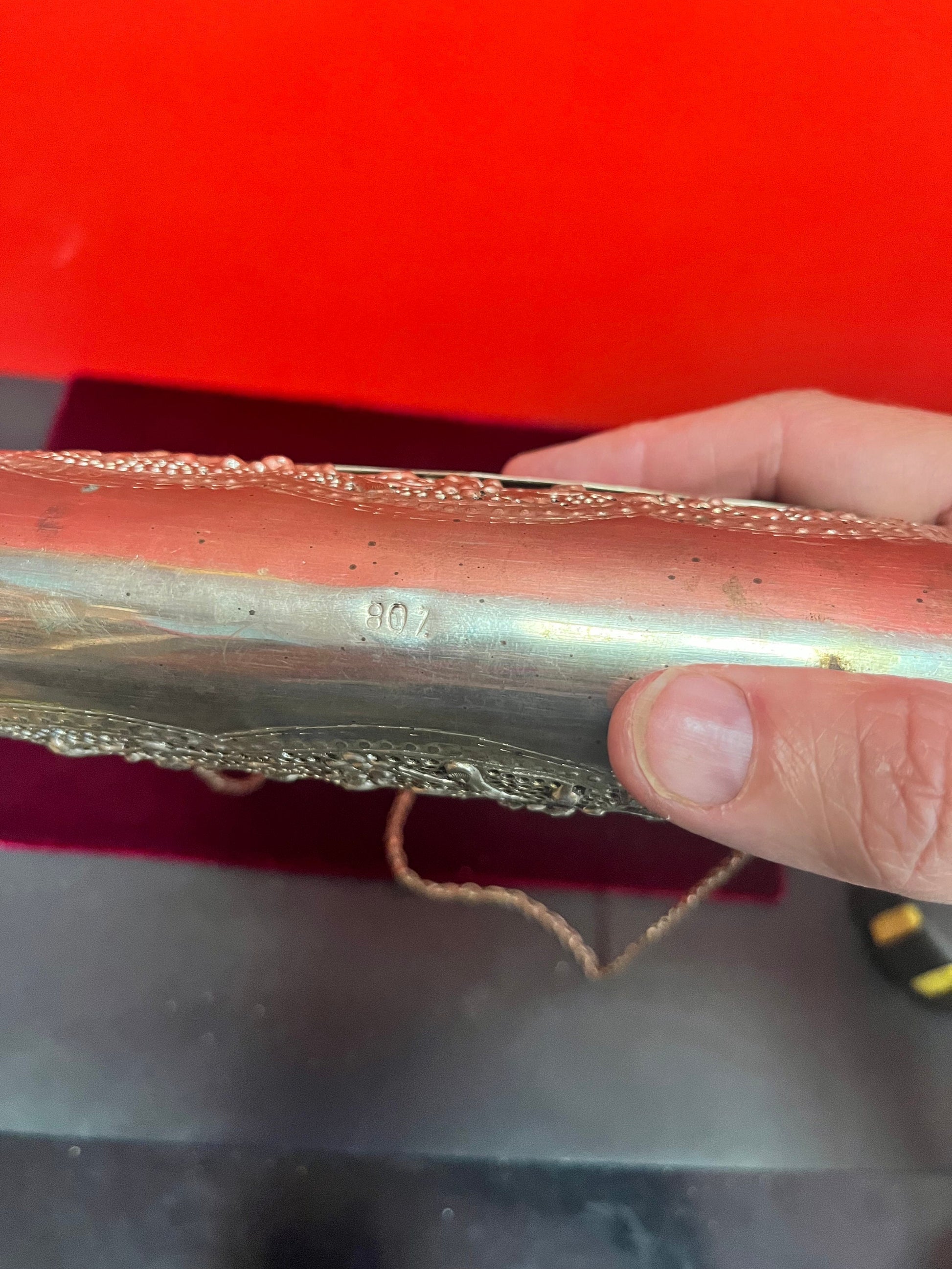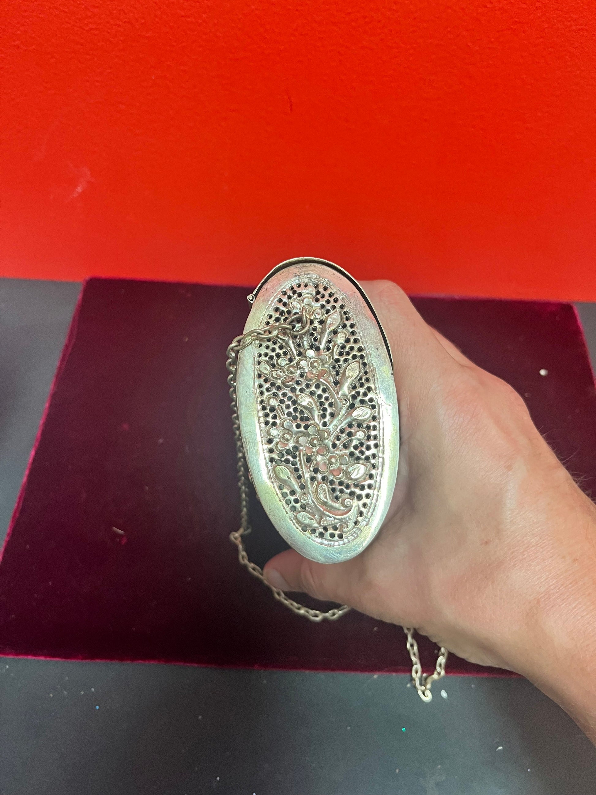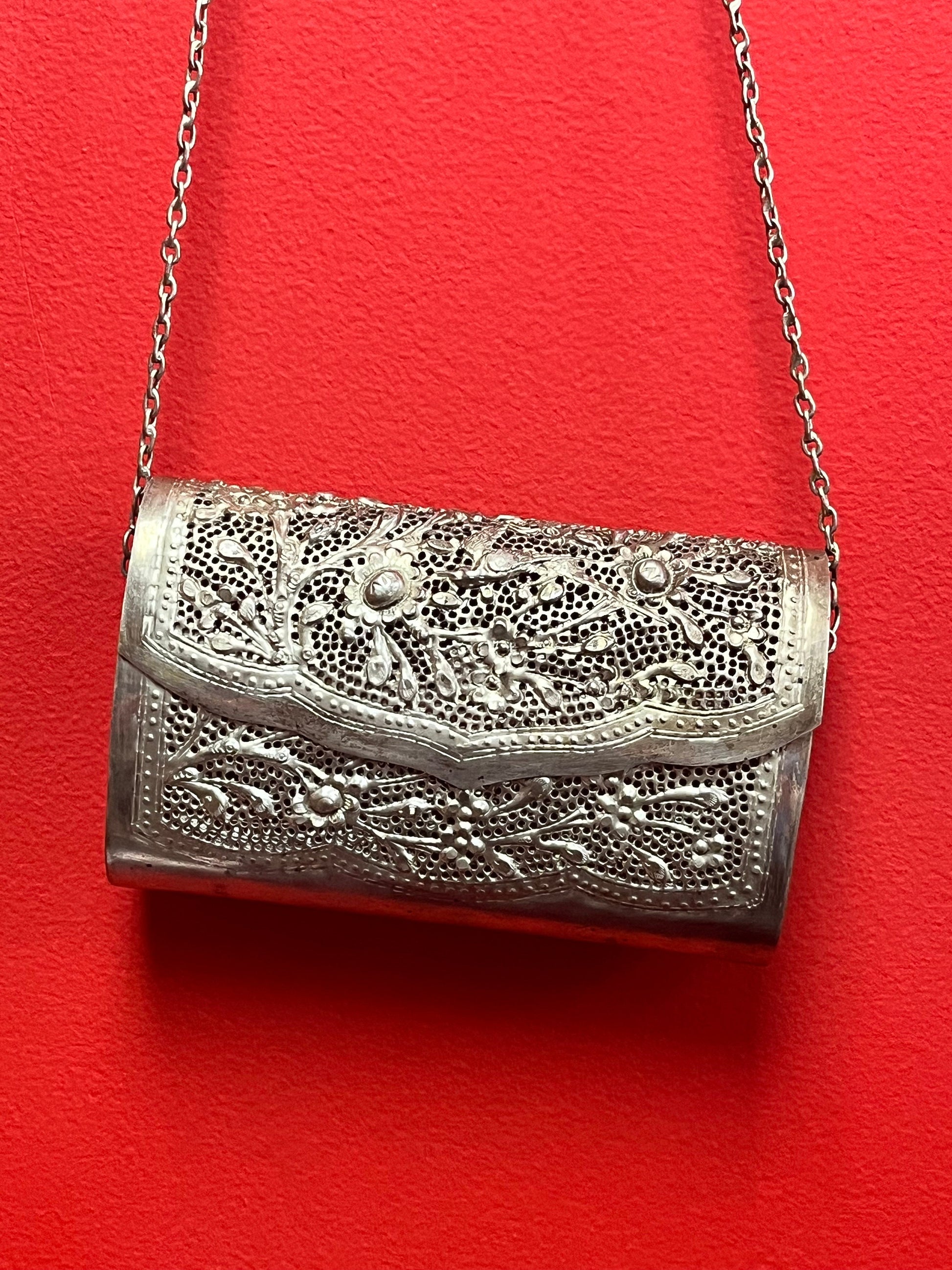 Beautiful 6 1/2 x 5 high silver filigree Cambodian Purse with chain unique piece
