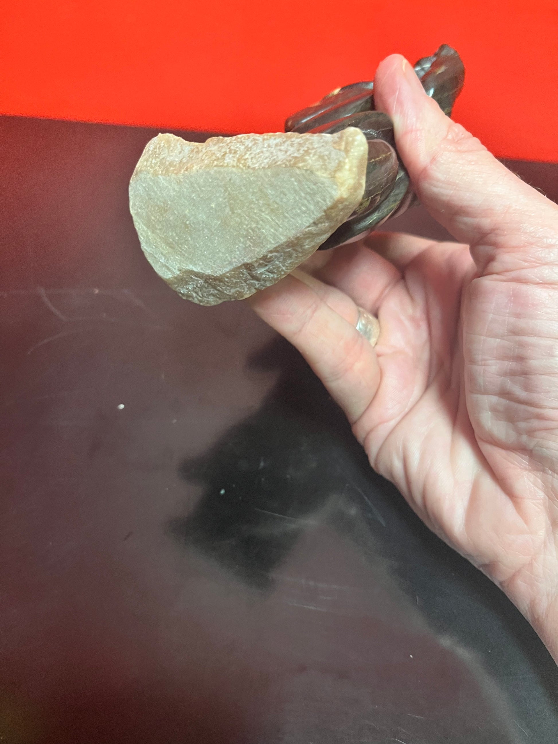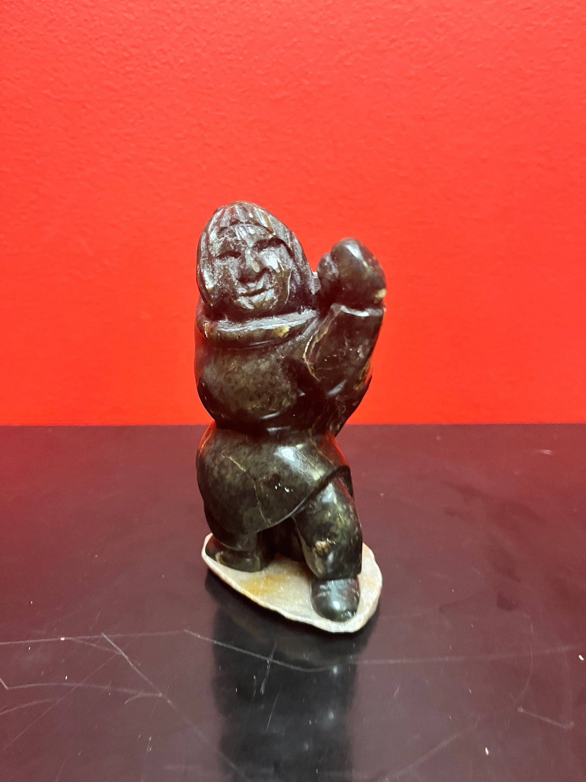 Beautiful 6 inch tall, vintage, indigenous, Inuit soap, stone statue of a hunter carrying child on Stone base delicious piece