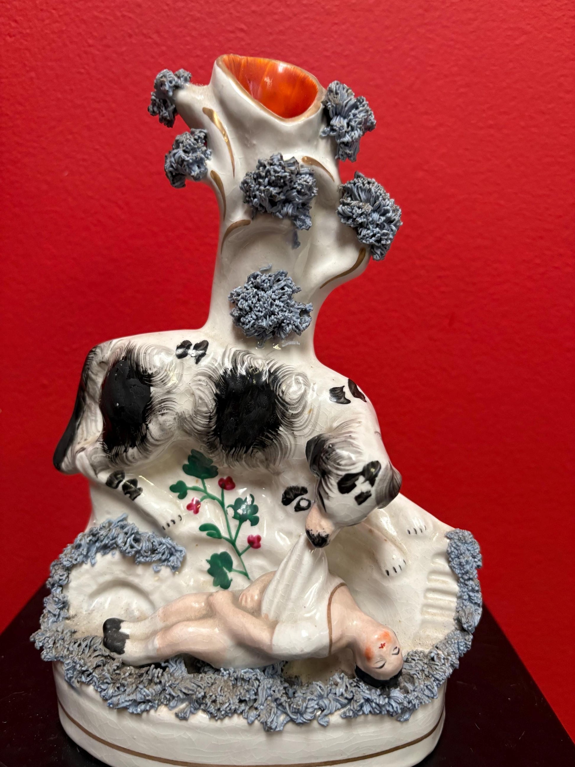 Beautiful 8 inch Staffordshire statue of a child and dog good condition unusual imagery mid 19 century -B