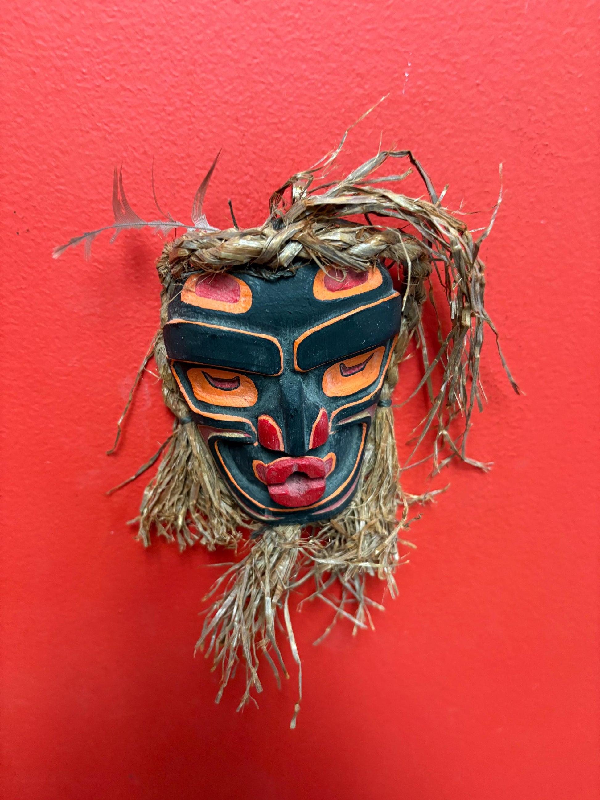 Beautiful 8 x 4 wide with cedar hair indigenous first nations pacific West Coast signed mask wow great colours