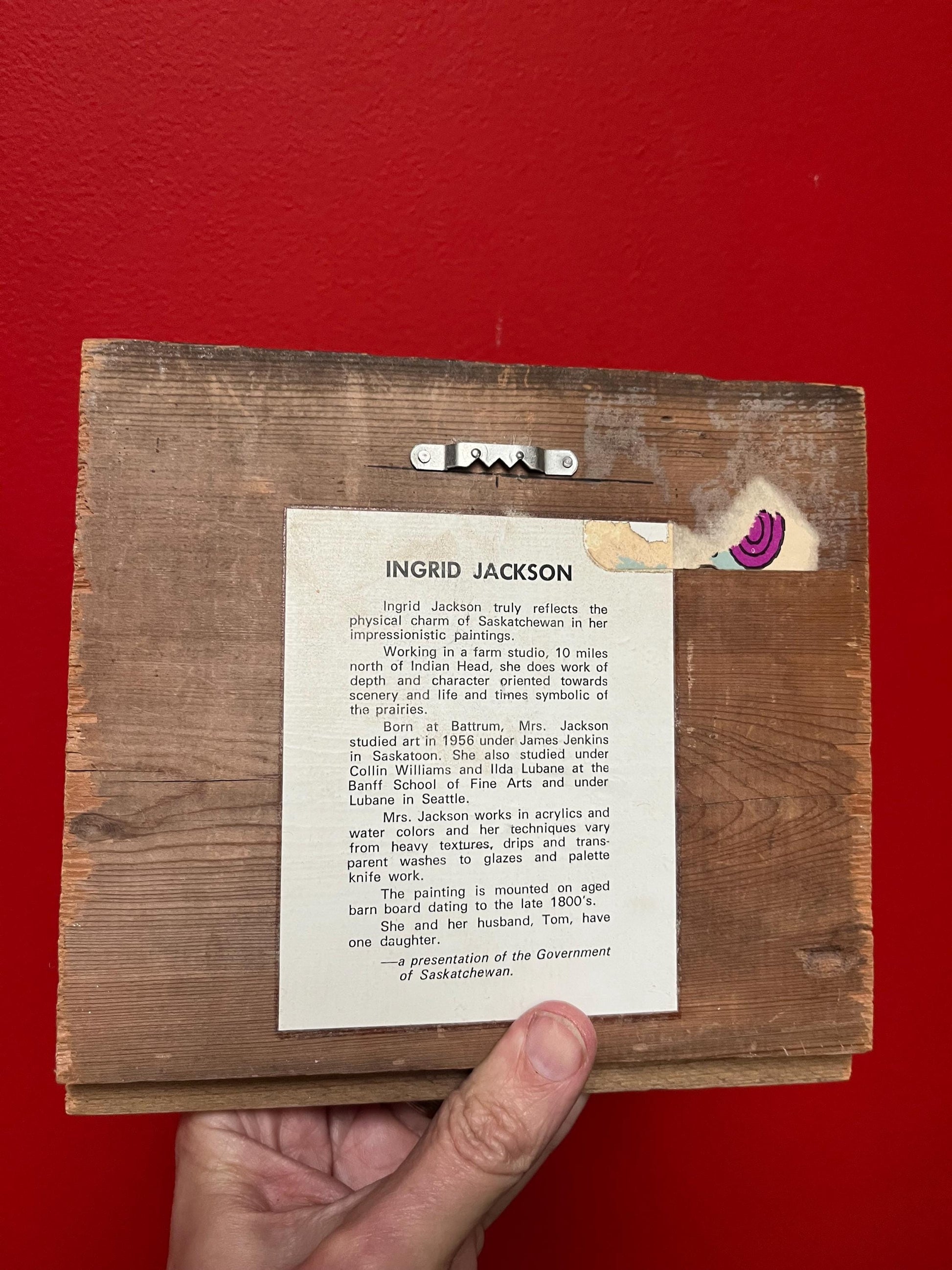 Beautiful 8 x 8 original painting by Saskatchewan artist Ingrid Jackson farm scene on Barn wood info on back great gift