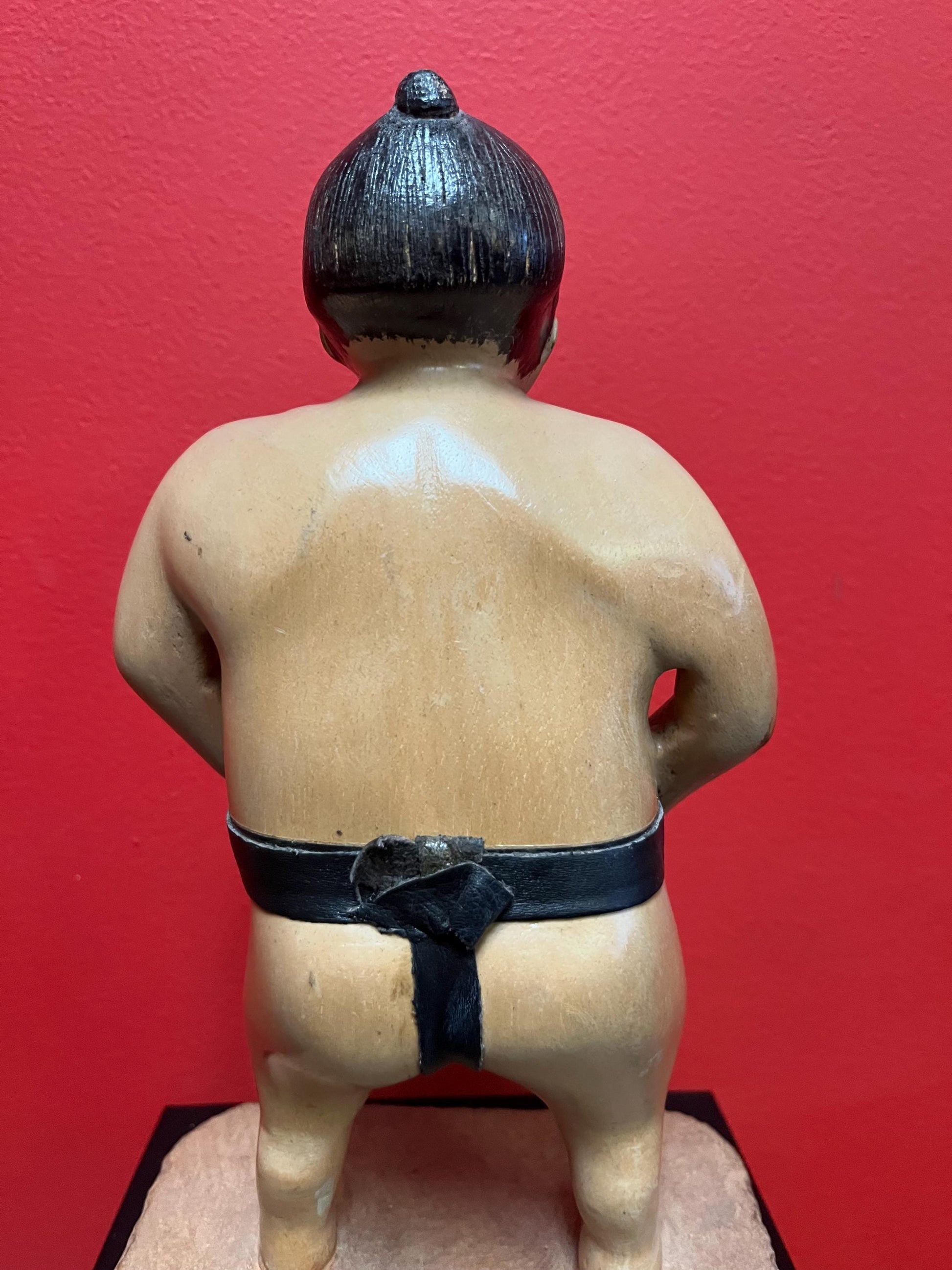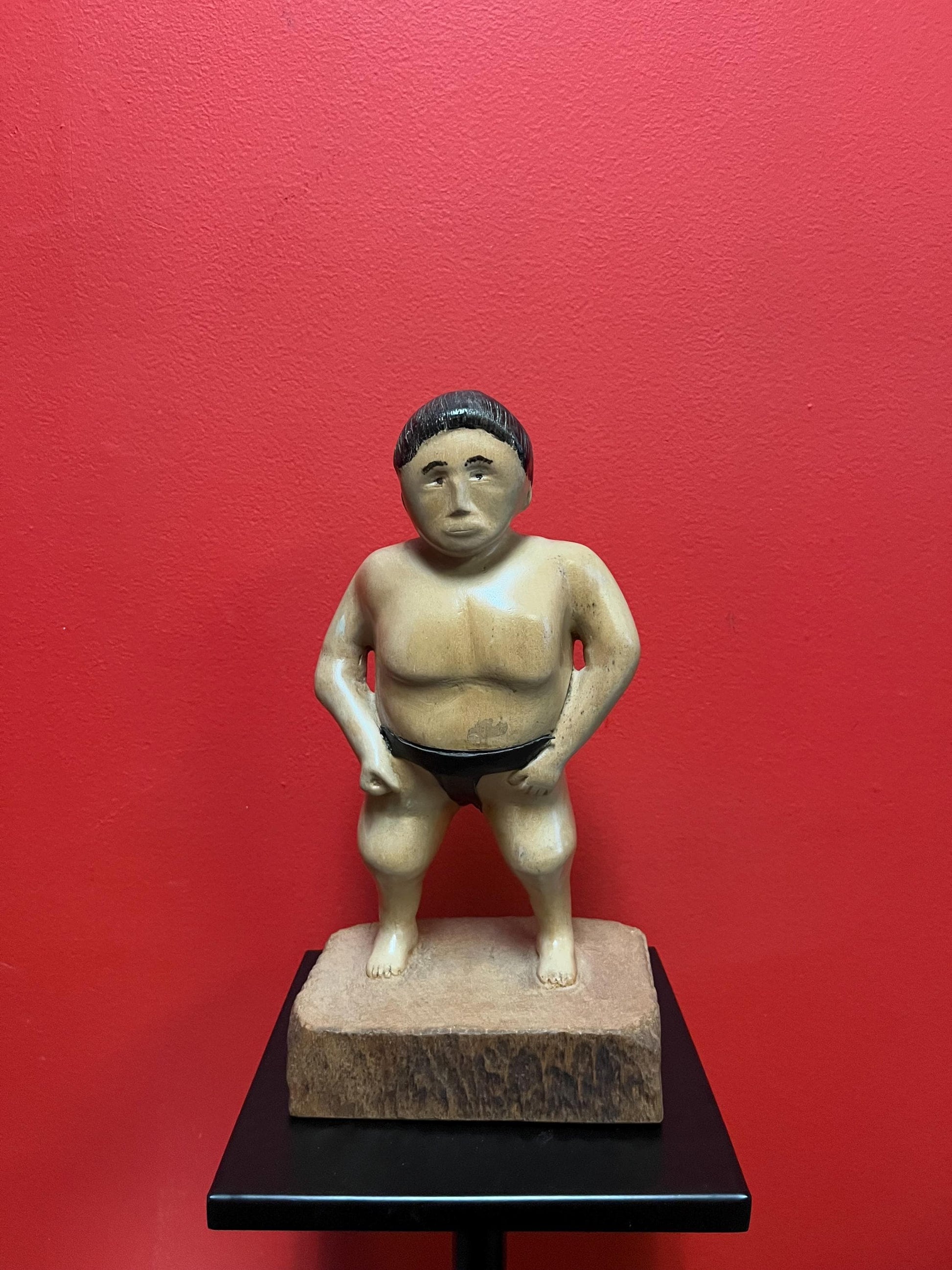 Beautiful antique Japanese FOLK ART wooden and leather sumo wrestler statue 11 inches tall amazing patina Japanese antique