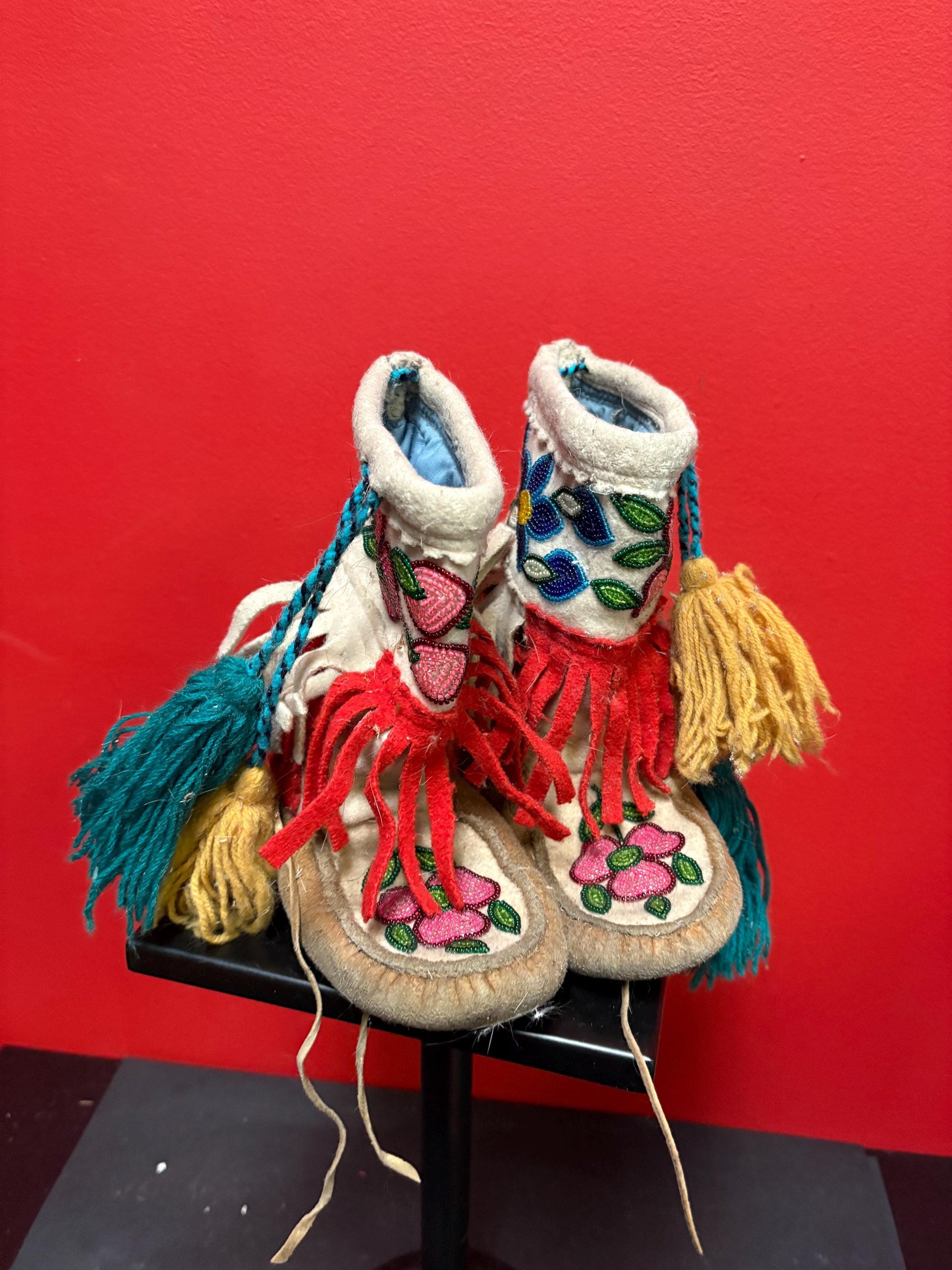 Beautiful first nation Pacific Northwest coast fabric and leather and beaded moccasin boots good antique condition 7 x 8 inches high-