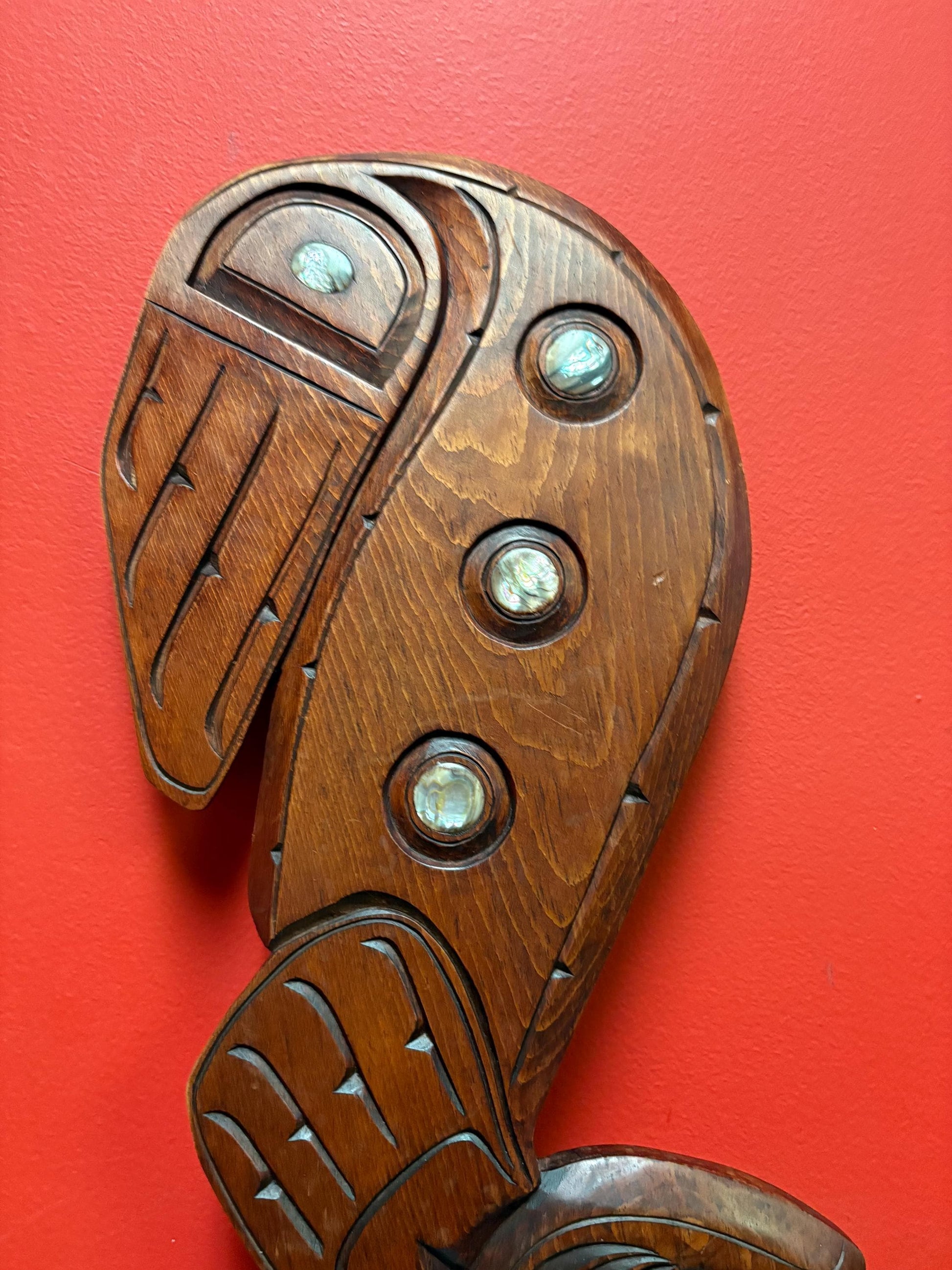 Beautiful indigenous first nation pacific north West Coast Sampson Robertson 20 x 9 inch plaque heron and seal with abalone needs hanger - wow