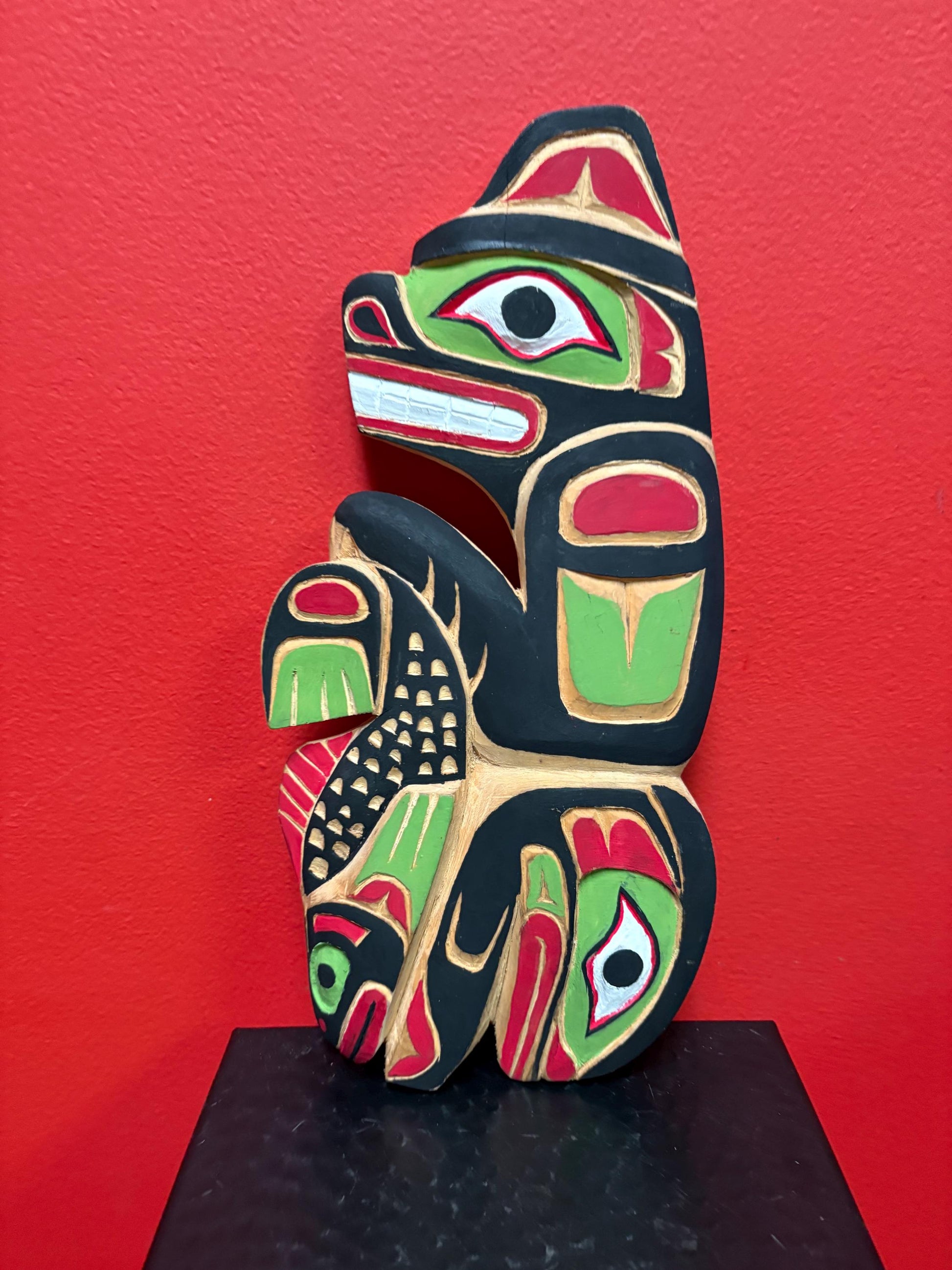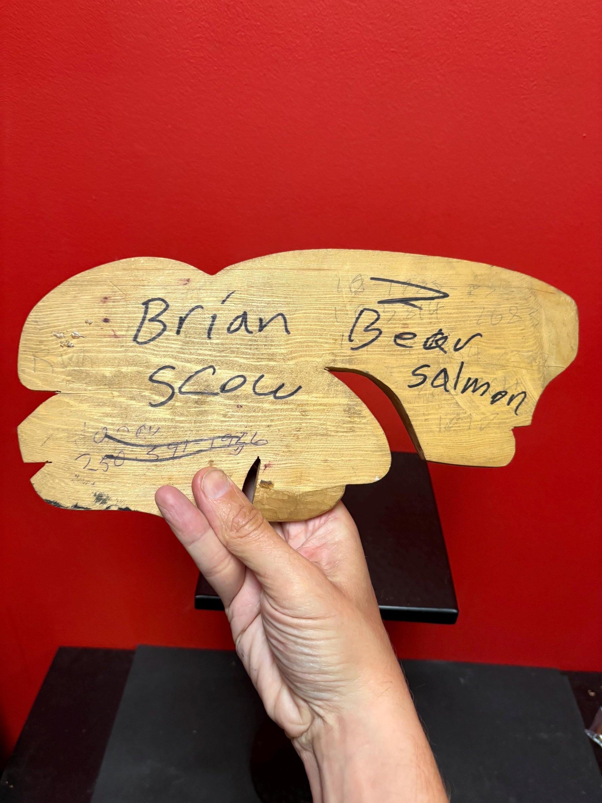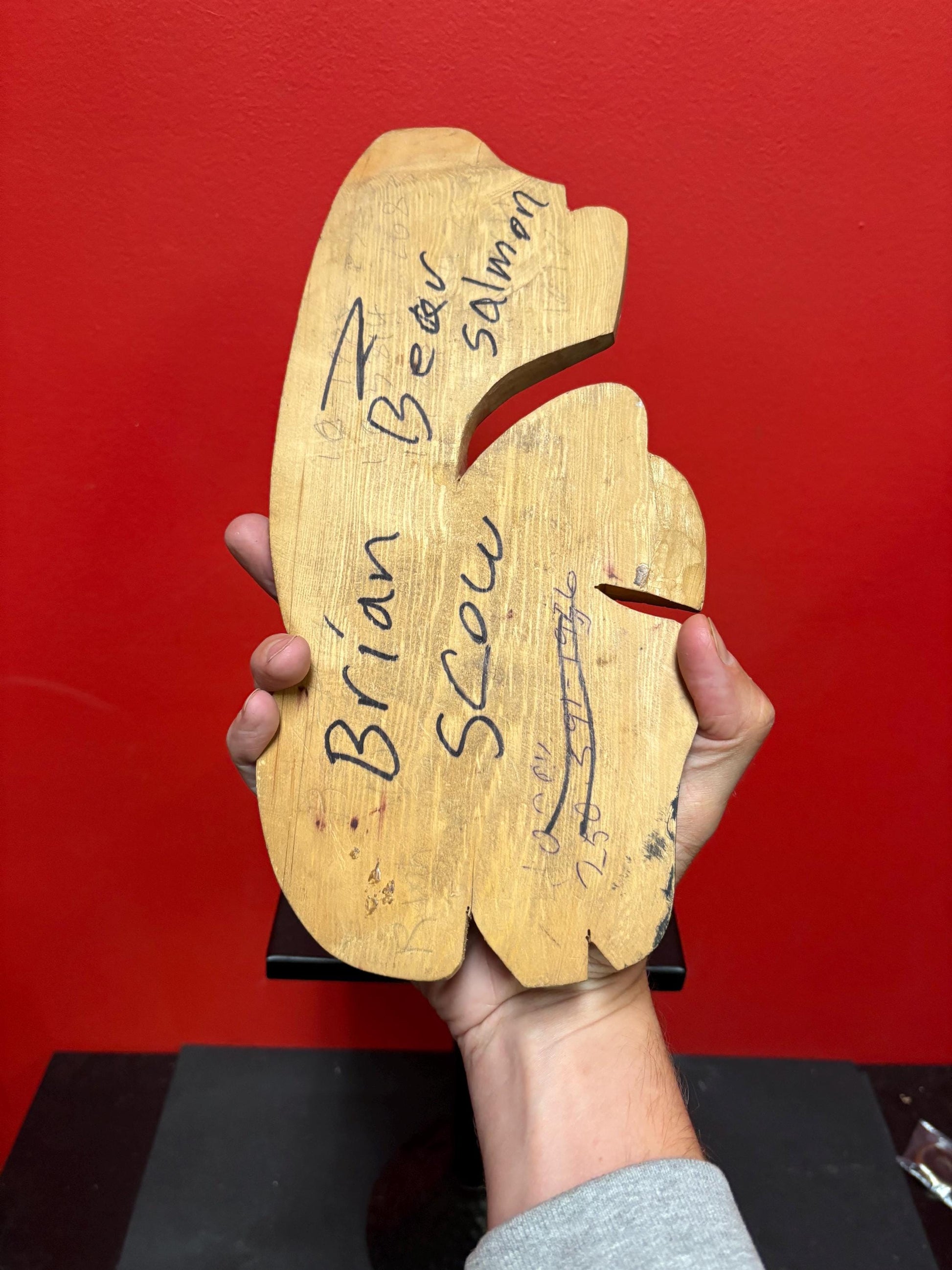 Beautiful indigenous first nations Pacific Northwest Coast 12 x 6” wide bear salmon plaque by Brian SCOW — needs a hanger — good value