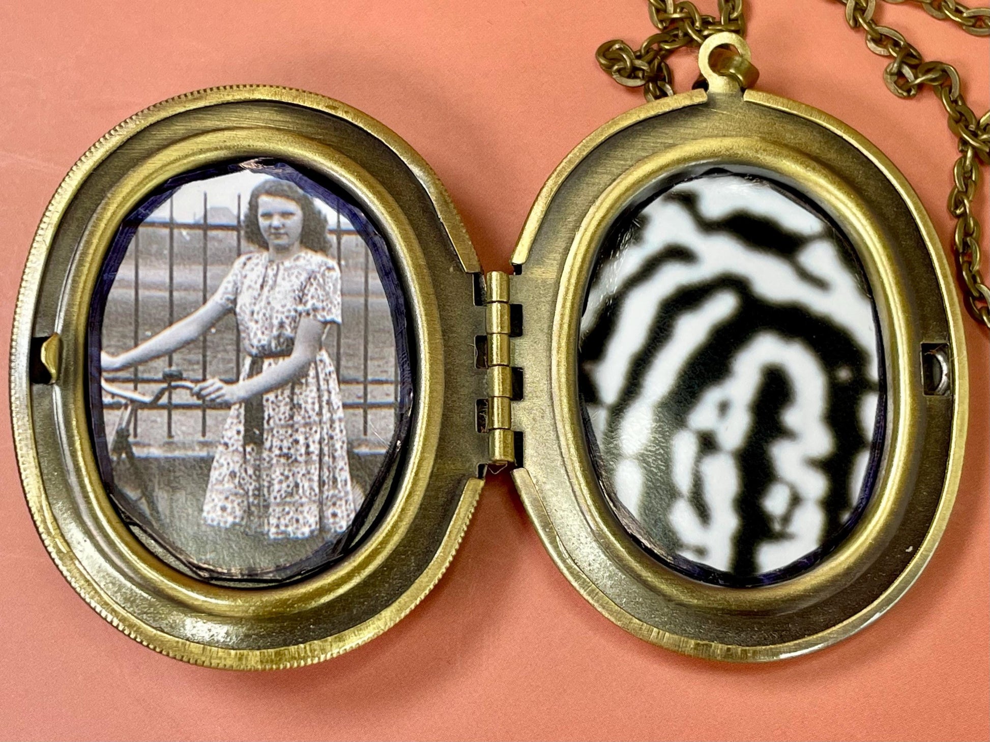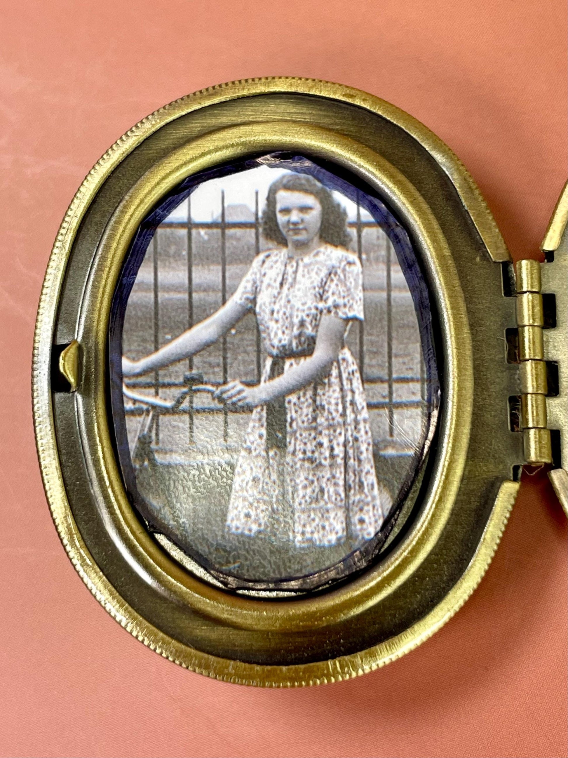 Inside the locket is a vintage photograph of a young lady with her bicycle. Great condition.
