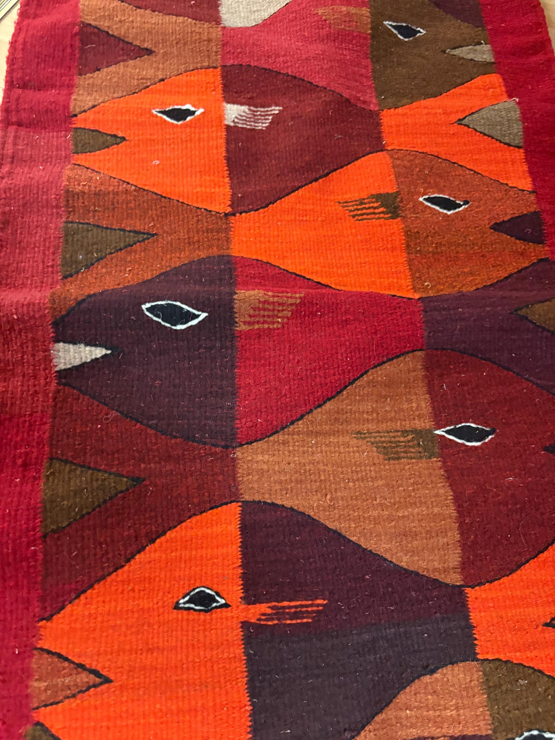 Beautiful vintage Zapotec Oaxacan fringed wool textile — ready to hang or lay down in great condition - MCM beauty — approximately 48 x 24 inches