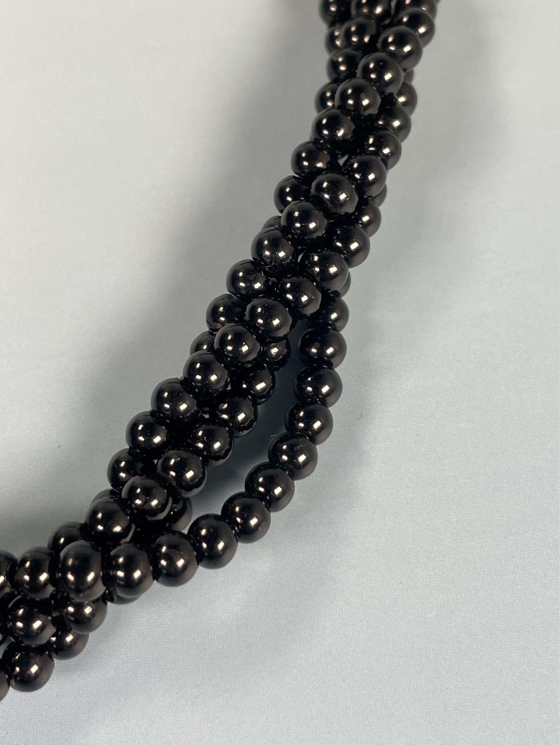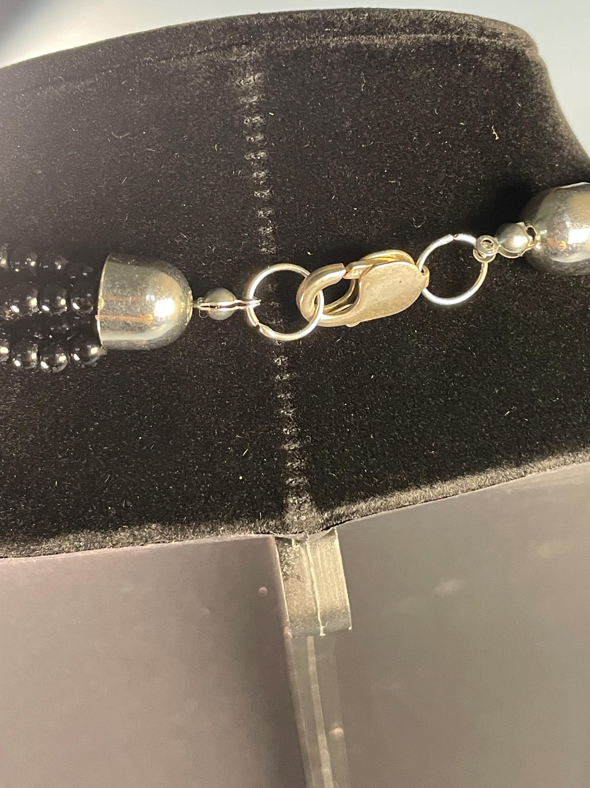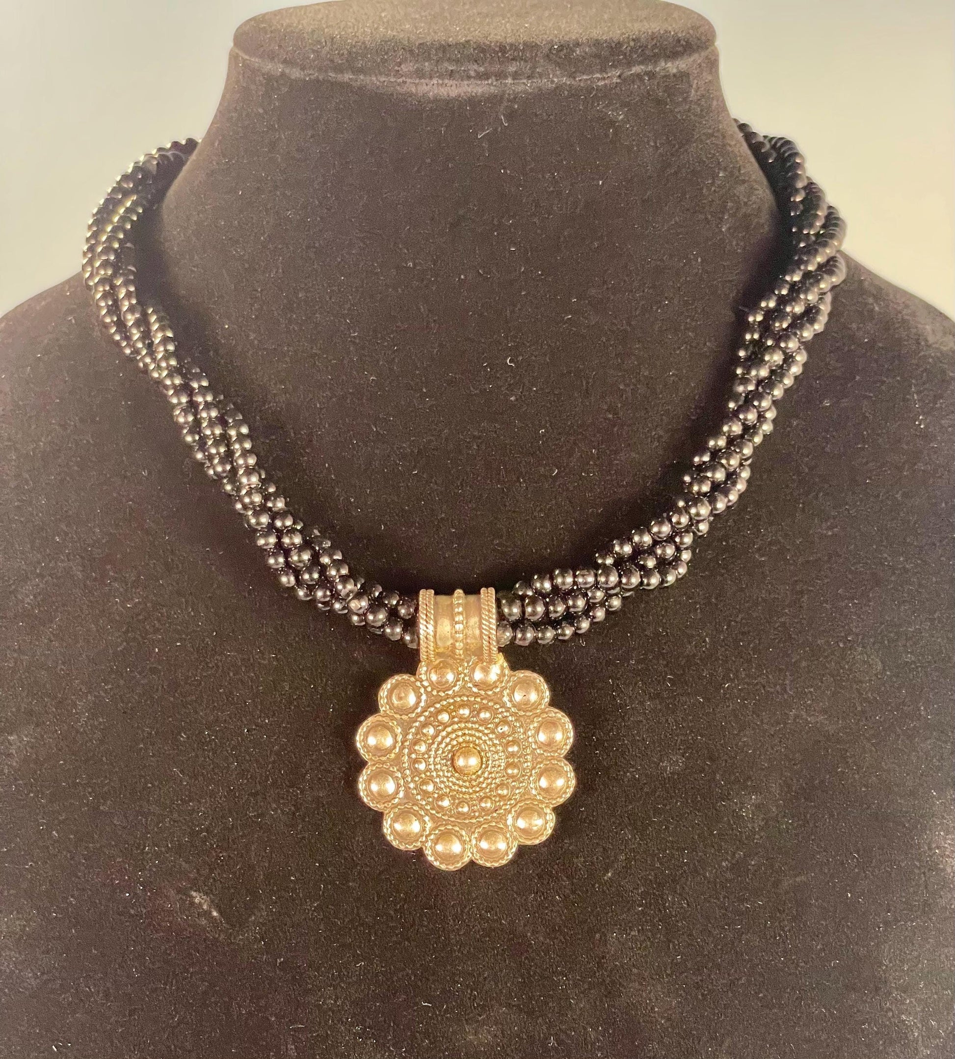 Make a bold statement with this striking black beaded necklace featuring a textured metal pendant. Elegant and unique, its the perfect accessory to elevate any look. 18 inch necklace with 1.5 inch pendant.
