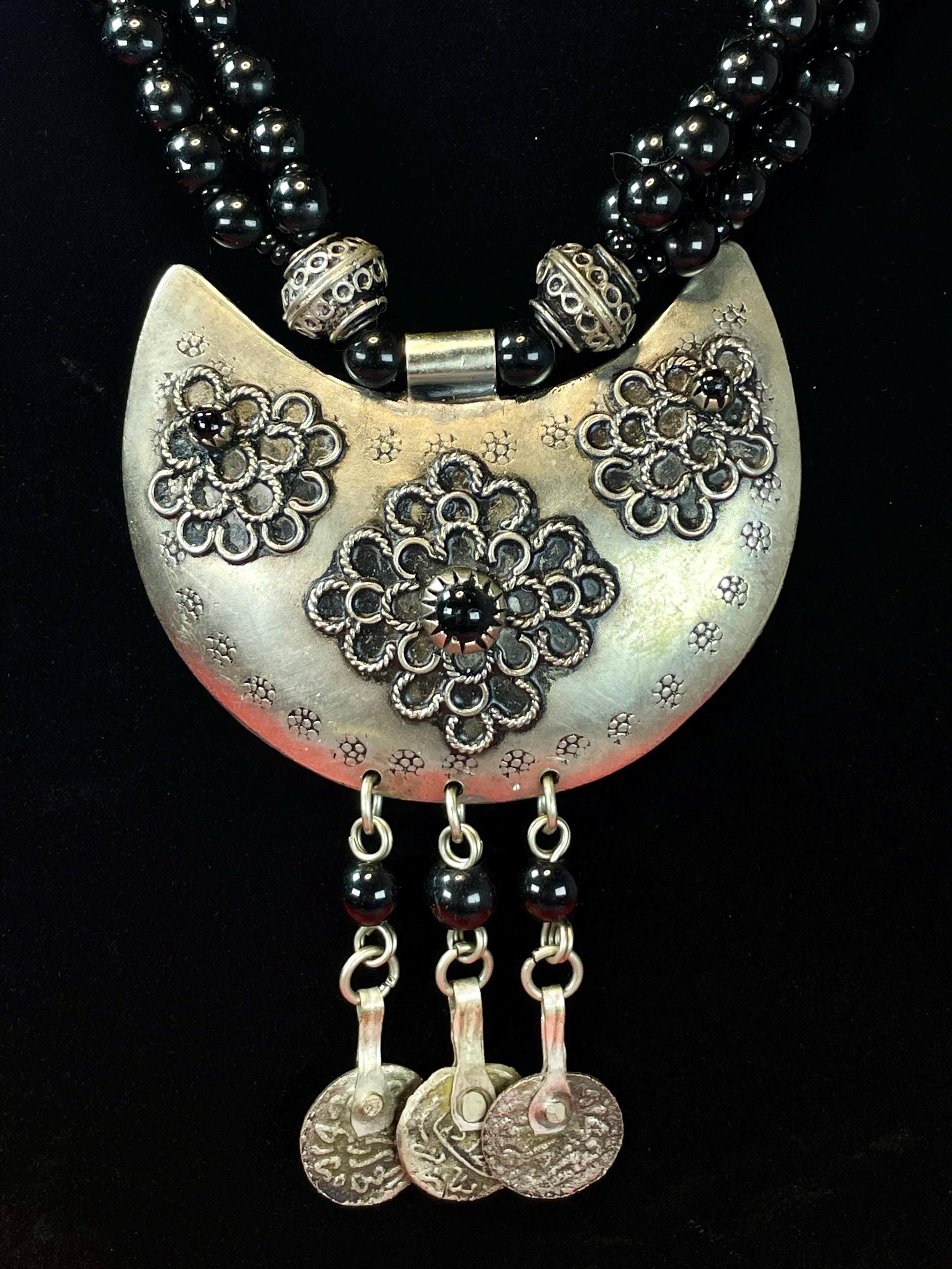 Bold bohemian statement necklace featuring two strands of glossy black beads with ornate silver accents. The large crescent-shaped silver pendant is adorned with intricate floral engravings and three dangling coin charms for added movement. Perfect for adding a dramatic touch to any outfit.