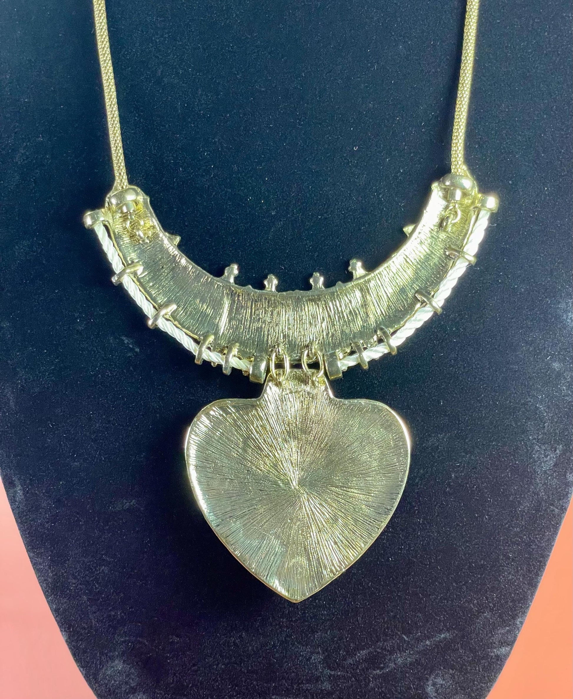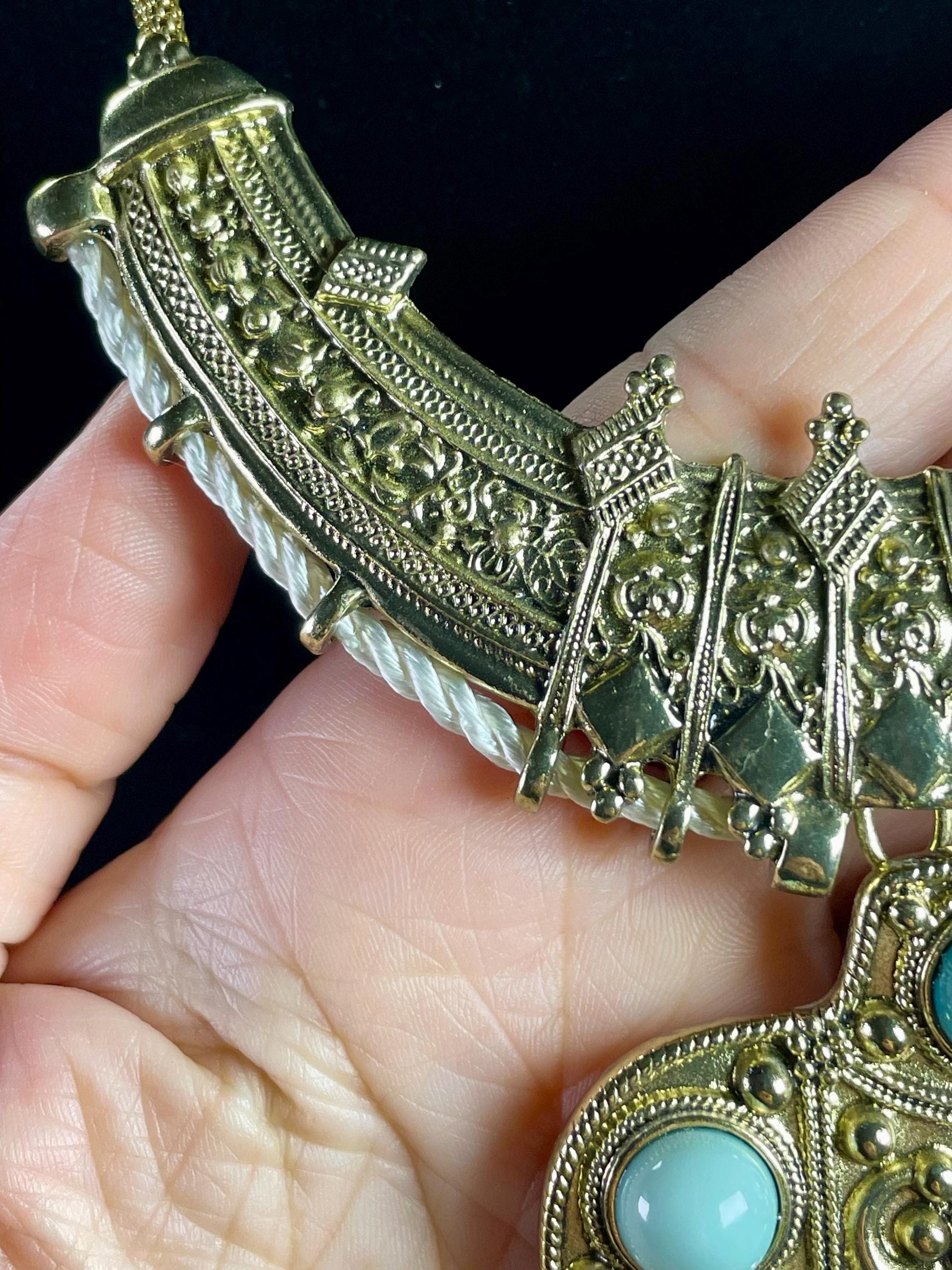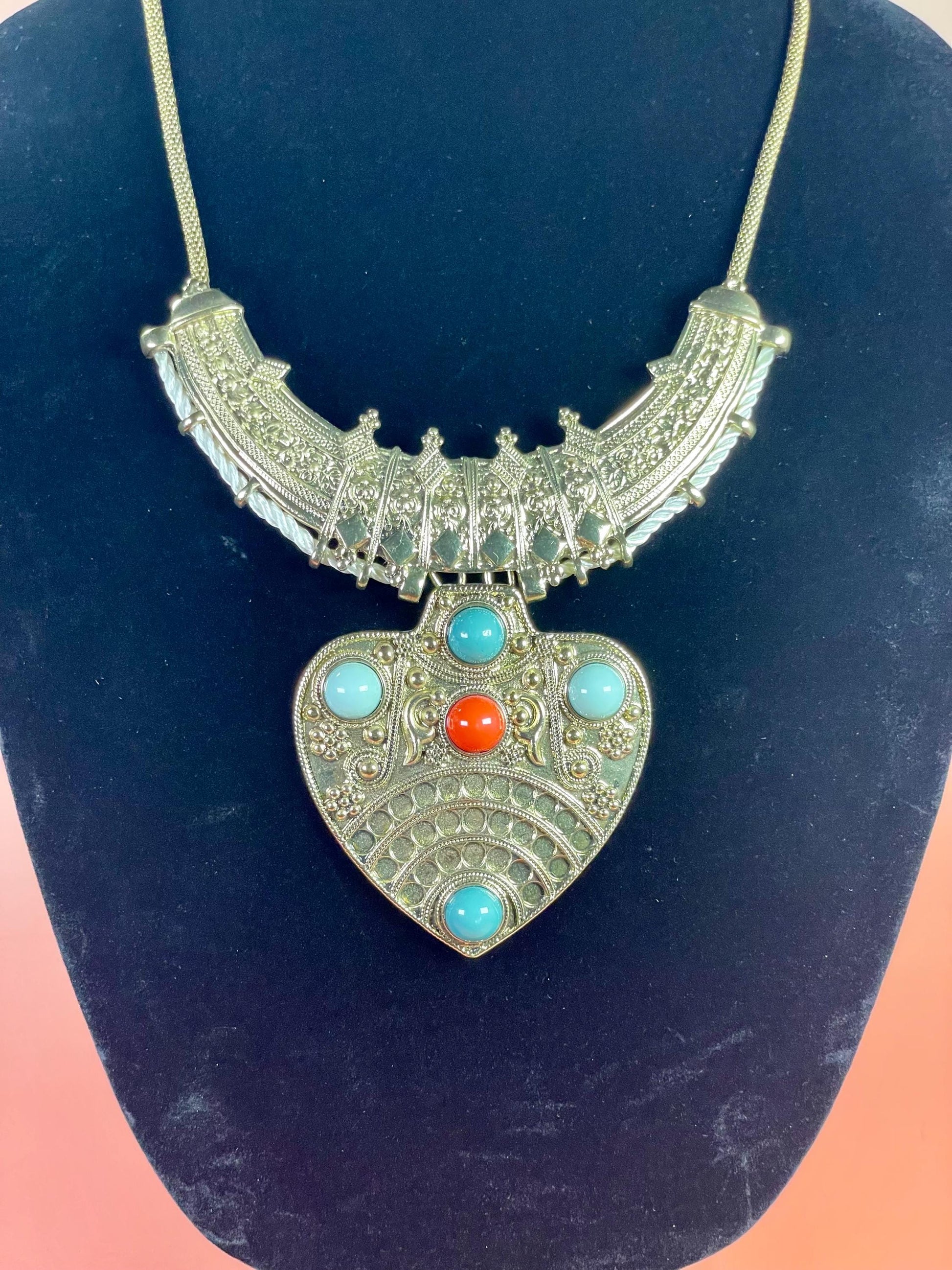 This statement necklace features intricate metalwork with turquoise and coral coloured accents. Bold and stylish, its a perfect standout piece.