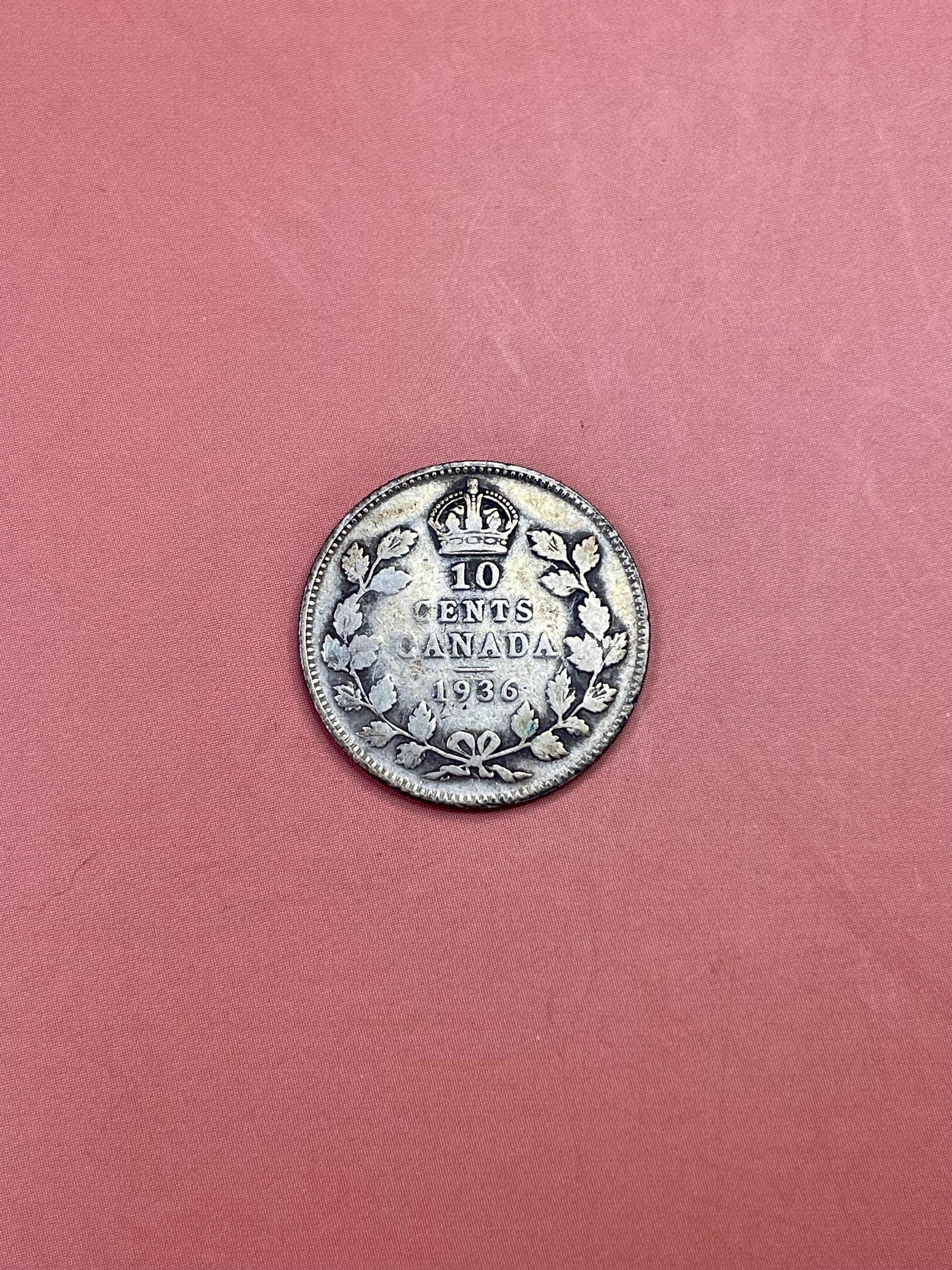 Ten cent Canadian coin from 1936. Approximately .75 inch