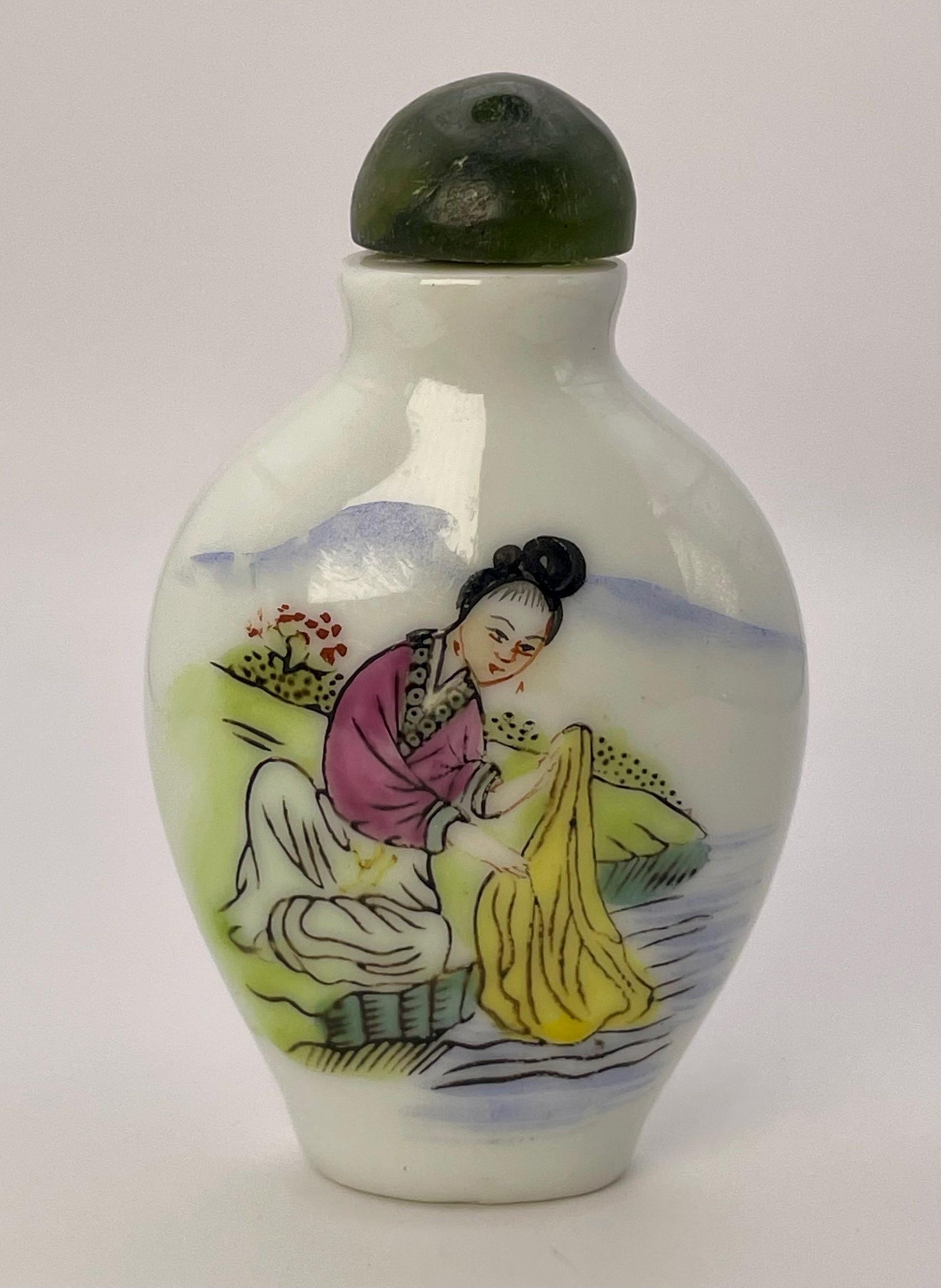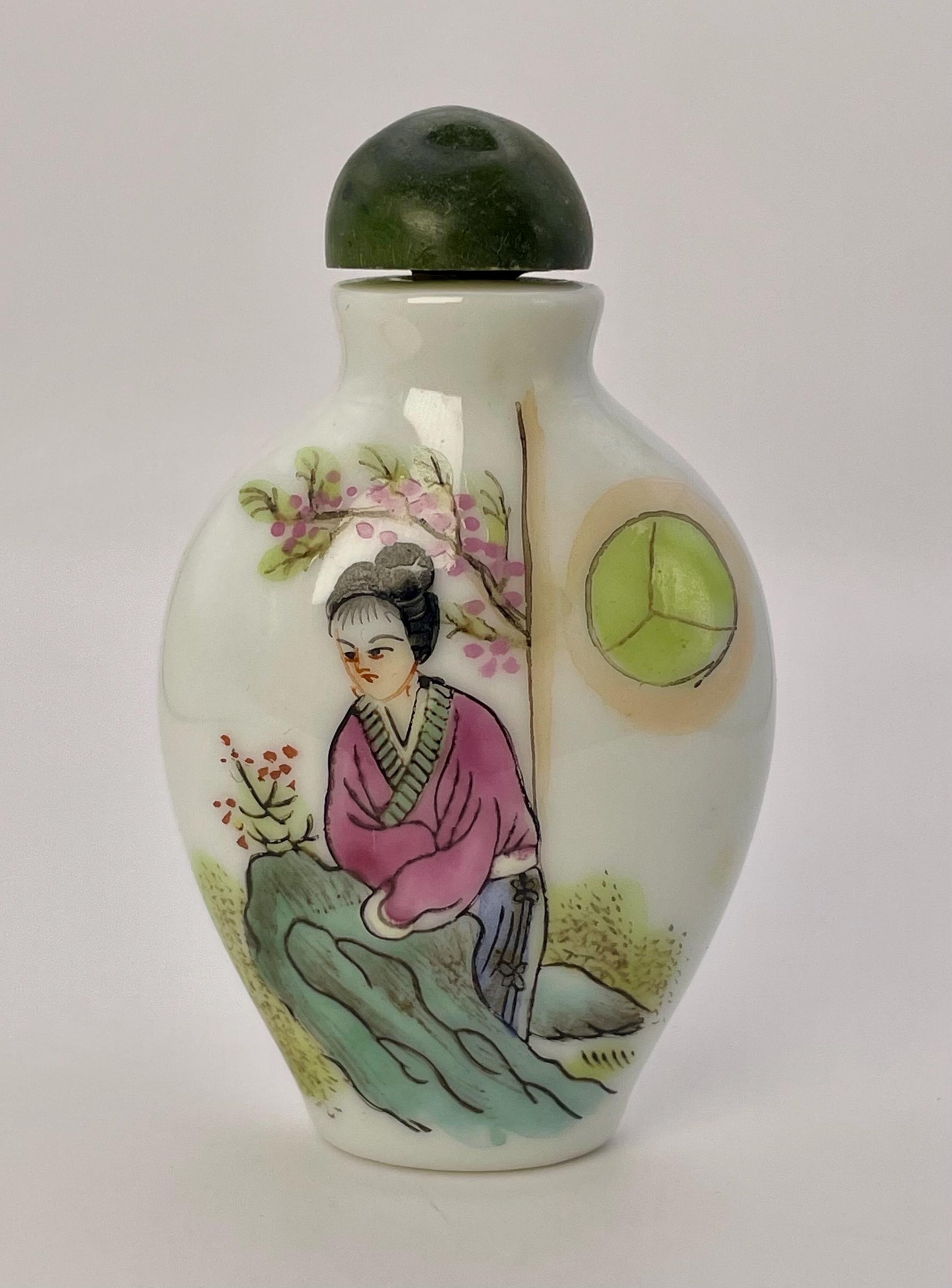 Chinese handpainted porcelain snuff bottle with jade top – signed