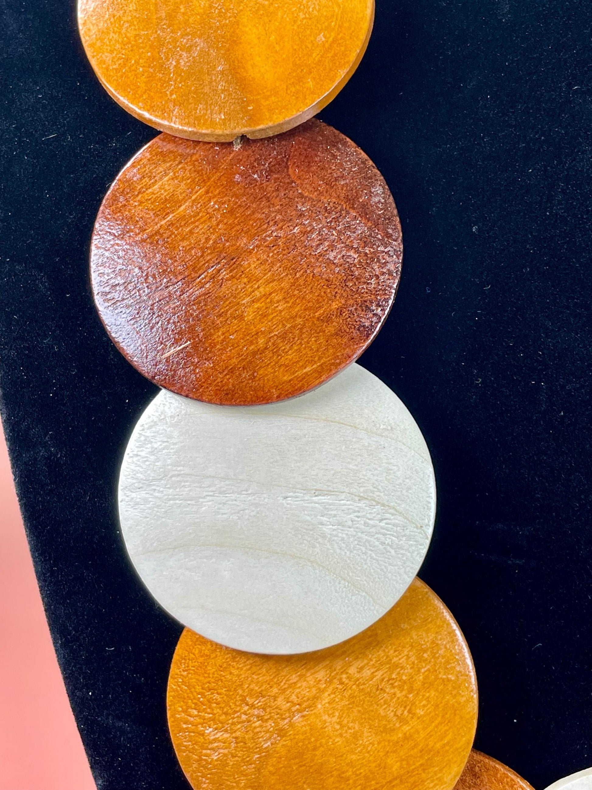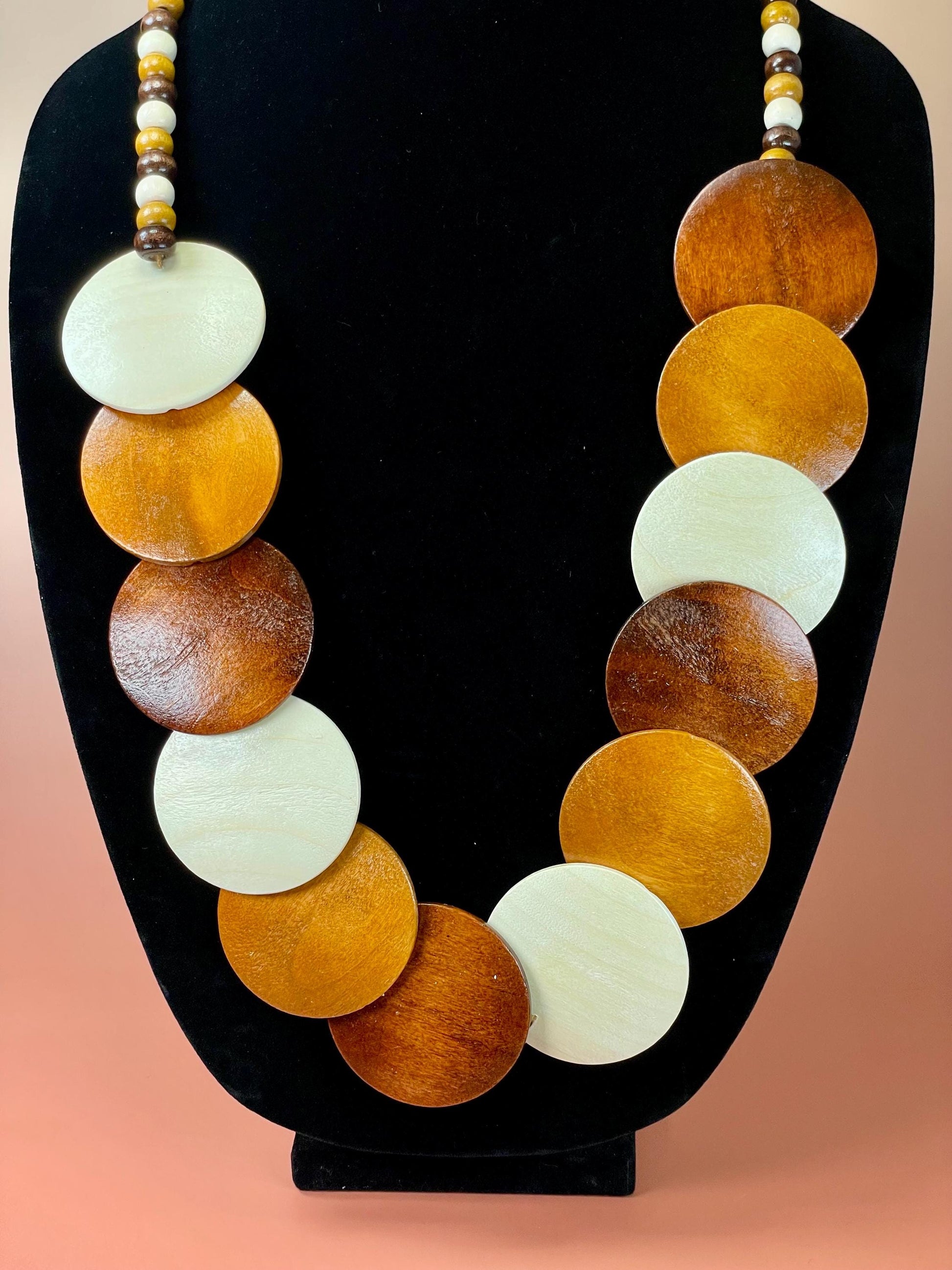 Cool 30 inch long beaded necklace. Interesting flat wooden beads.