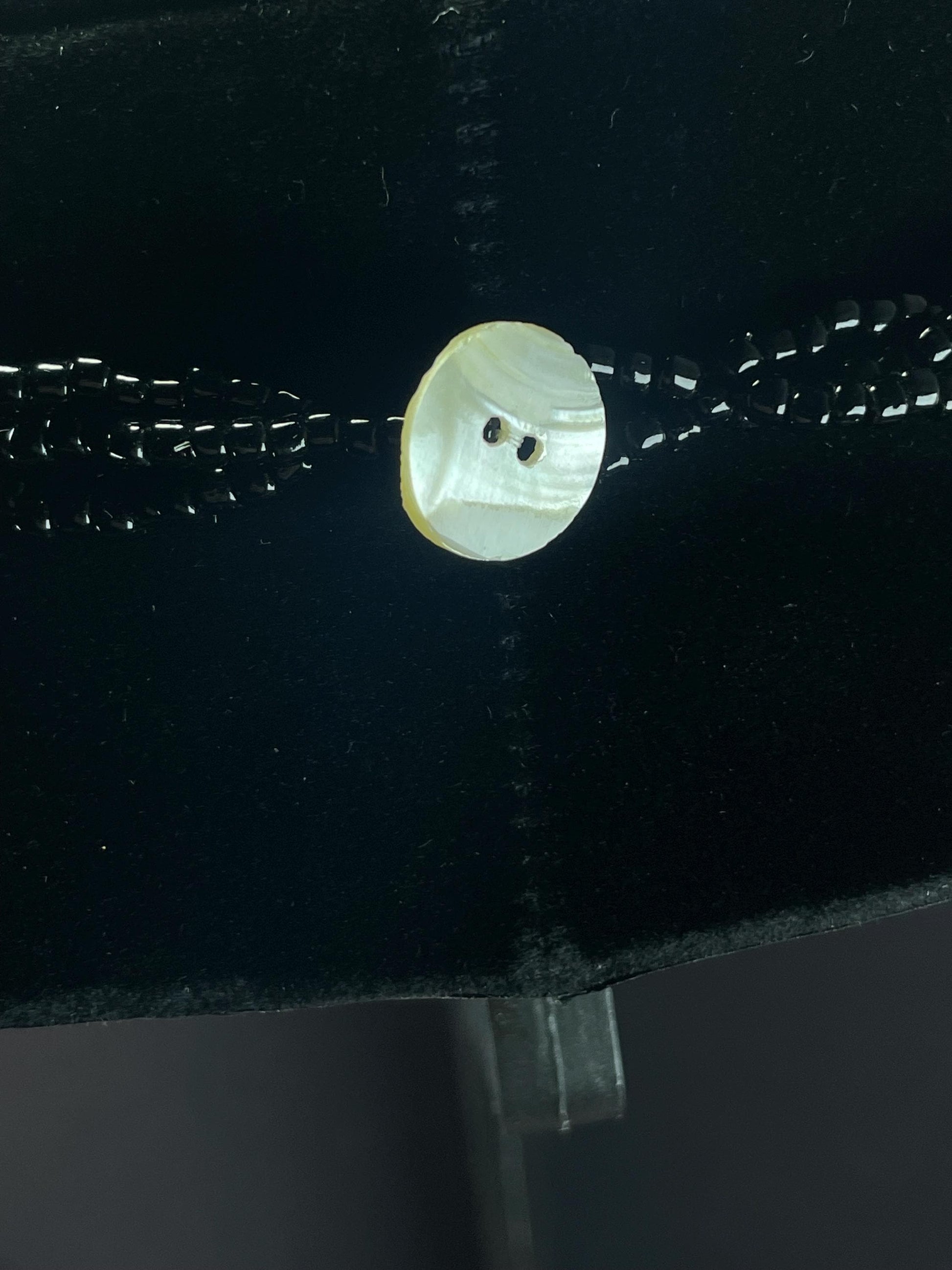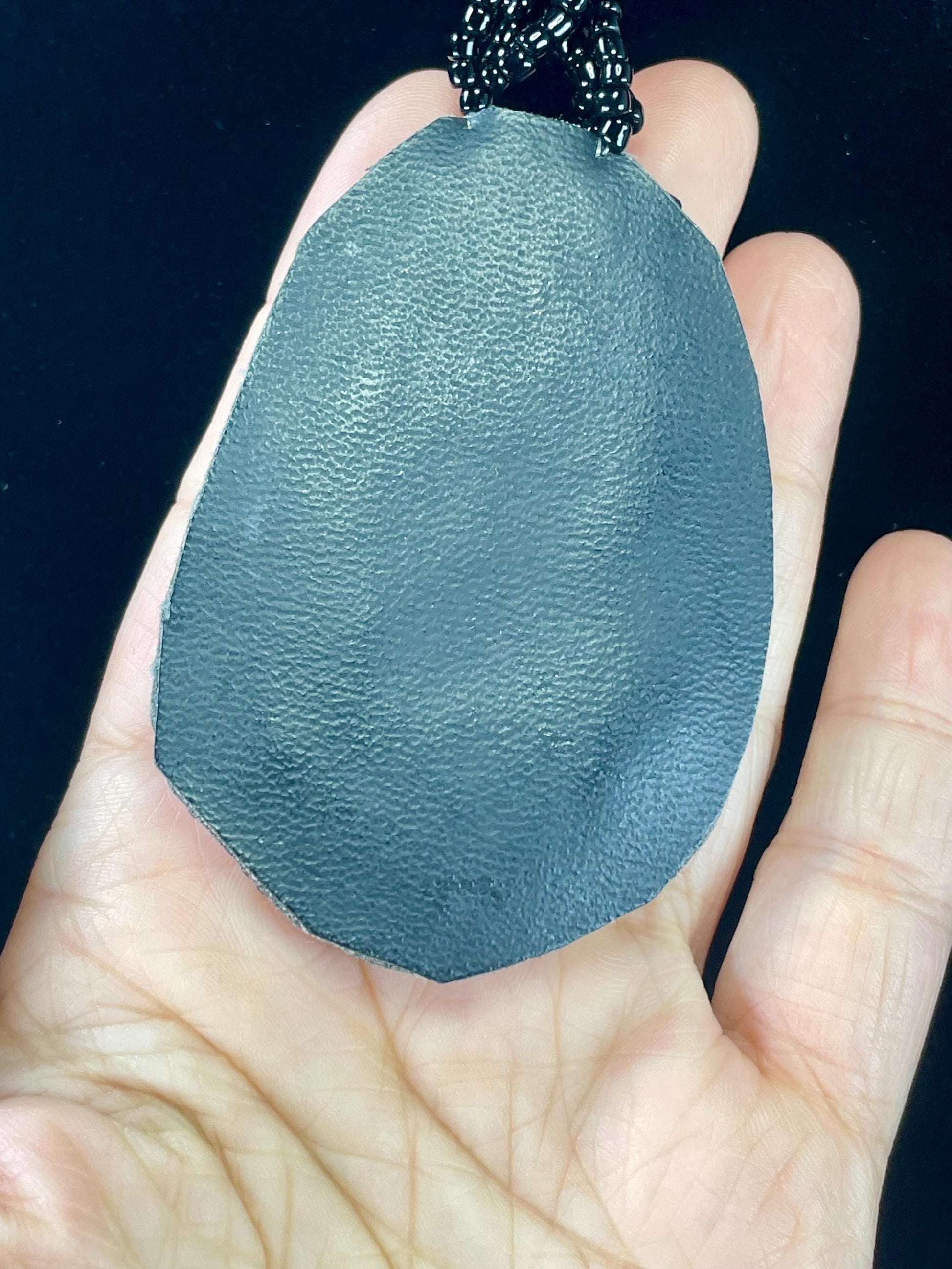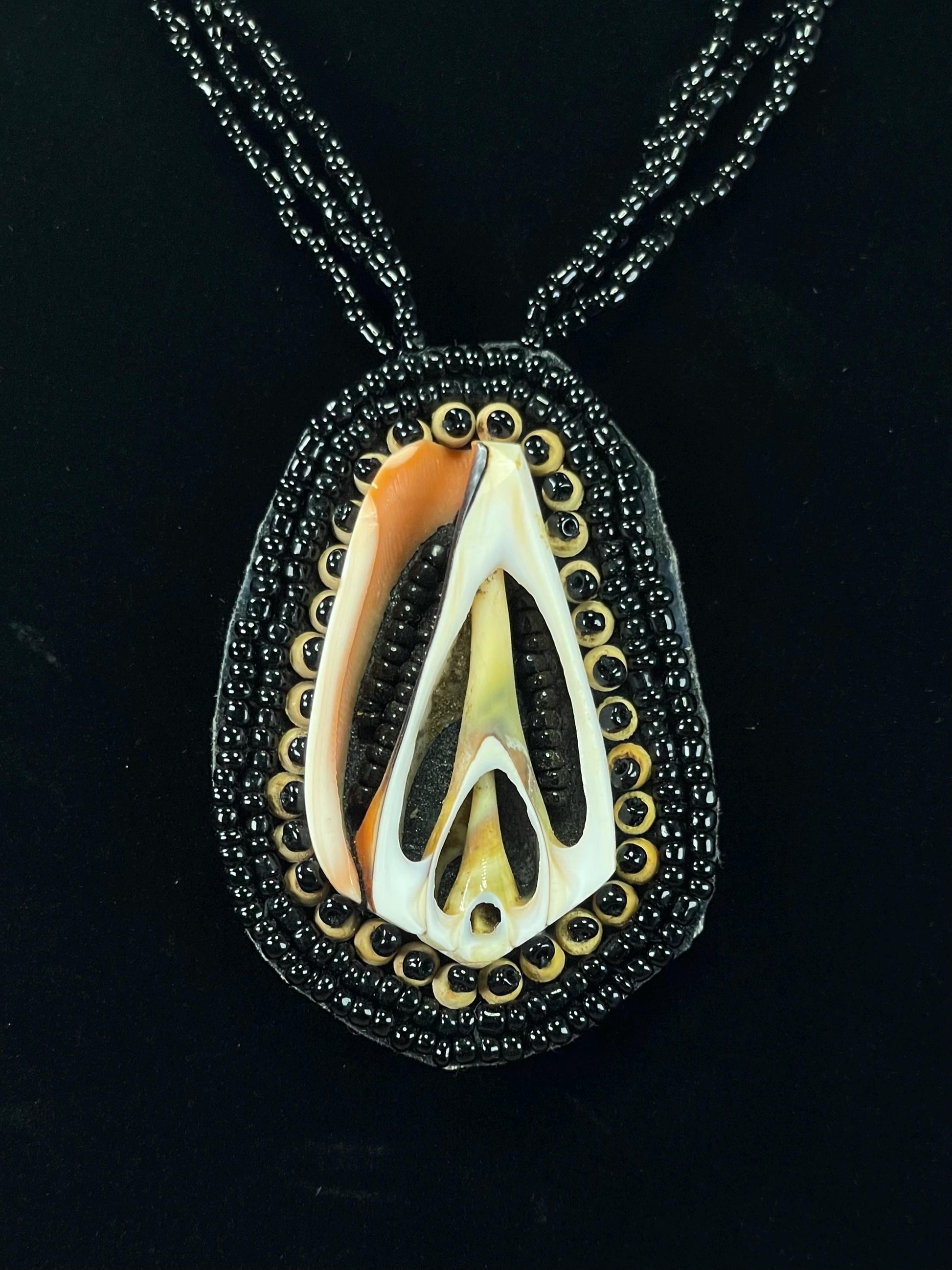Make a bold statement with this amazing beaded necklace with a shell fragment pendant and leather backing. Shell button closure. Very unique design!