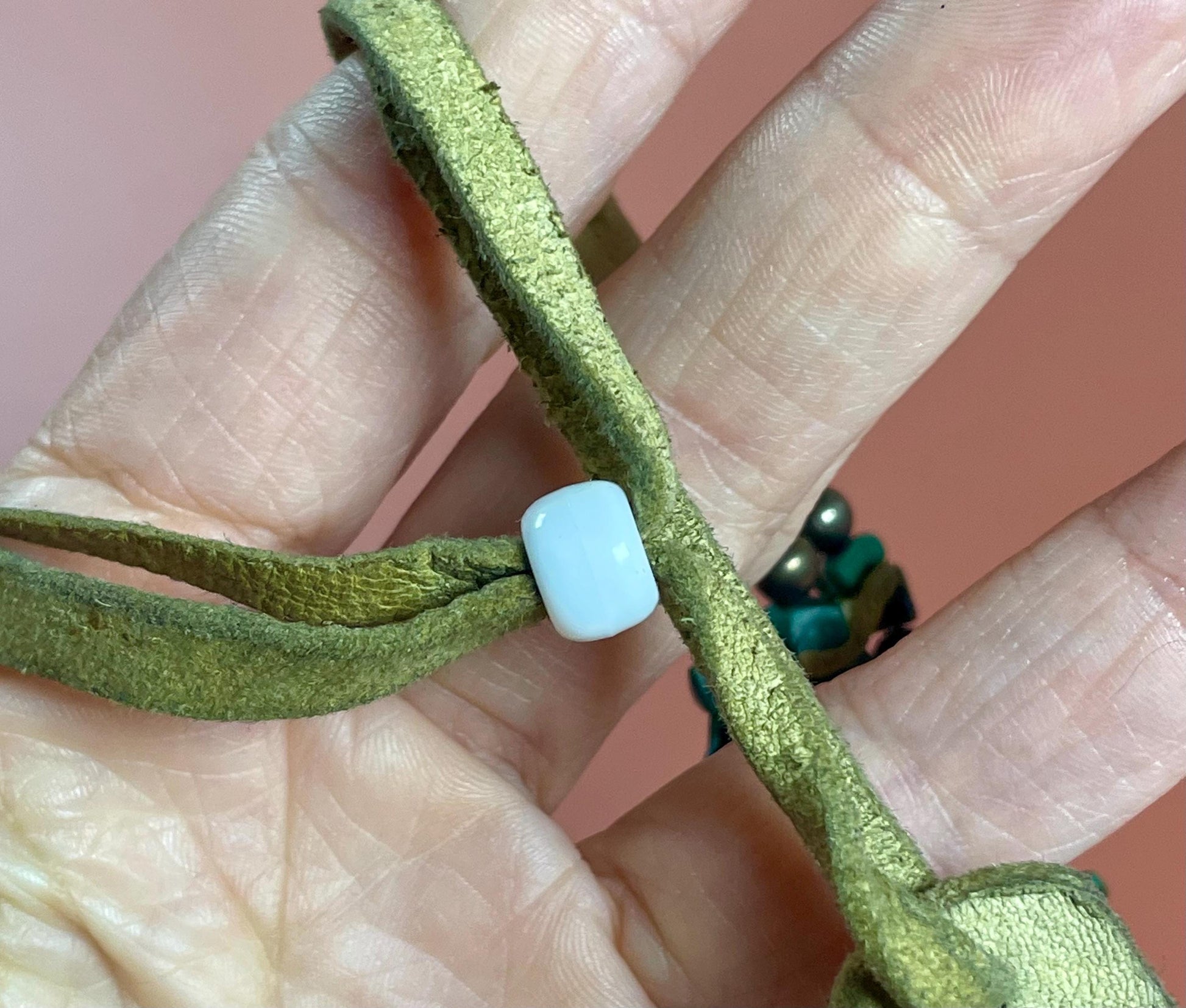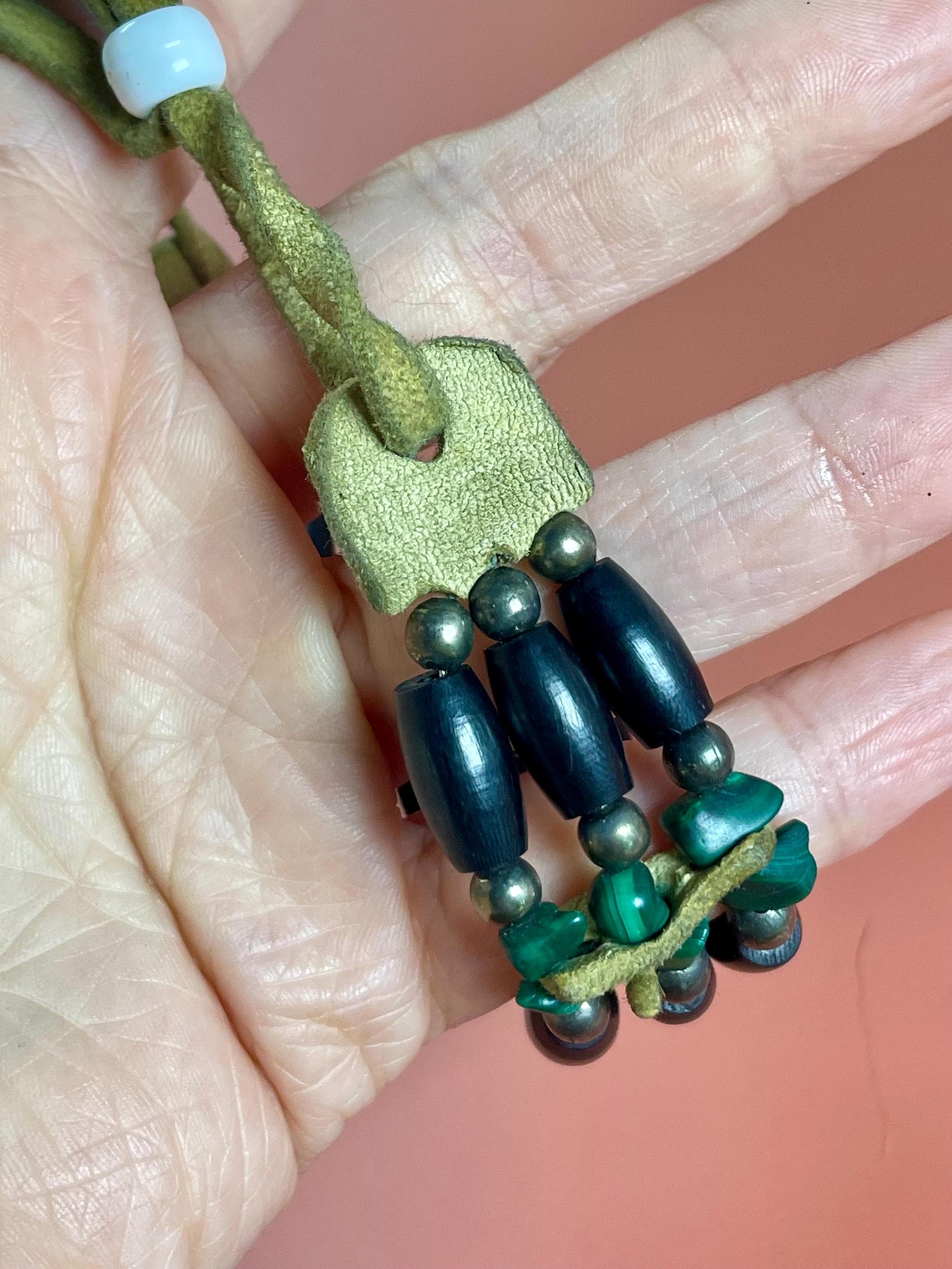 This beautiful indigenous bracelet is handmade from leather, ebony wood, and green gemstones.