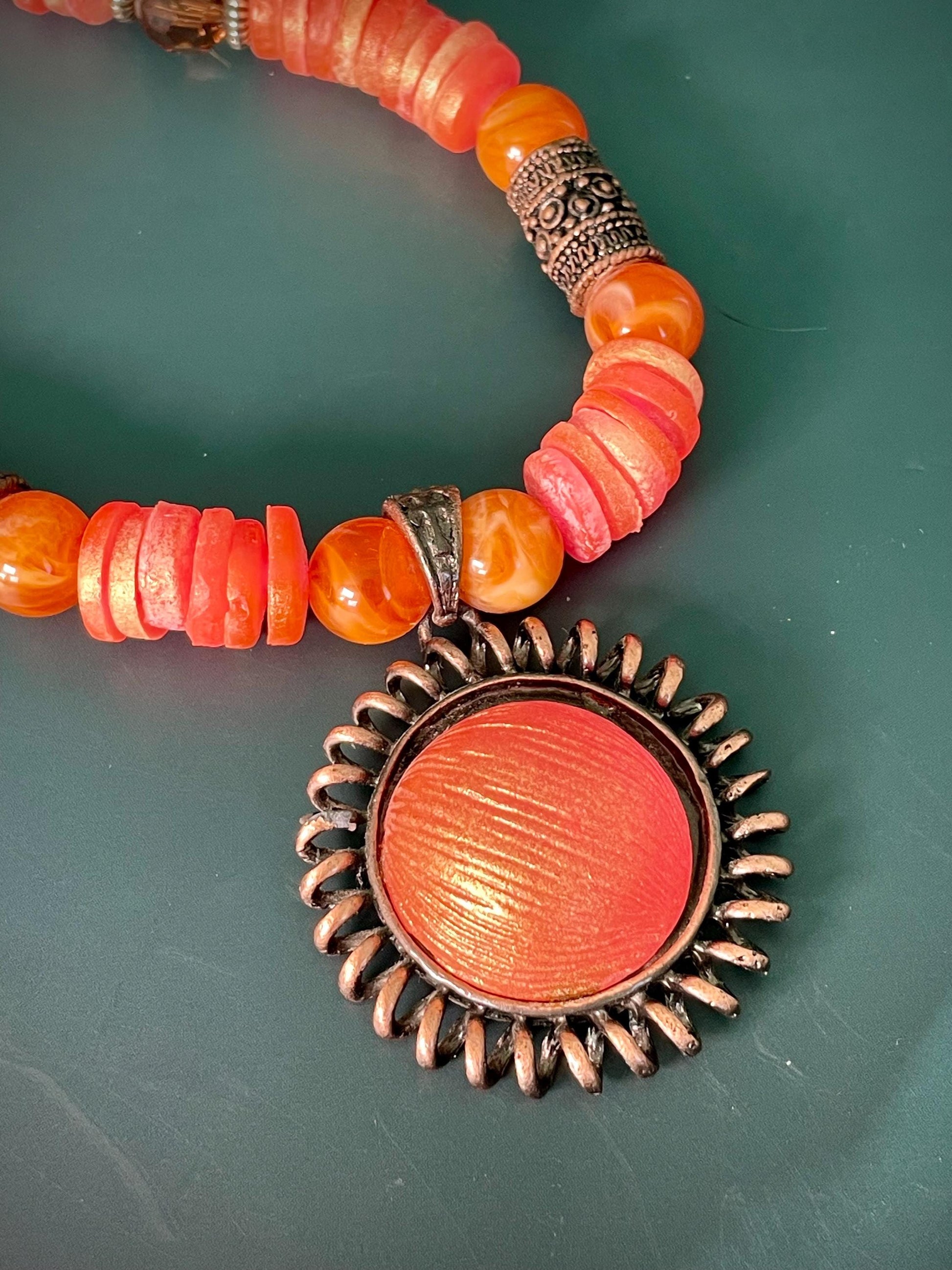 Coral tone Beaded Necklace with Sunburst Pendant 16 Adjustable