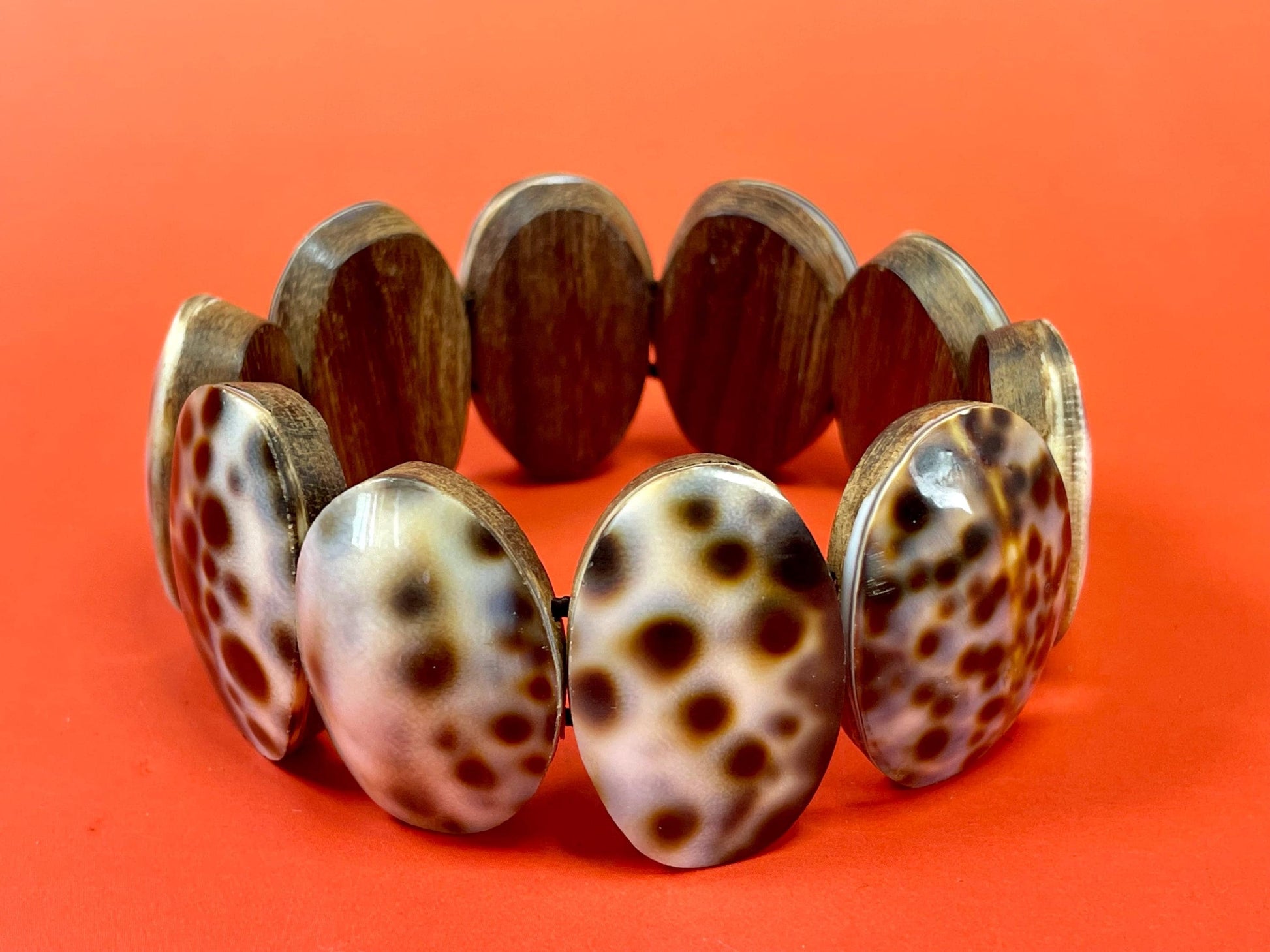 Cowrie shell and teak wood bracelet. Approximately 2.5 and stretches. So cool!