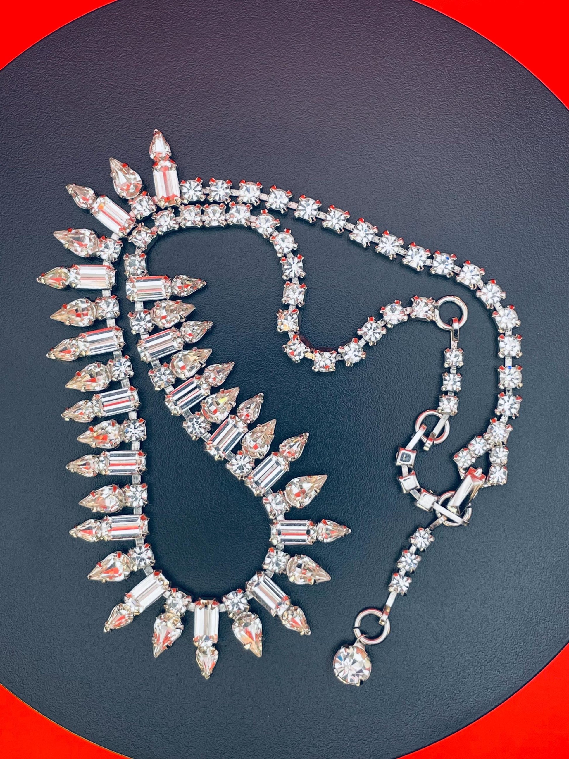 This is a dazzling lot of vintage-style rhinestone jewelry, including an 18.5-inch necklace, an approximately 1.75-inch floral brooch, and a pair of 1.25-inch clip-on earrings.