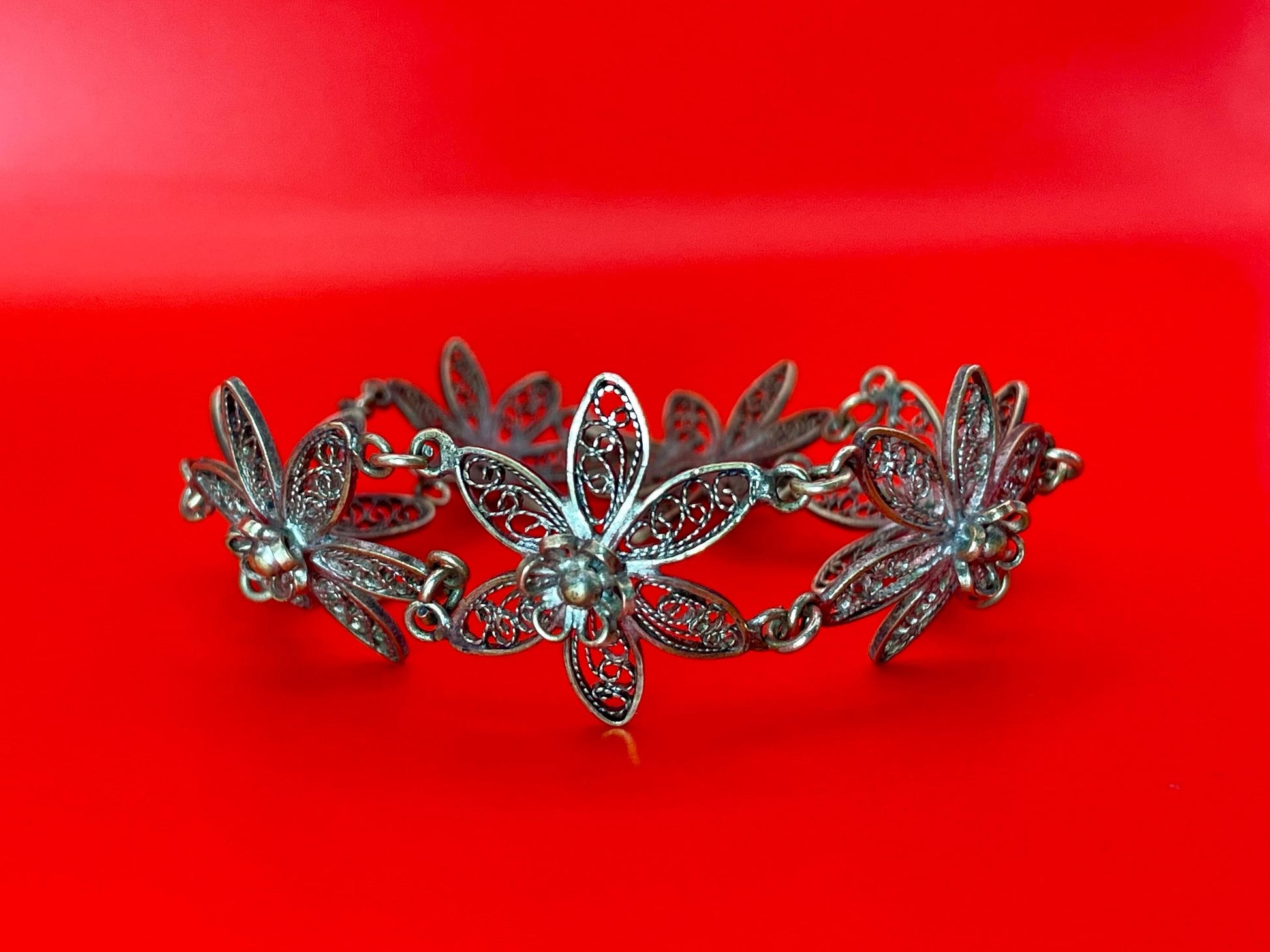 Beautiful intricate filigree flowers conected to make a lovely delicate bracelet.