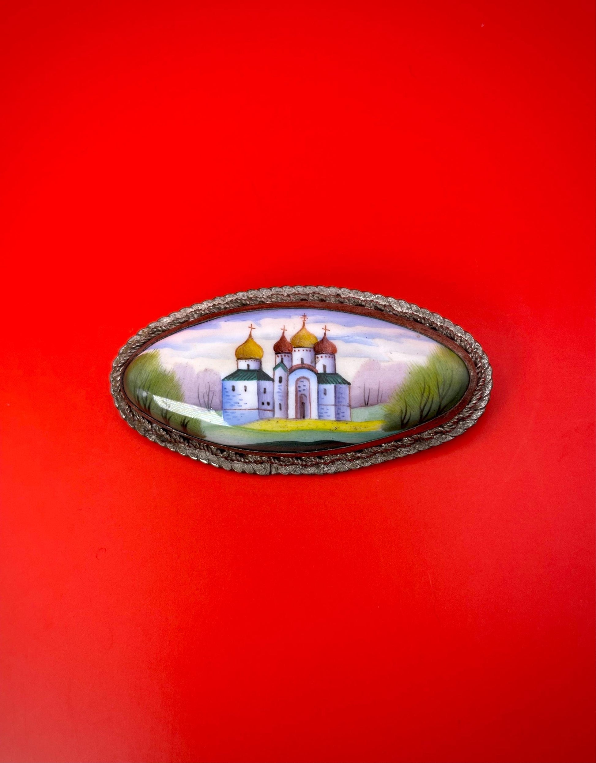 This Eastern European silver and enamel brooch features a detailed image of a church, blending intricate craftsmanship with vibrant enamel colors.