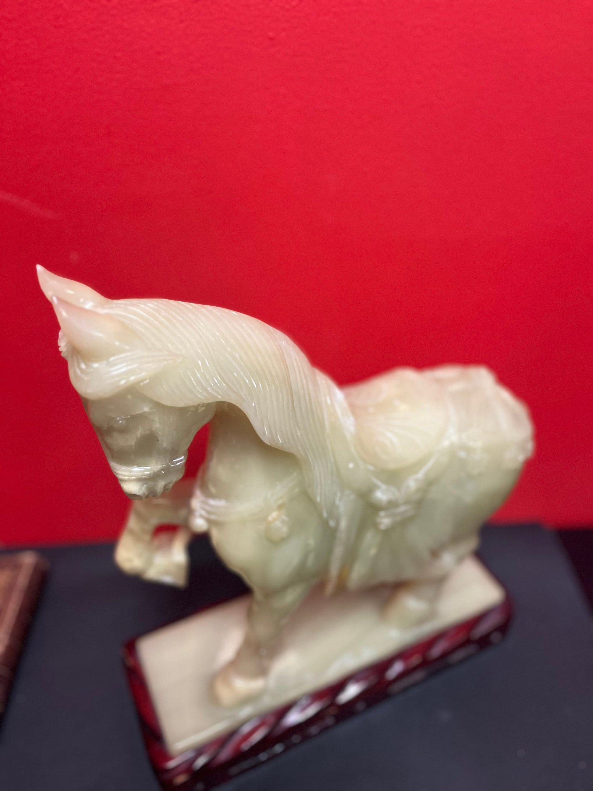 extremely rare and wonderful 13 x 15 high chinese stone horse on Rosewood base believed to be jade or jadeite very very heavy - wow