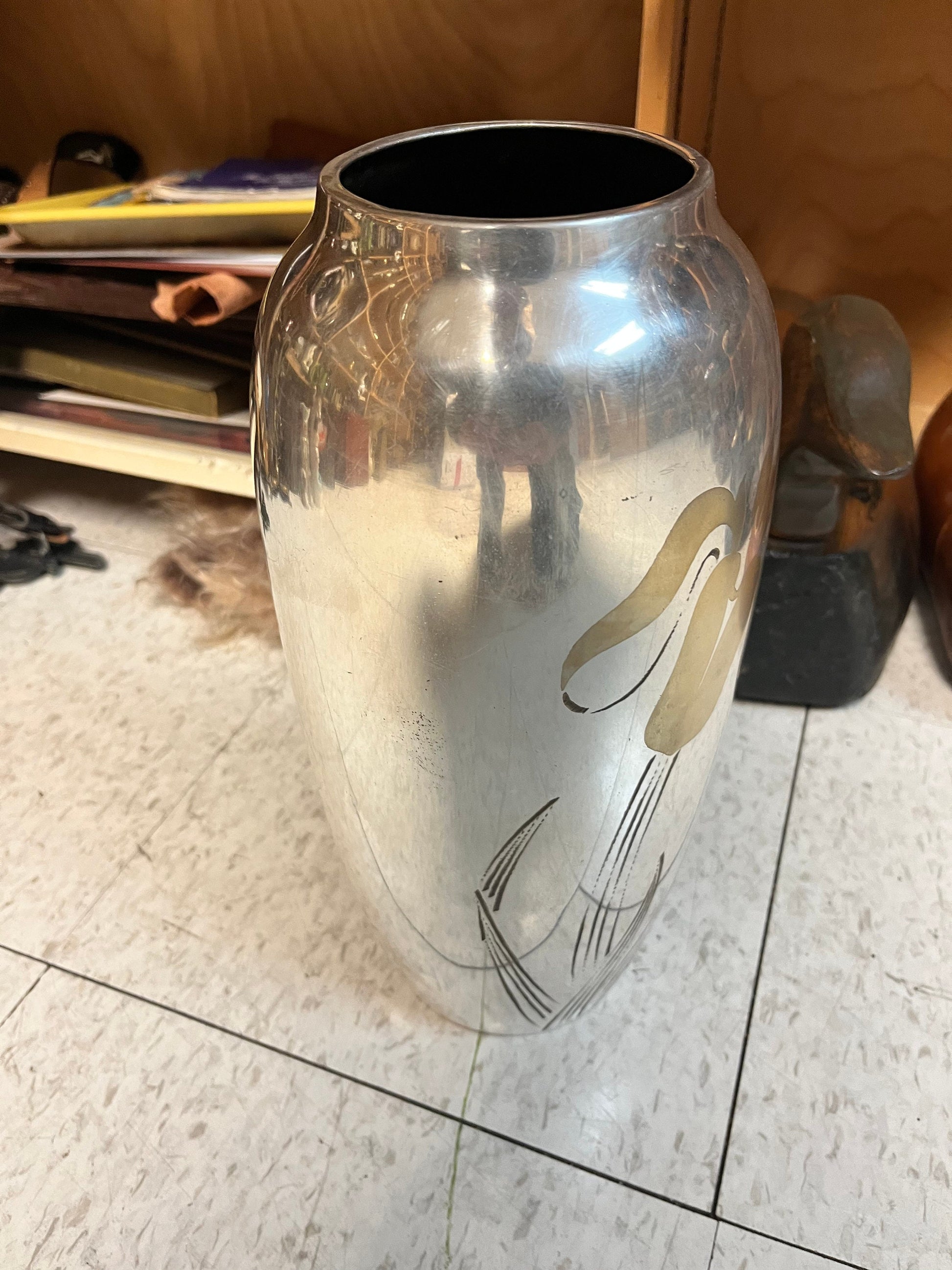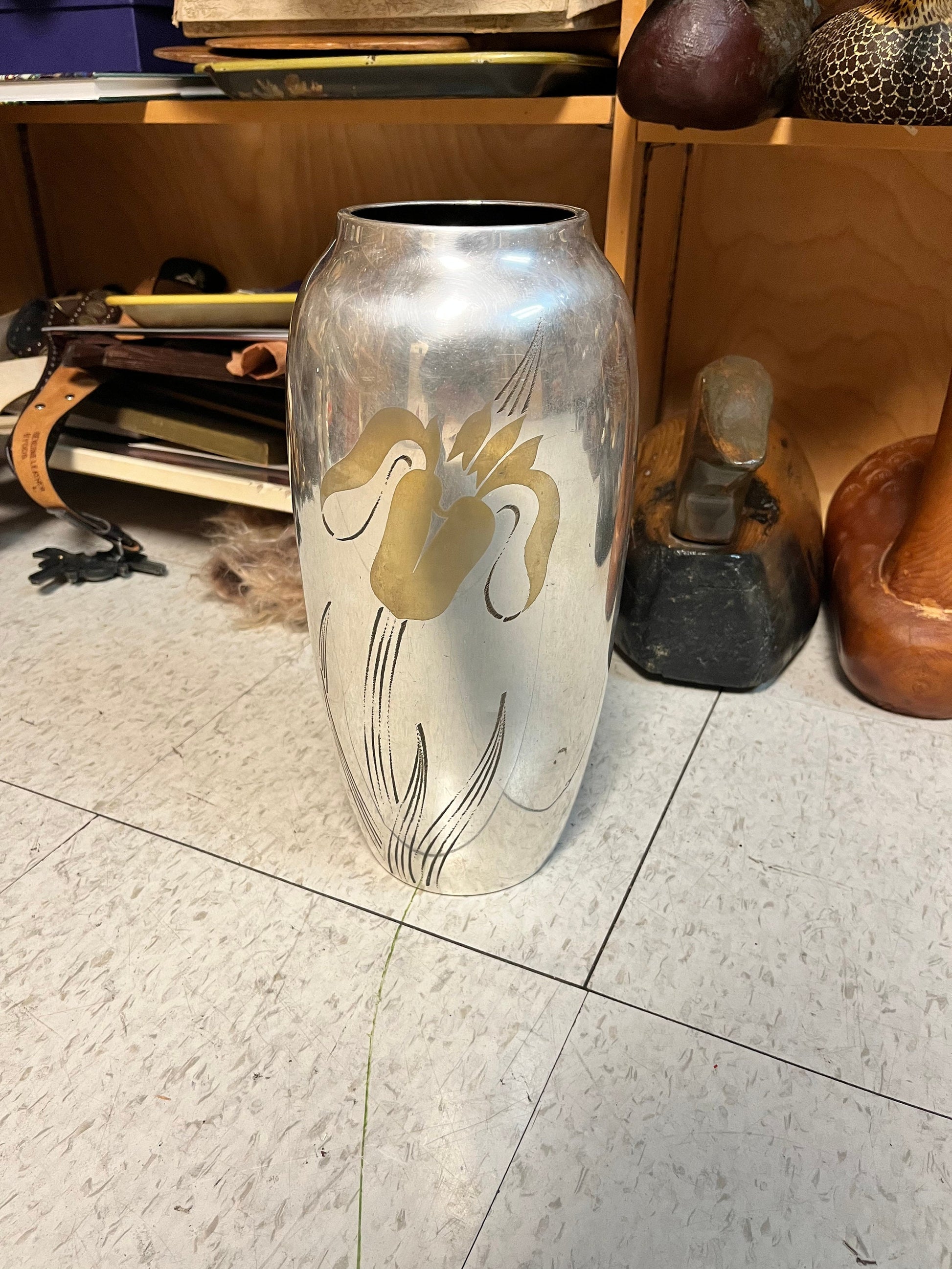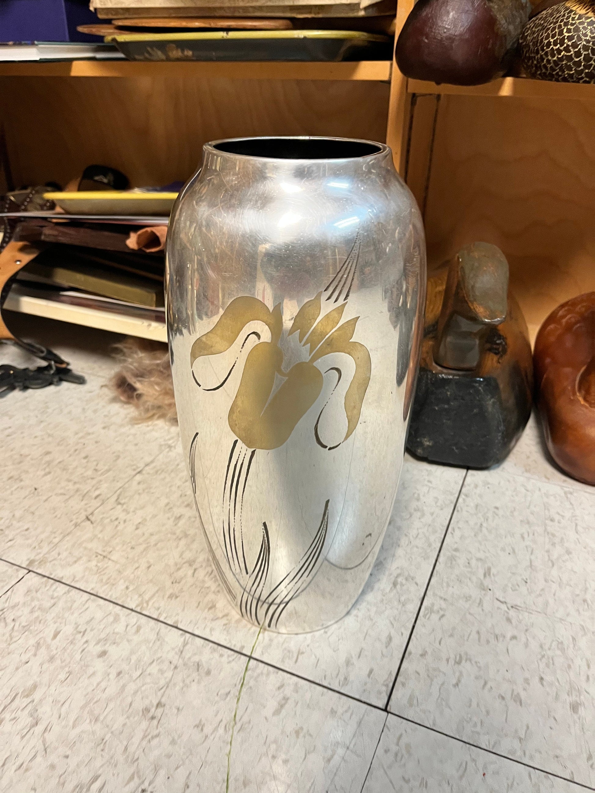 Fabulous 13 inch tall brass and silver plate WMF Ikora Iris vase one dent