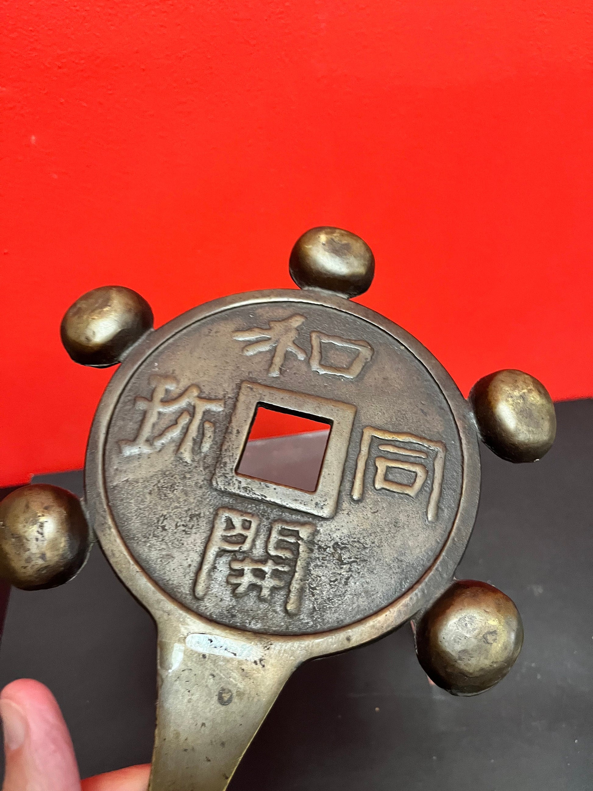 Fabulous 19 century 11 x 7 1/2 wide Japanese bronze mirror and rattle with sound lovely Patina