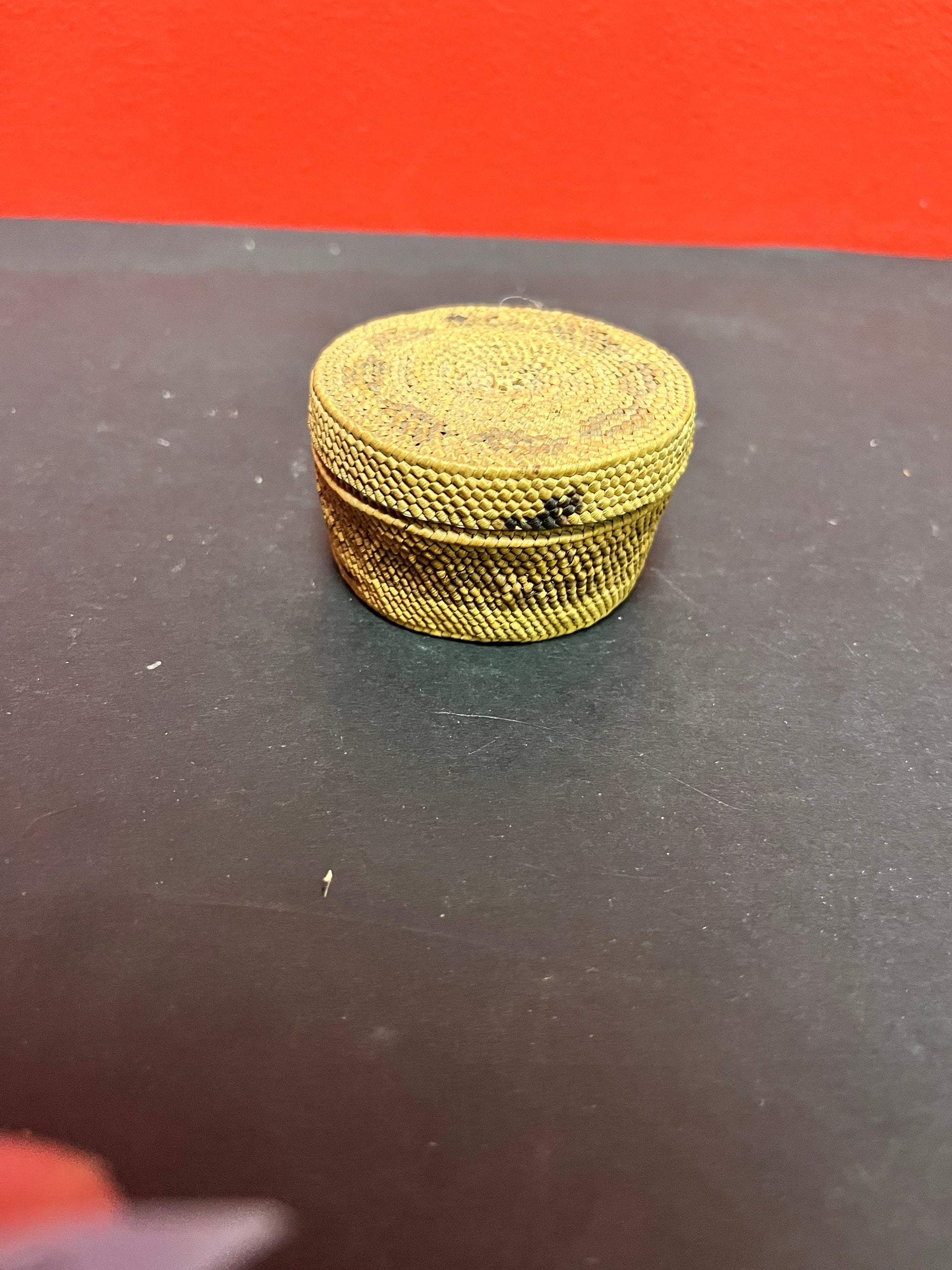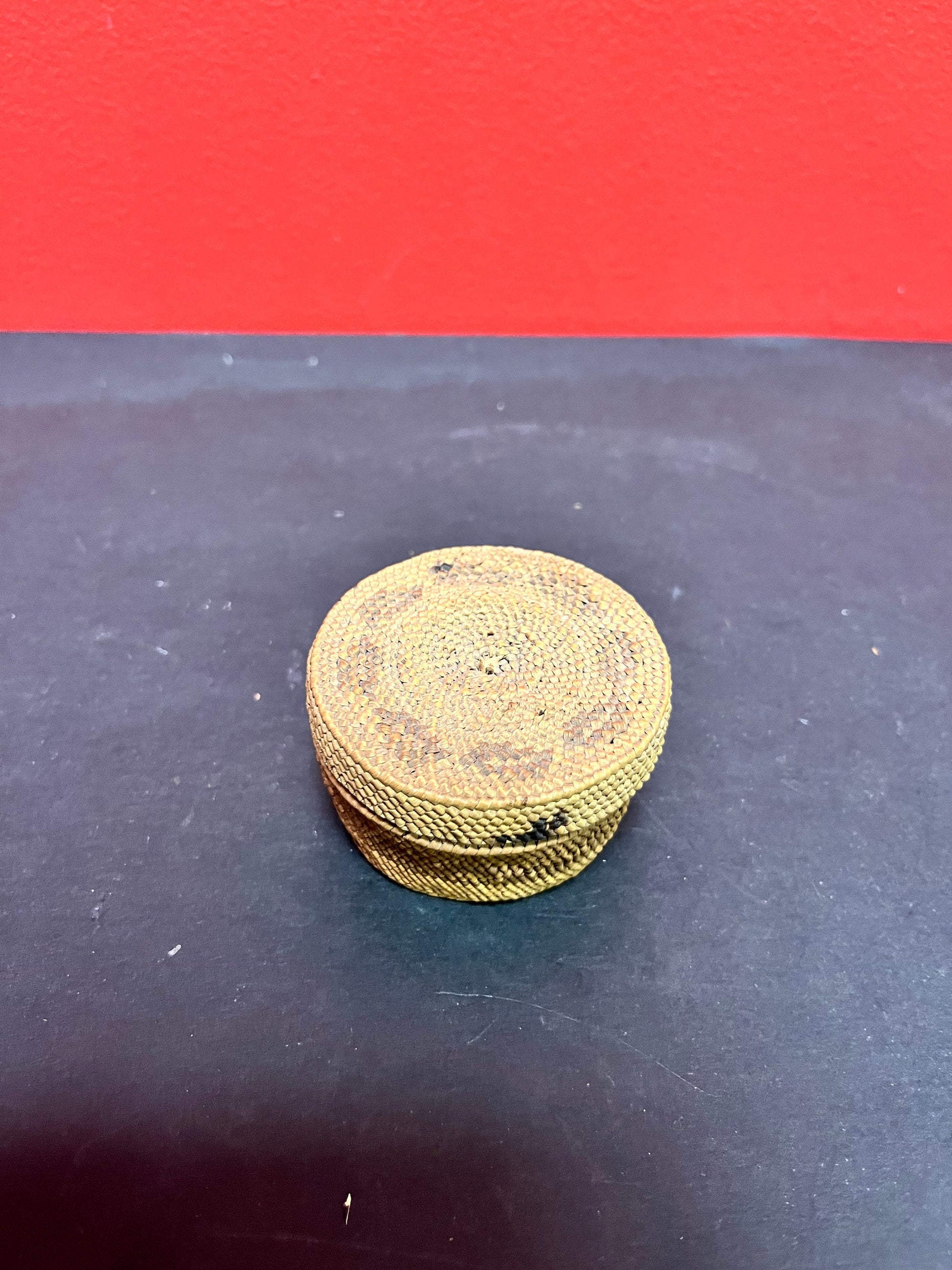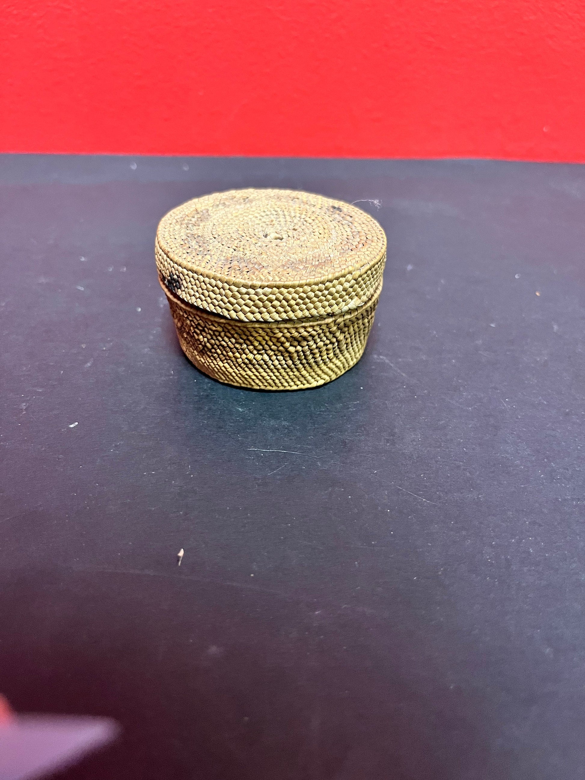 Fabulous 2 1/2 inch indigenous First Nations Pacific Northwest pre-1940s Salish basket with nice detail in good condition