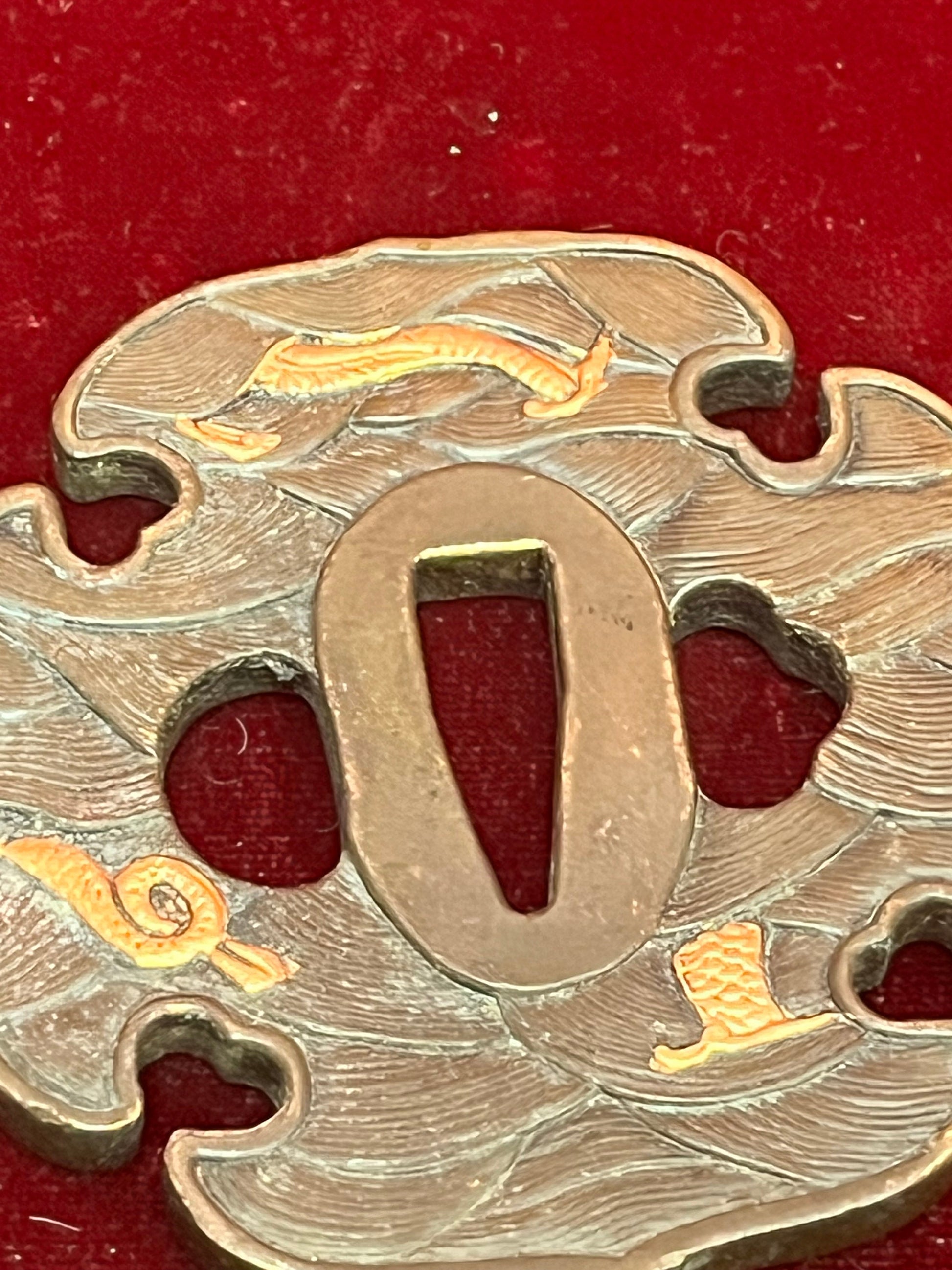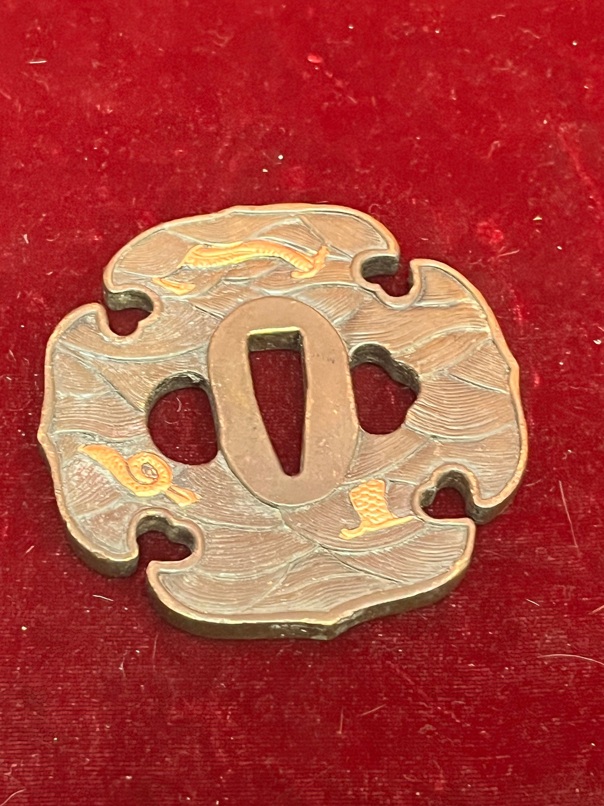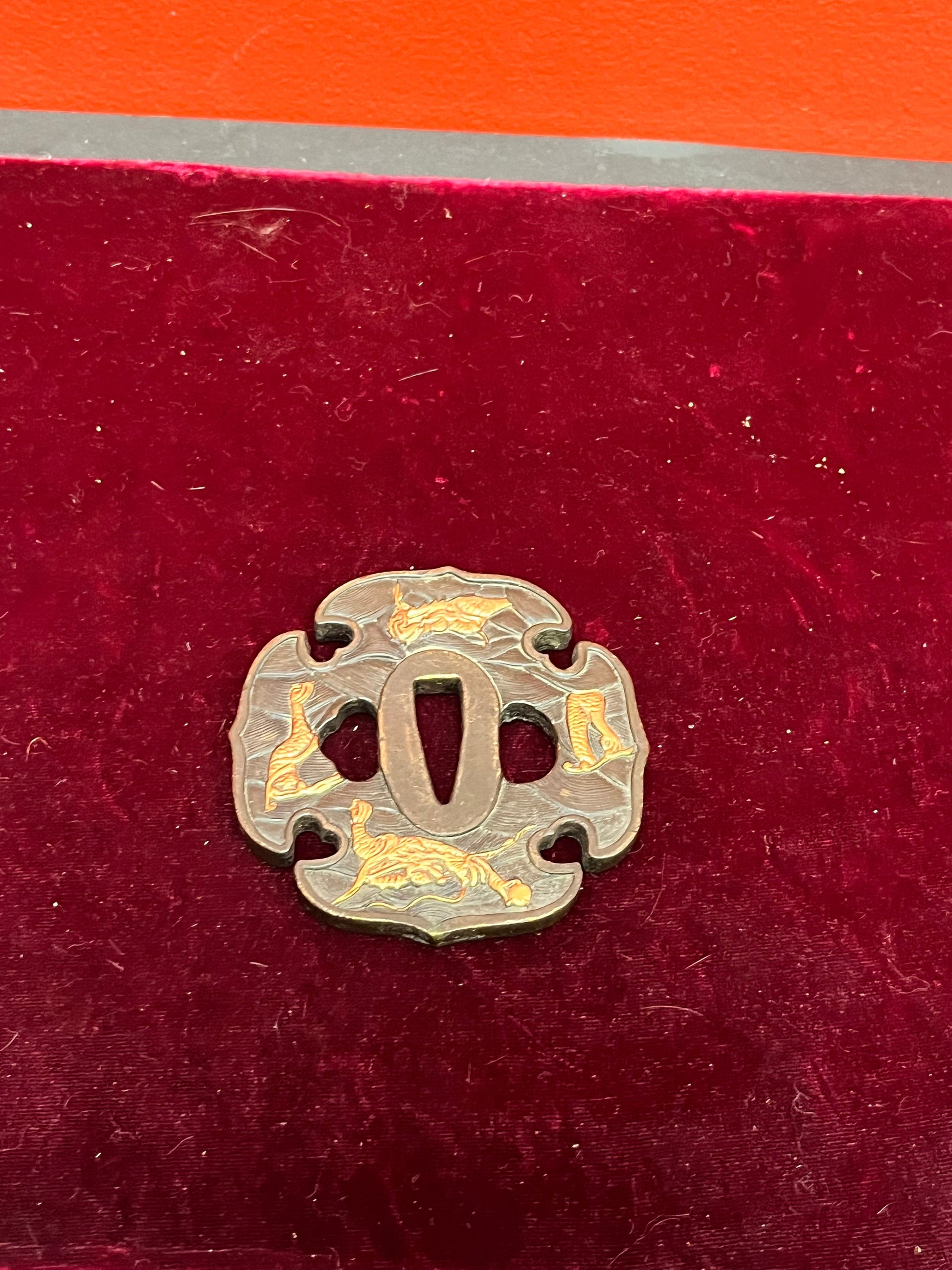 Fabulous 3 inch Japanese bronze and gilt samurai tsuba antique in good condition