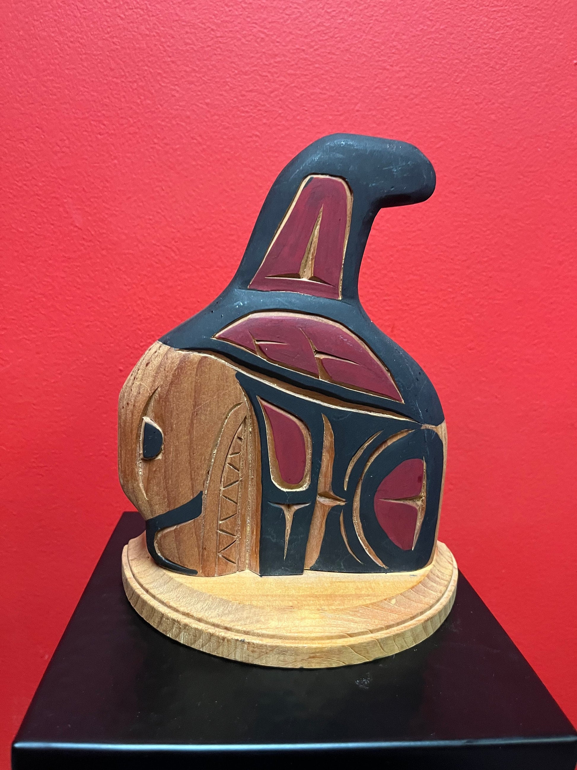 Fabulous 9 inch tall signed indigenous first nations Pacific Northwest Coast double sided killer whale on stand