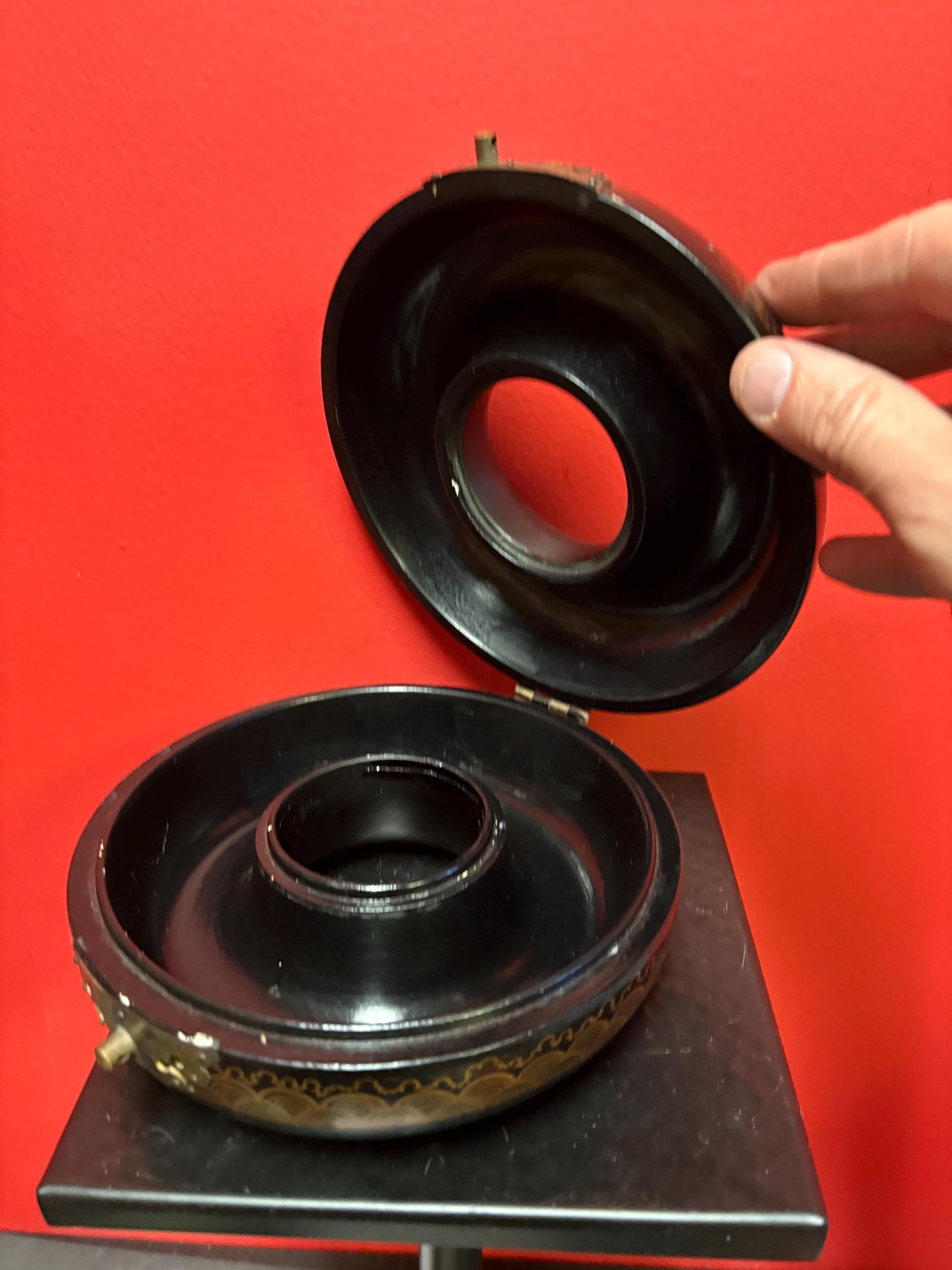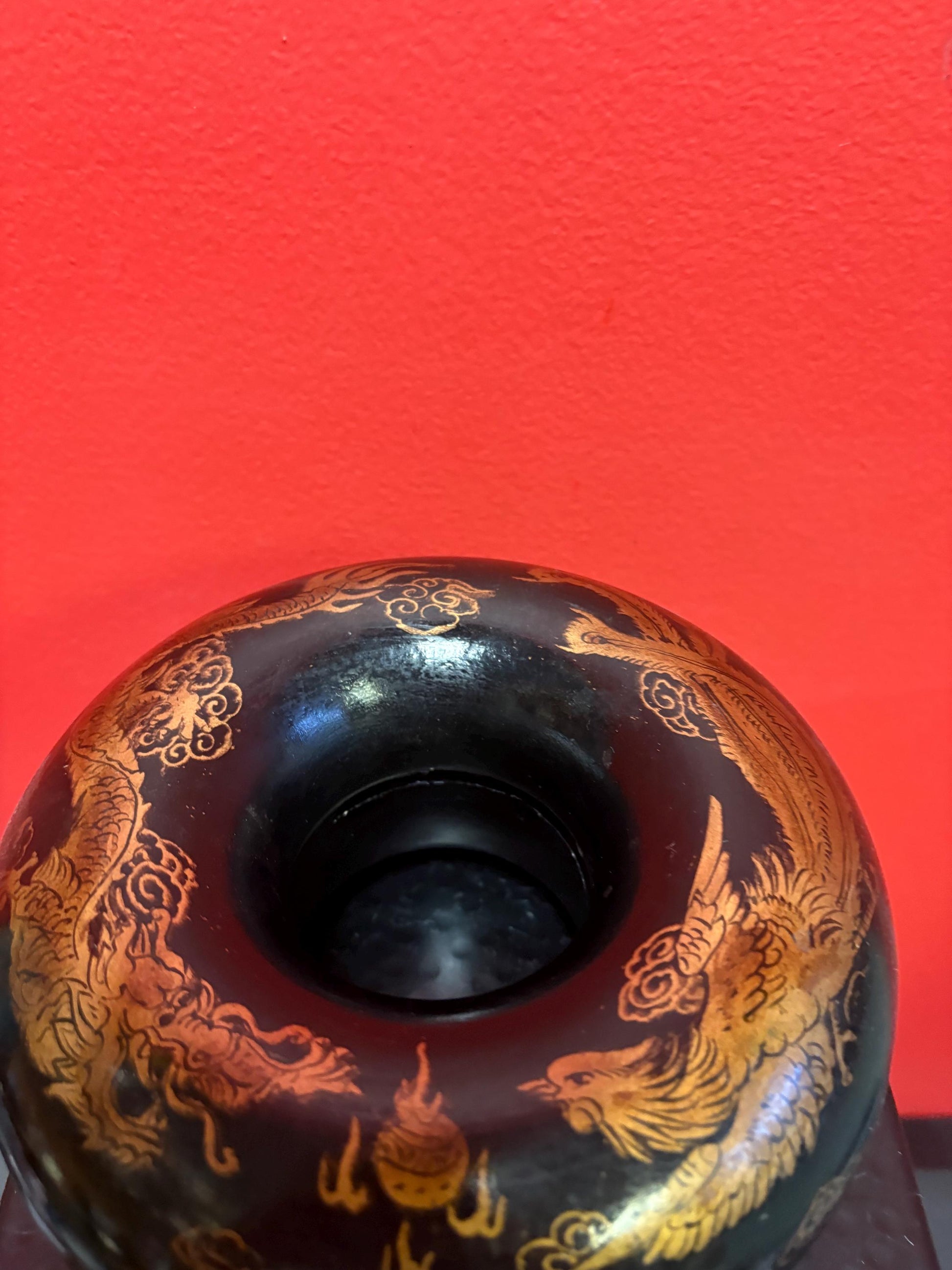 Fabulous antique Asian Chinese lacquer child collar box great condition latch as is dragon and phoenix in fight motif 7 x 4 tall
