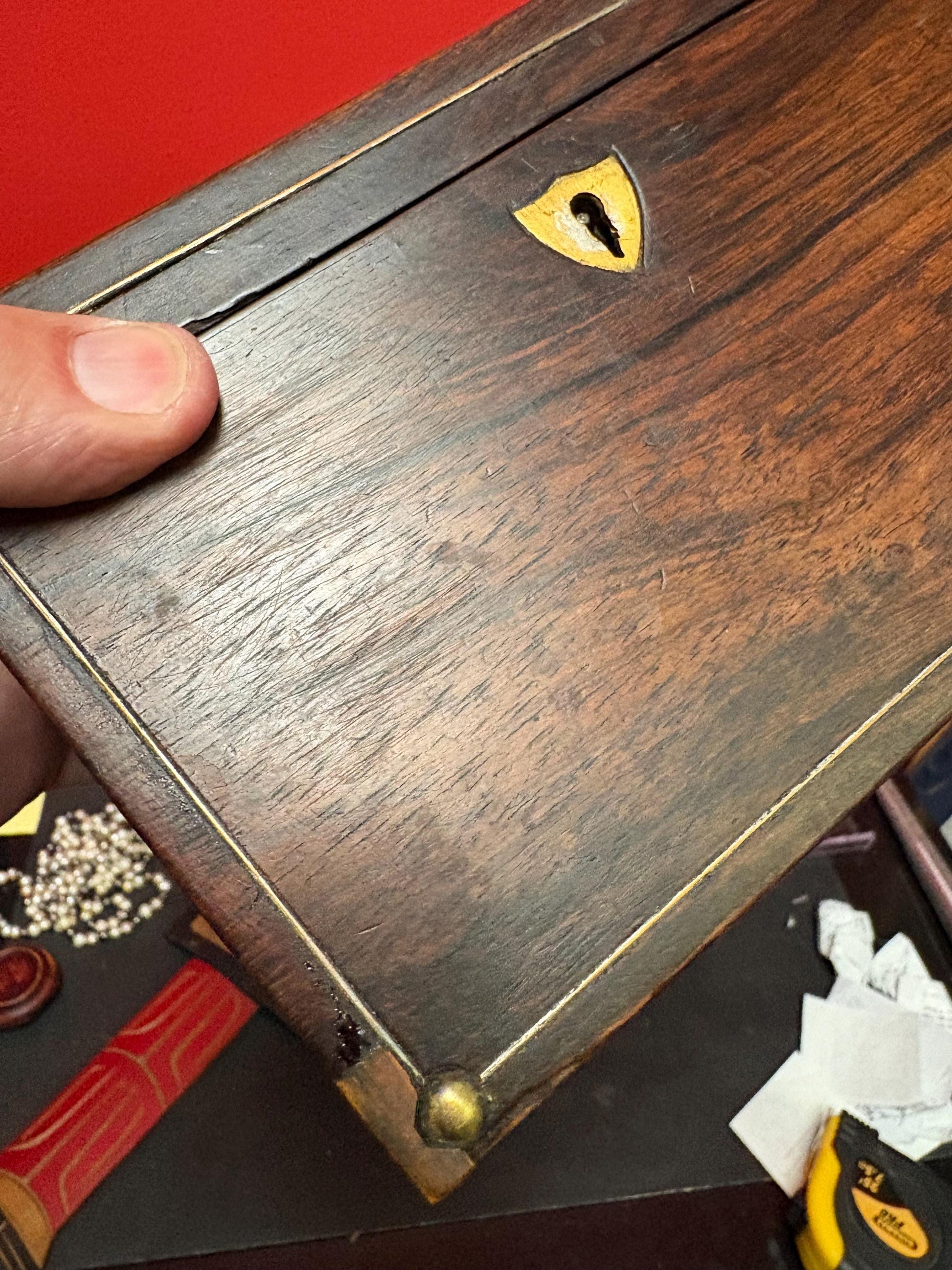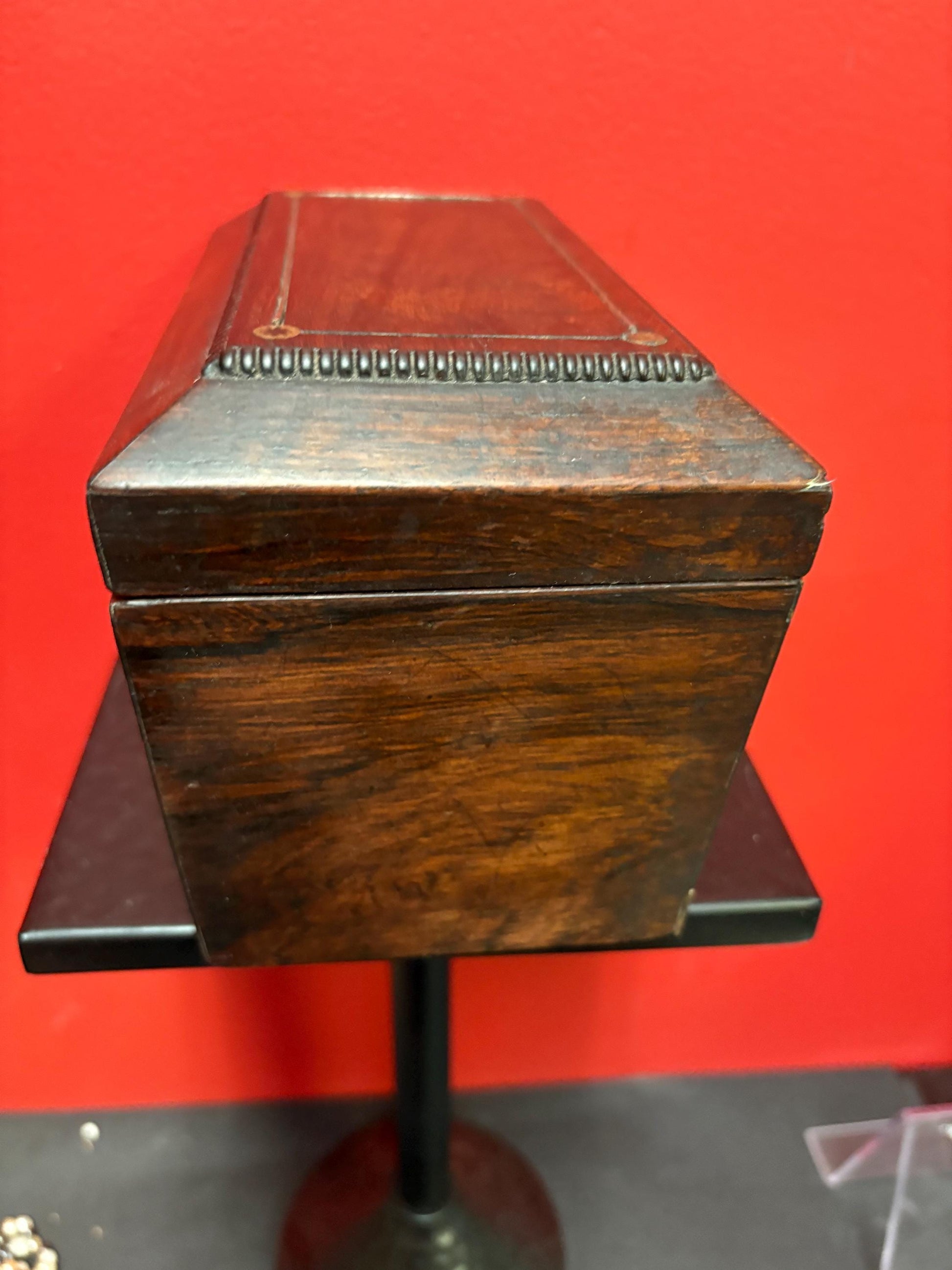 Fabulous early 19 century wooden jewelry or sewing box in amazing condition beautifully lined inside and 8 x 5 x 4 high wonderful gift