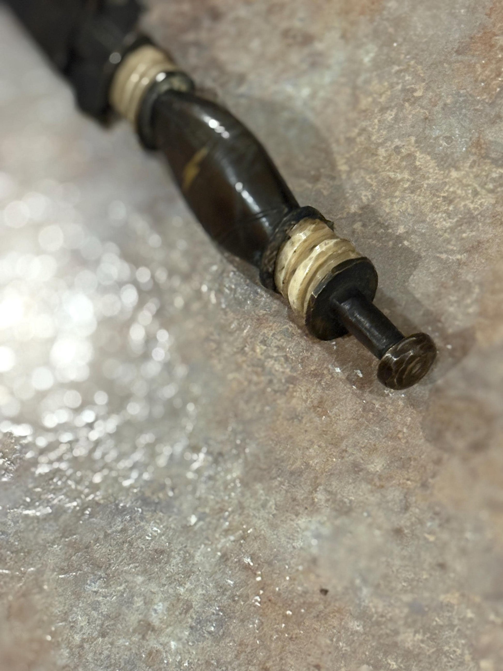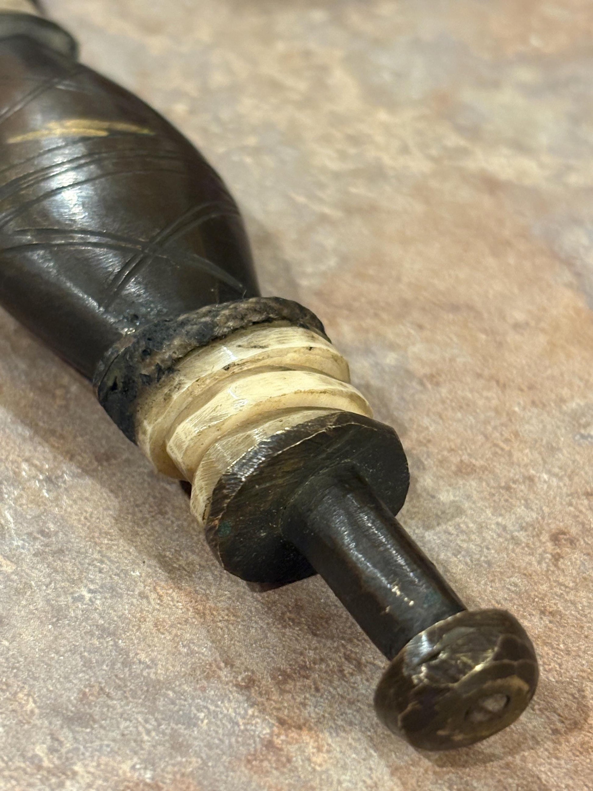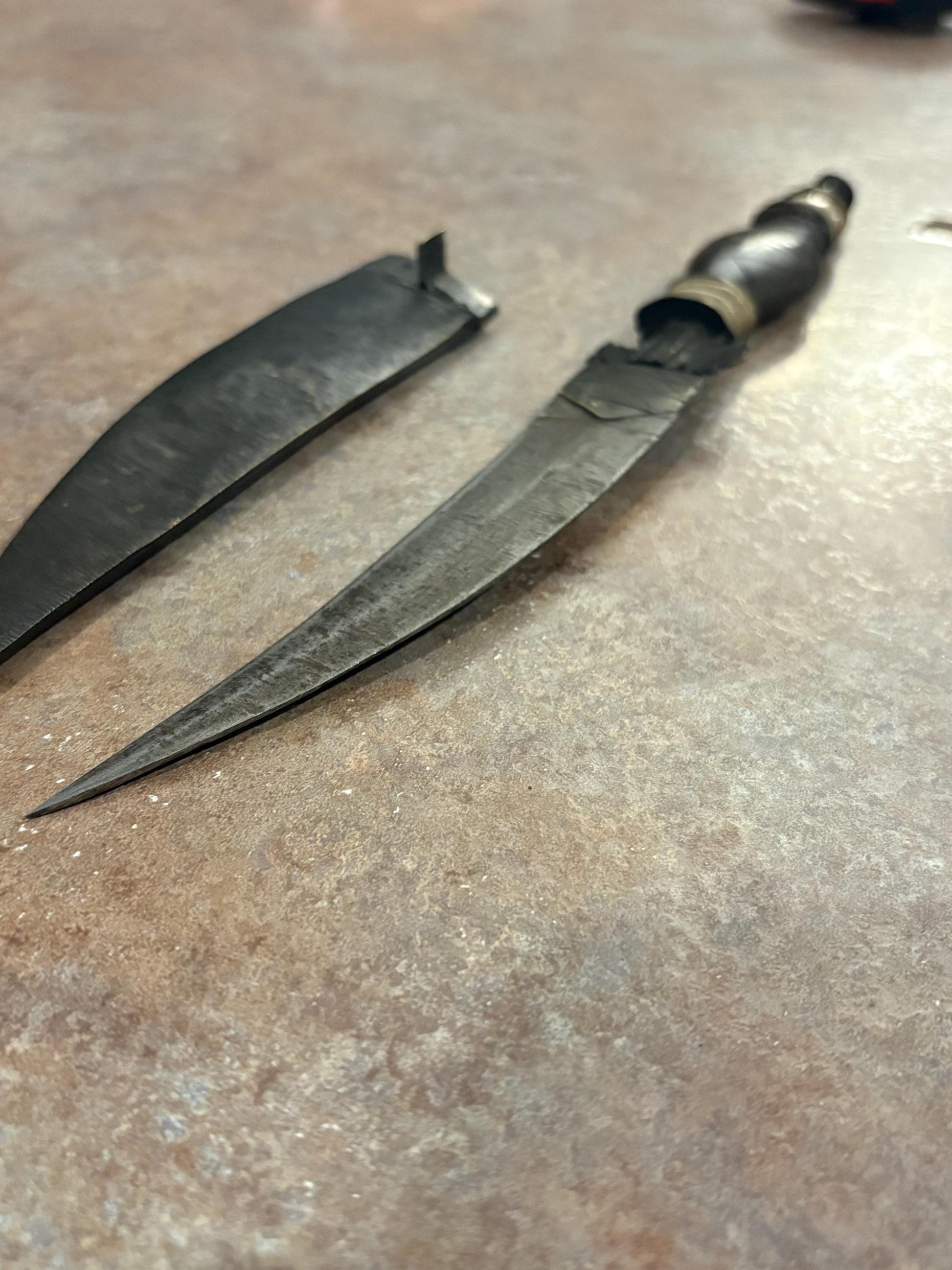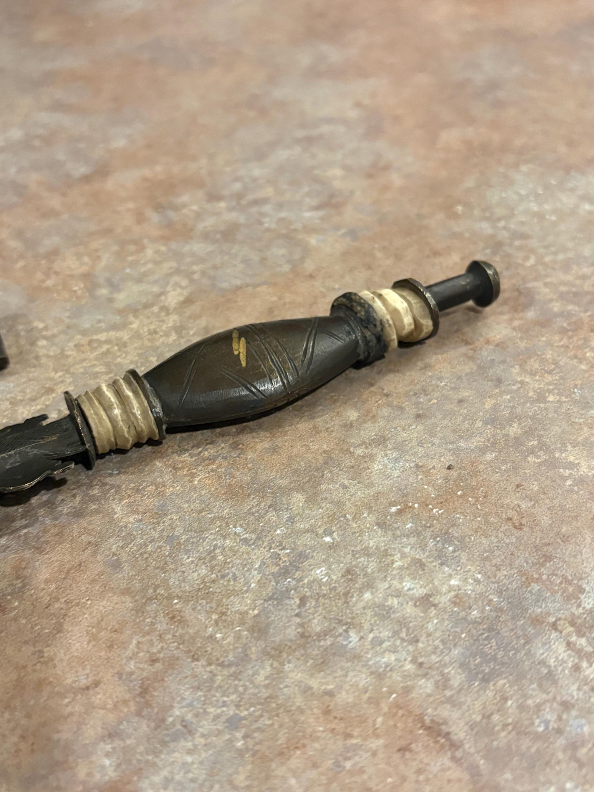 Fabulous museum quality 12 inch early 19 century African bronze steel and horn tribal knife in sheaf - wonderful patina — great condition