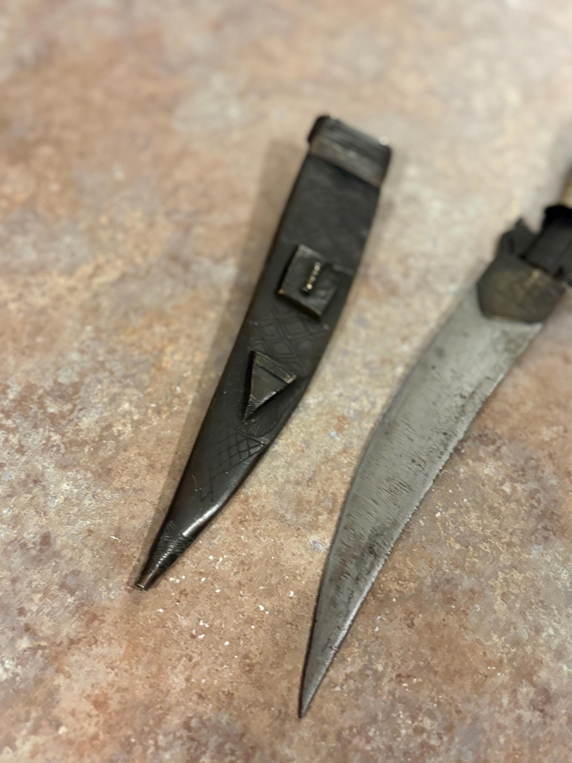 Fabulous museum quality 12 inch early 19 century African bronze steel and horn tribal knife in sheaf - wonderful patina great condition