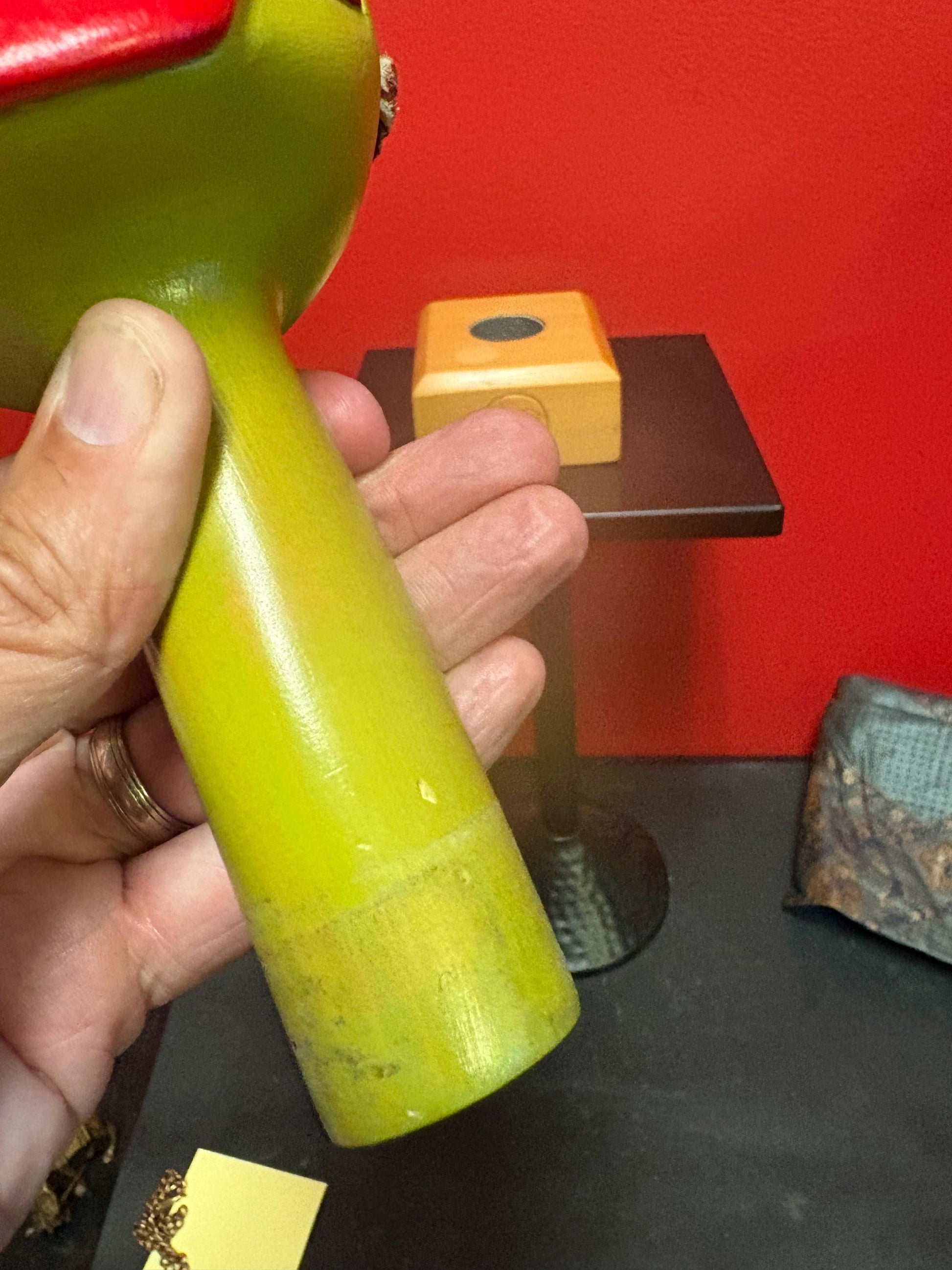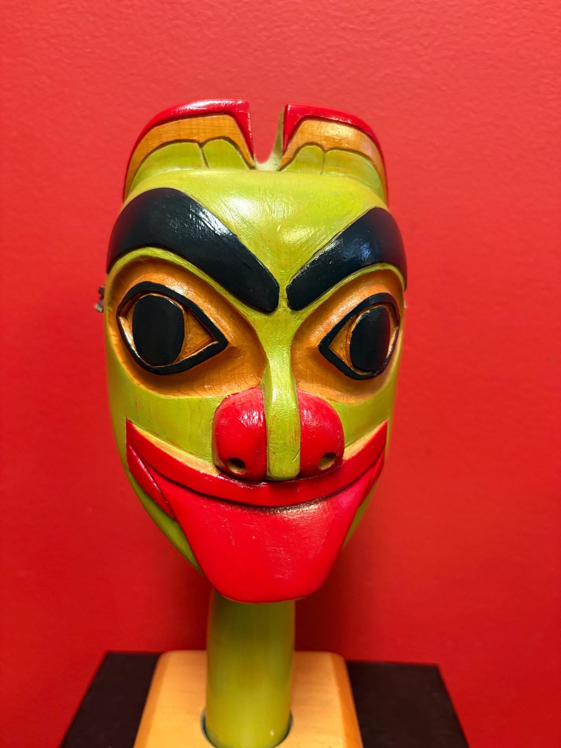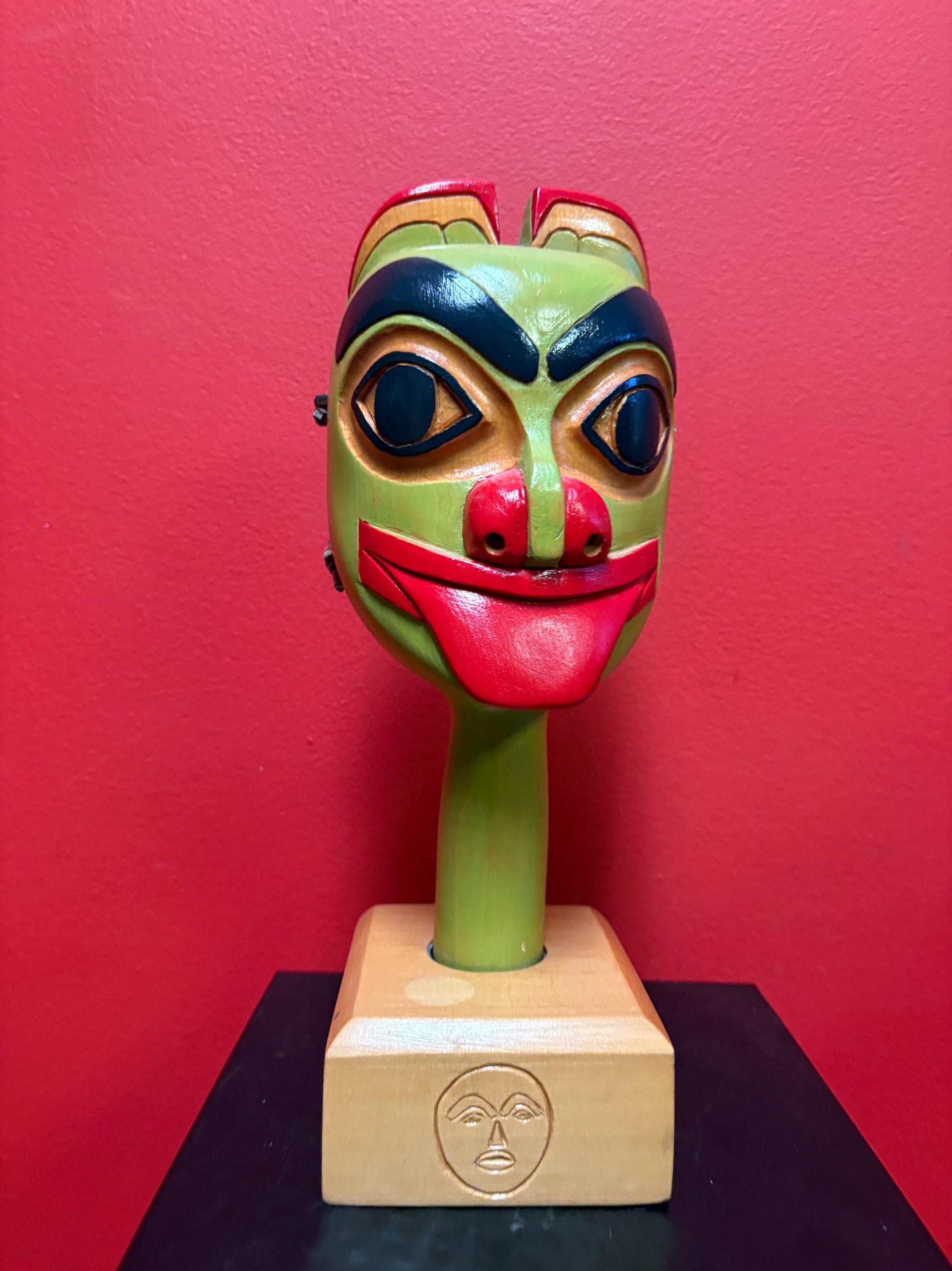 fabulous indigenous first nation Pacific Northwest Coast signed Haywood Russel frog rattle in stand — rattle 10 inches and stand 2 inches tall