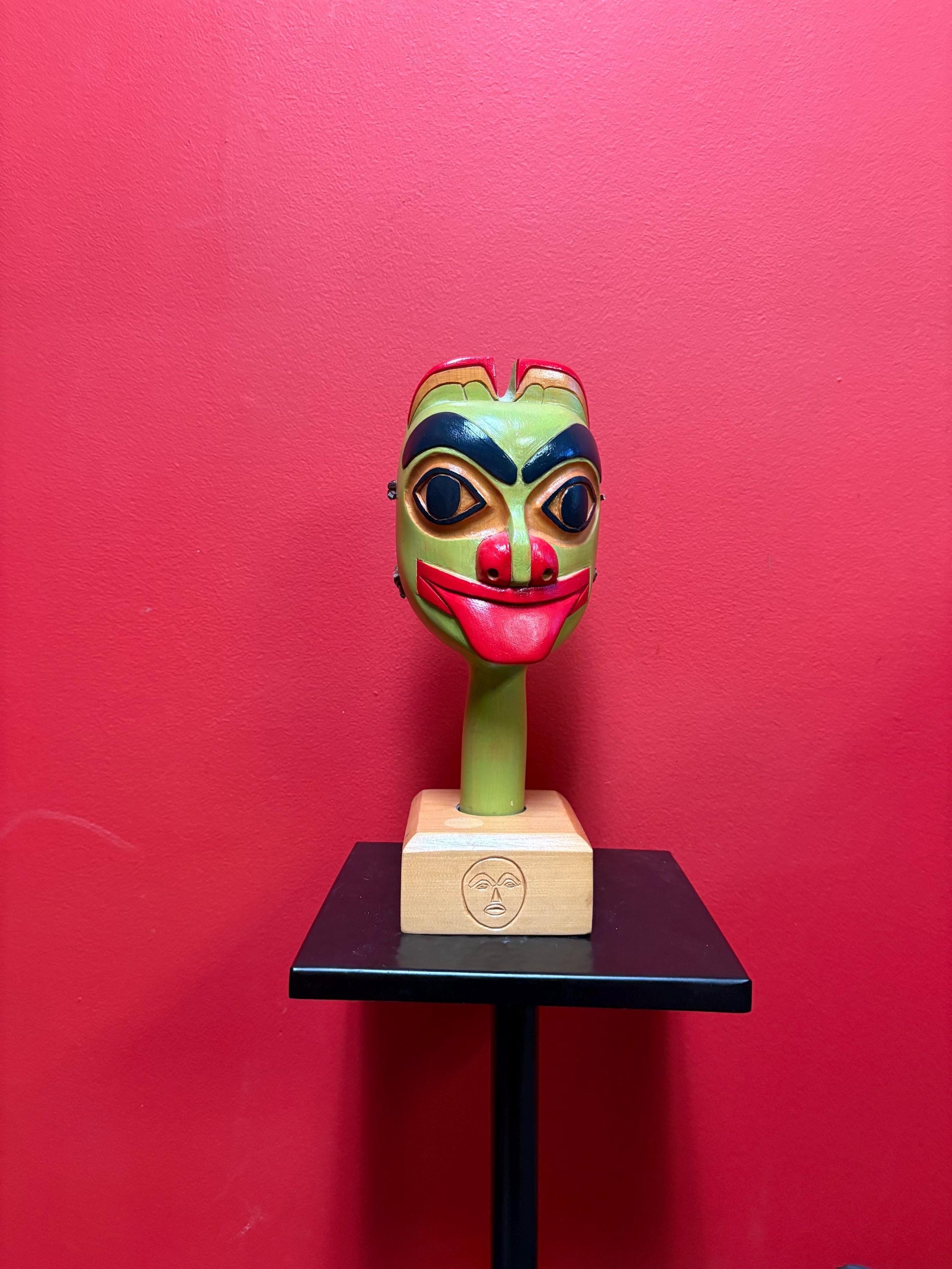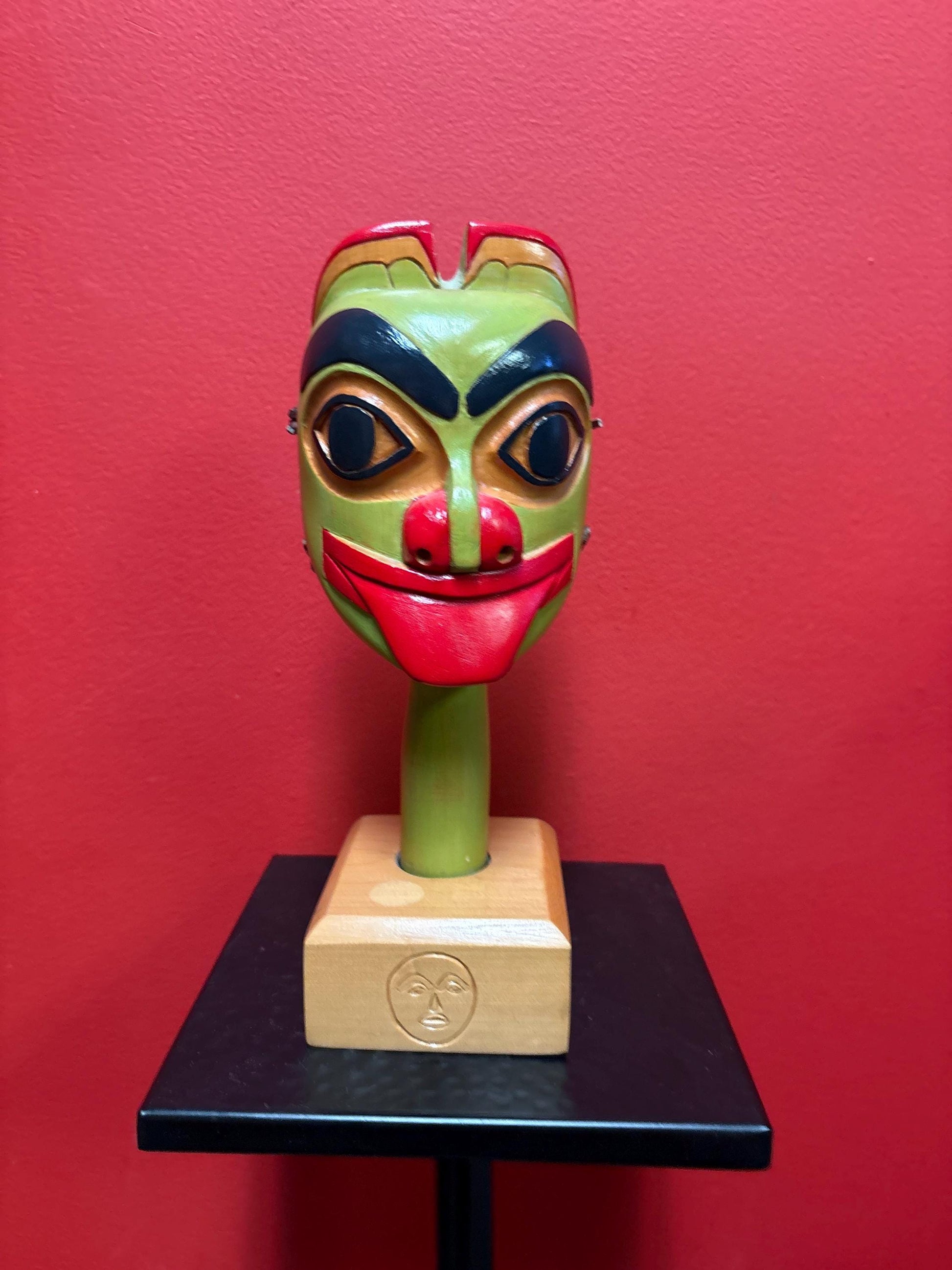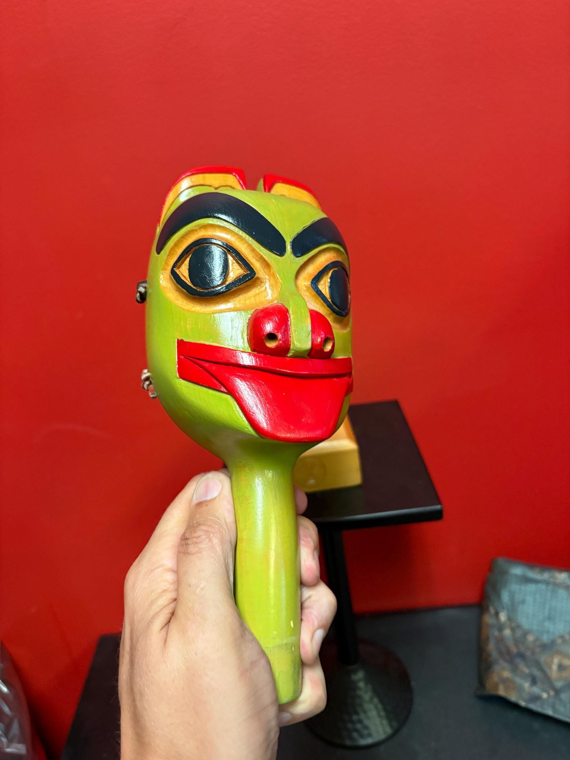 favulous indigenous first nation Pacific Northwest Coast signed Haywood Russel frog rattle in stand rattle 10 inches and stand 2 inches