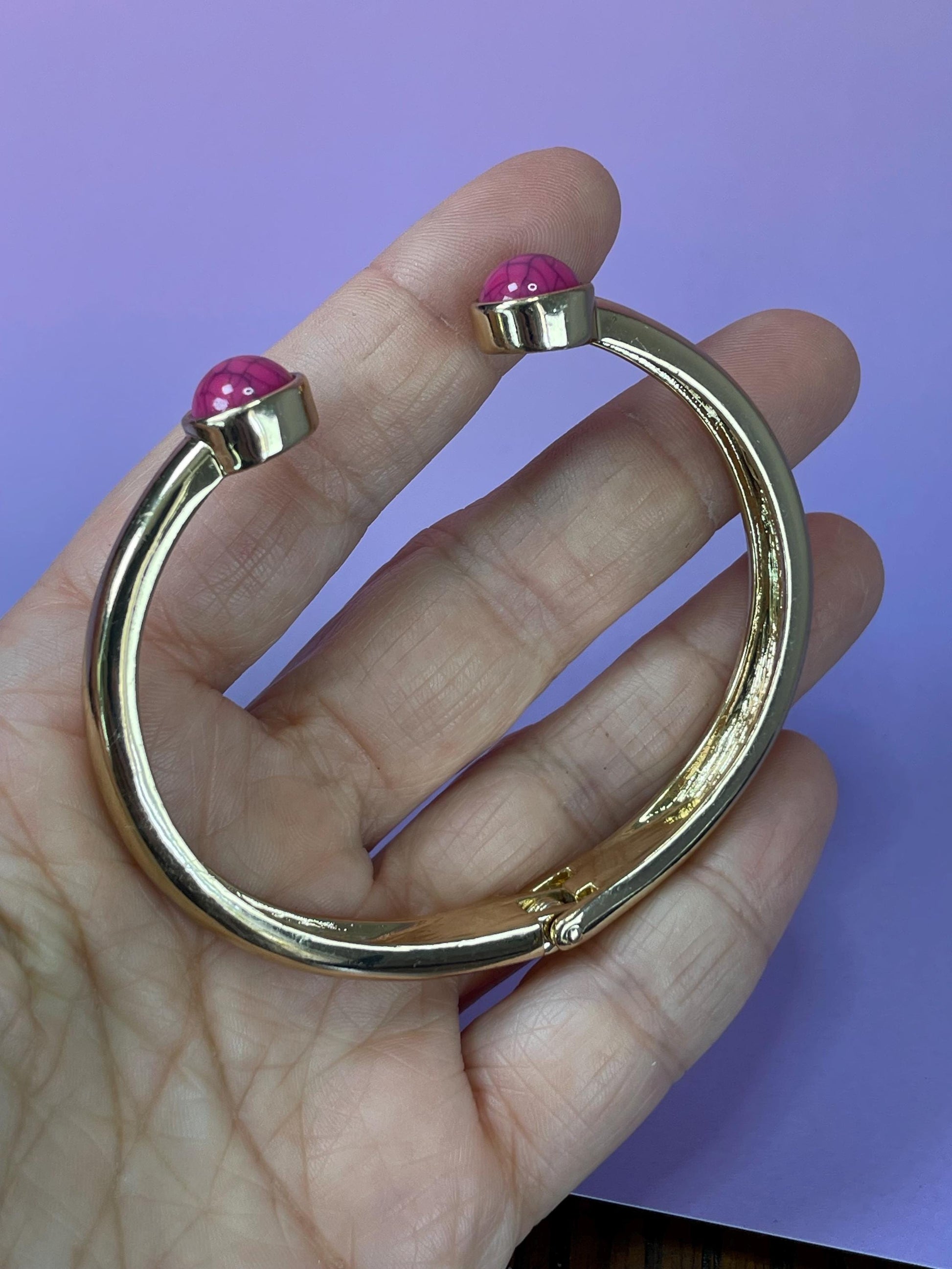 Gold-toned bracelet with spring hinge for easy wearability. Lovely bright pink crackle bead accents.