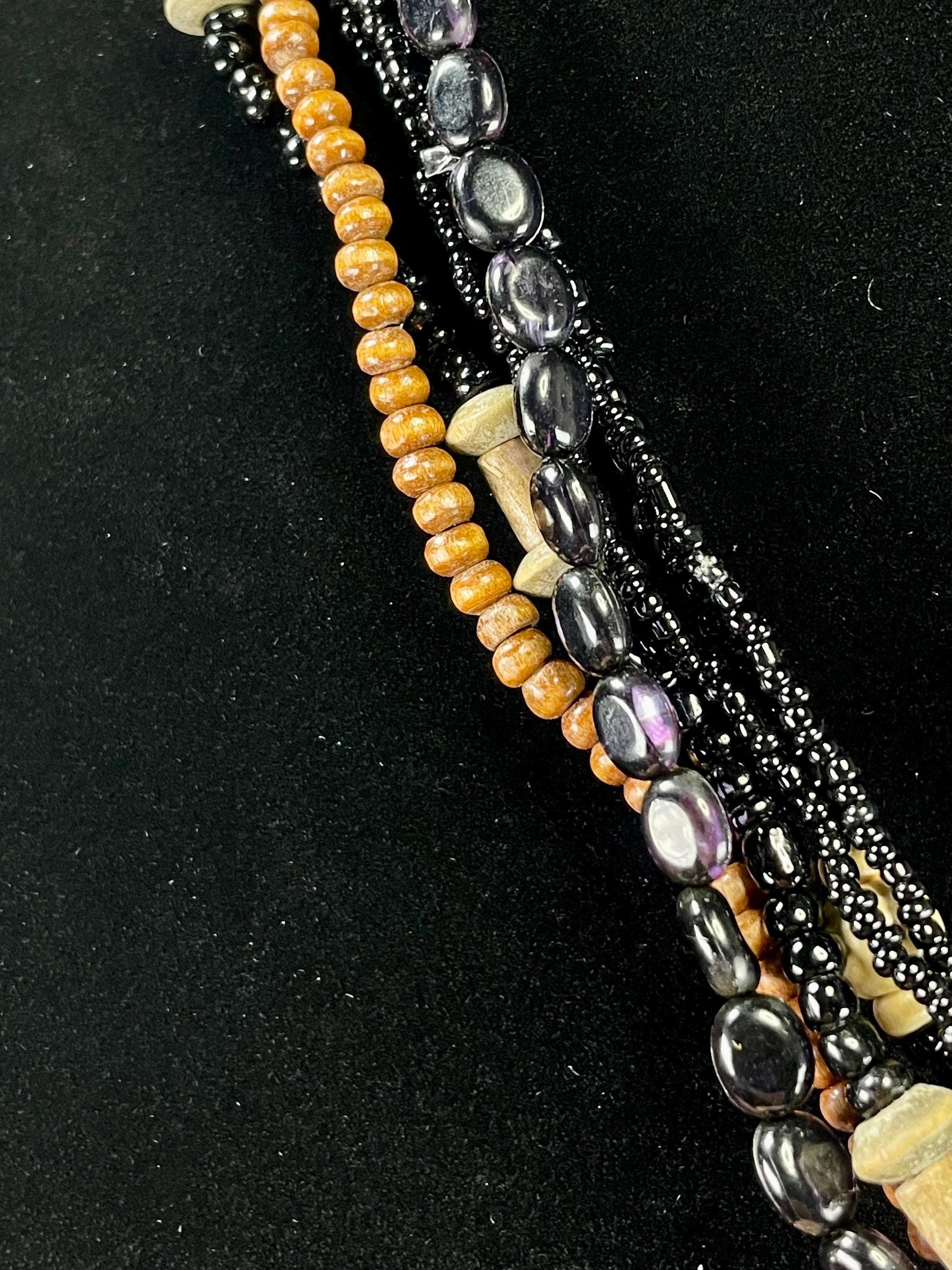 Wood and plastic beaded necklace, approximately 20 inches with two large interchangeable shell pendants.