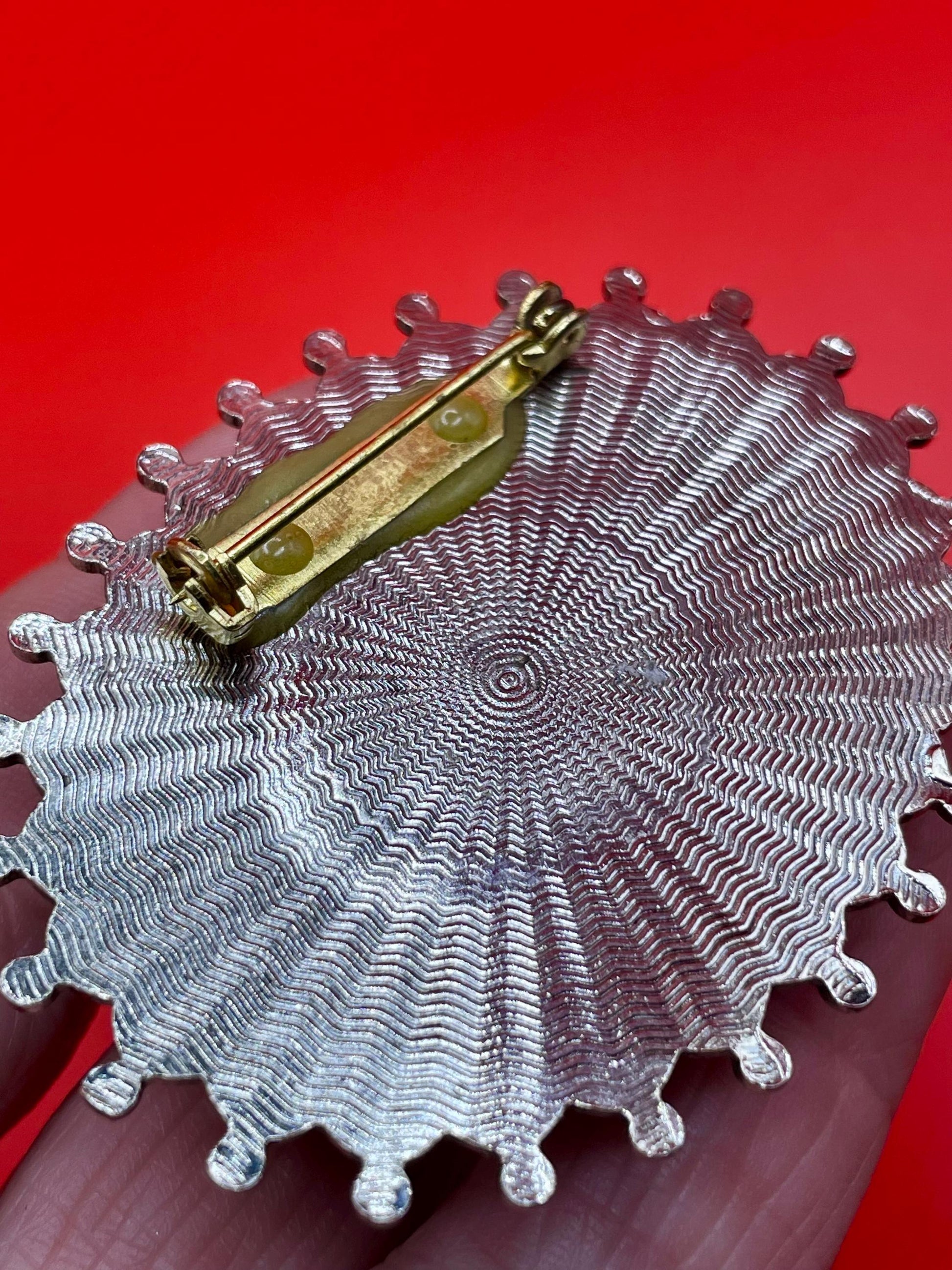Lovely vintage brooch. Hand painted clear enamel with purple floral design and gilded edging. Unique piece.