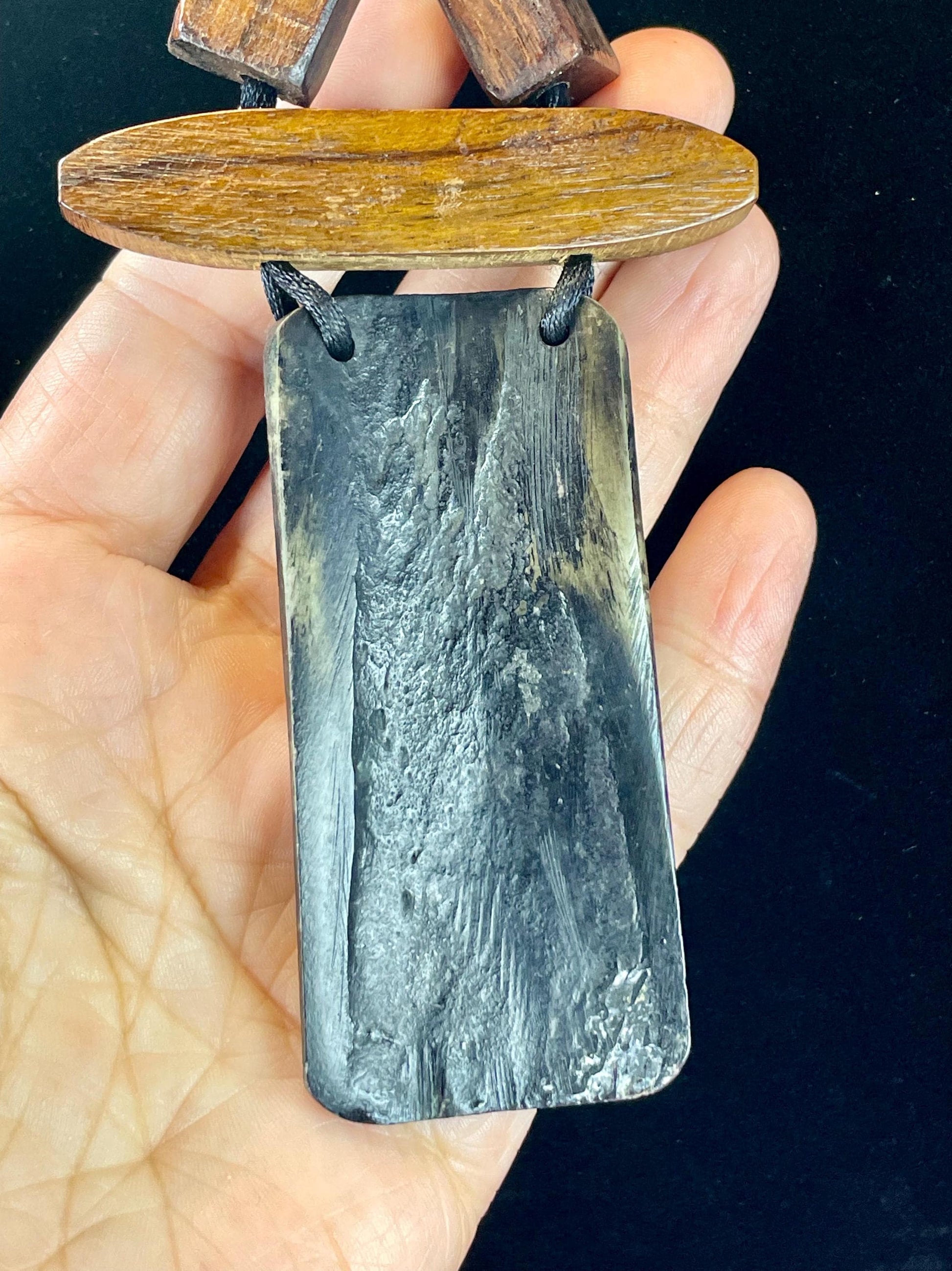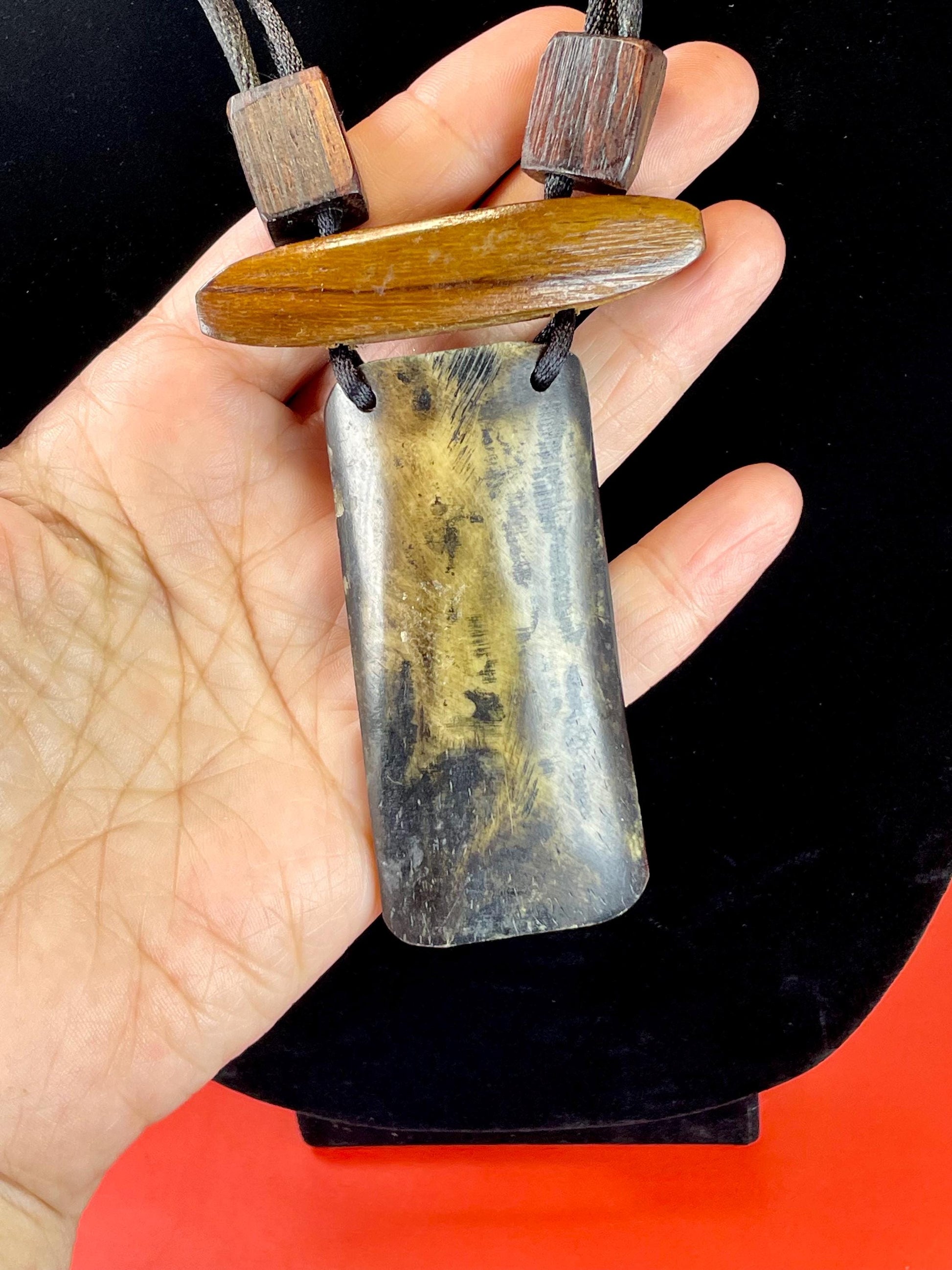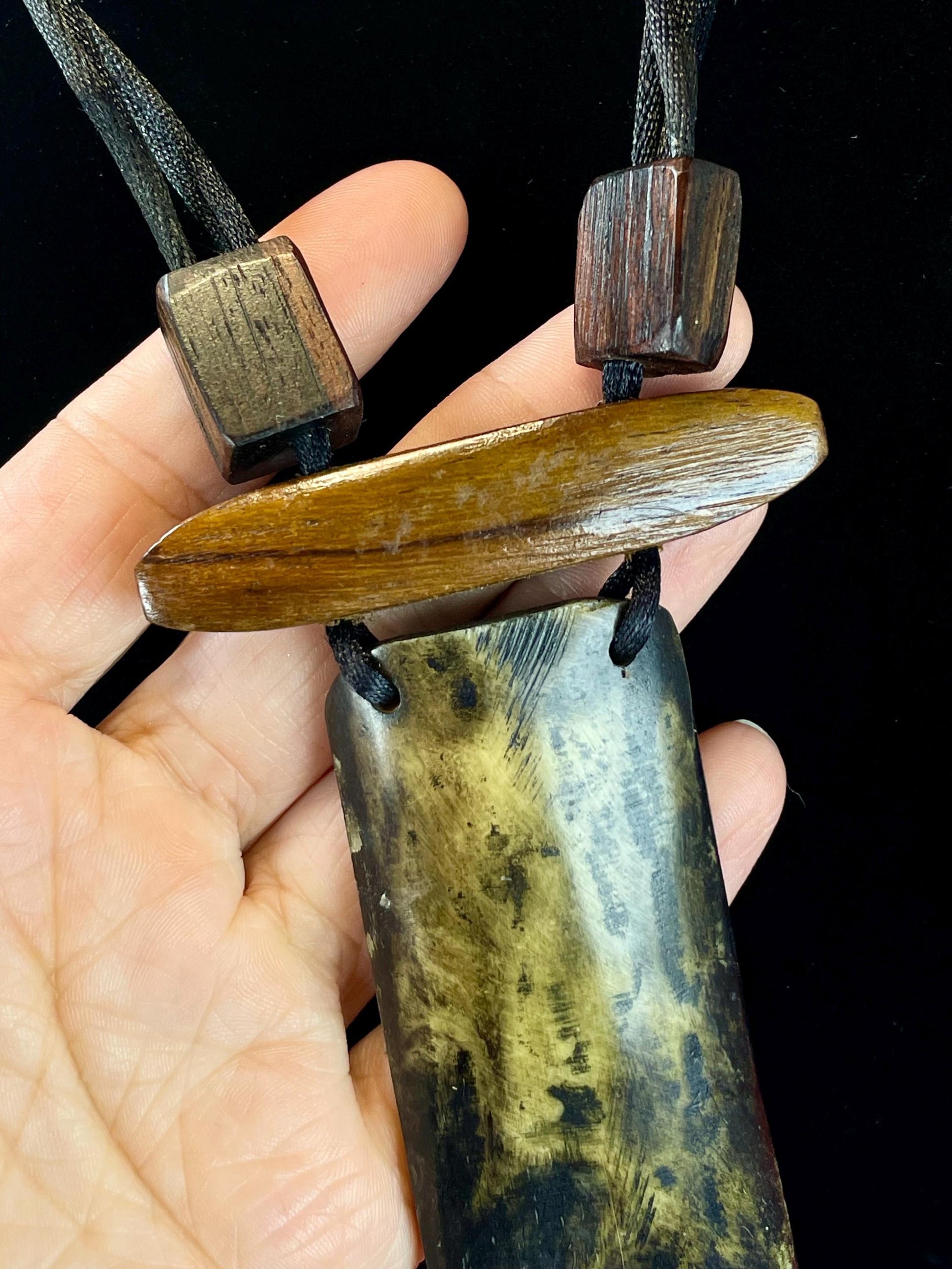 Rustic adjustable necklace with large horn pendant with added wooden beads.
