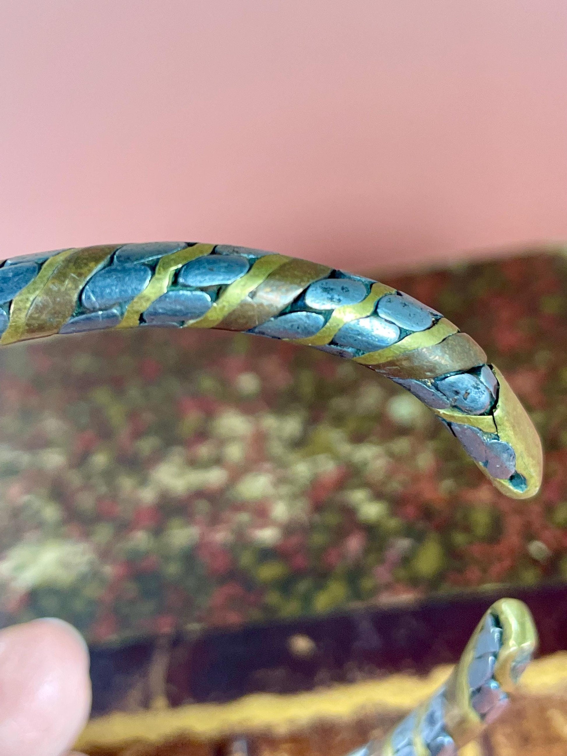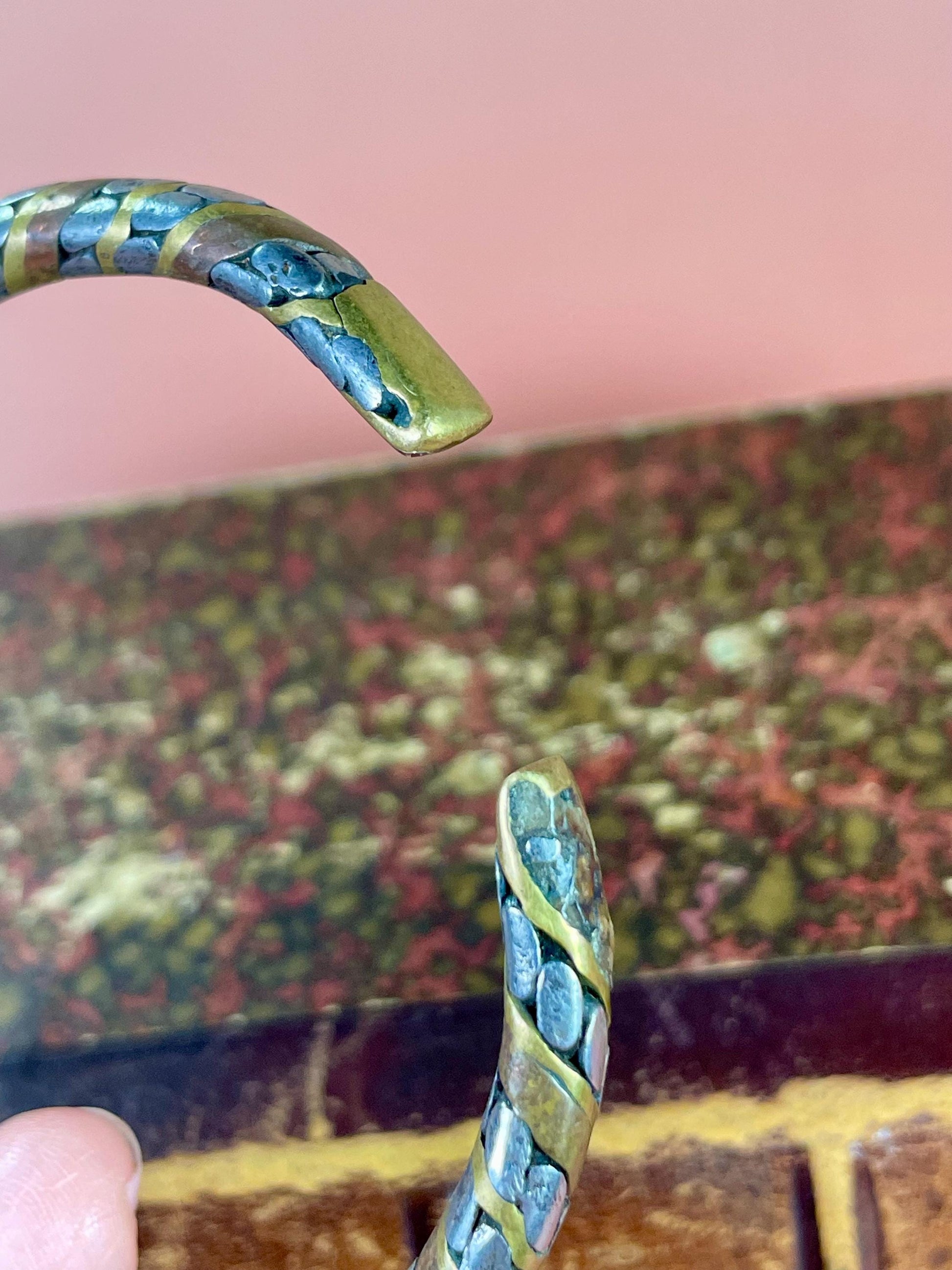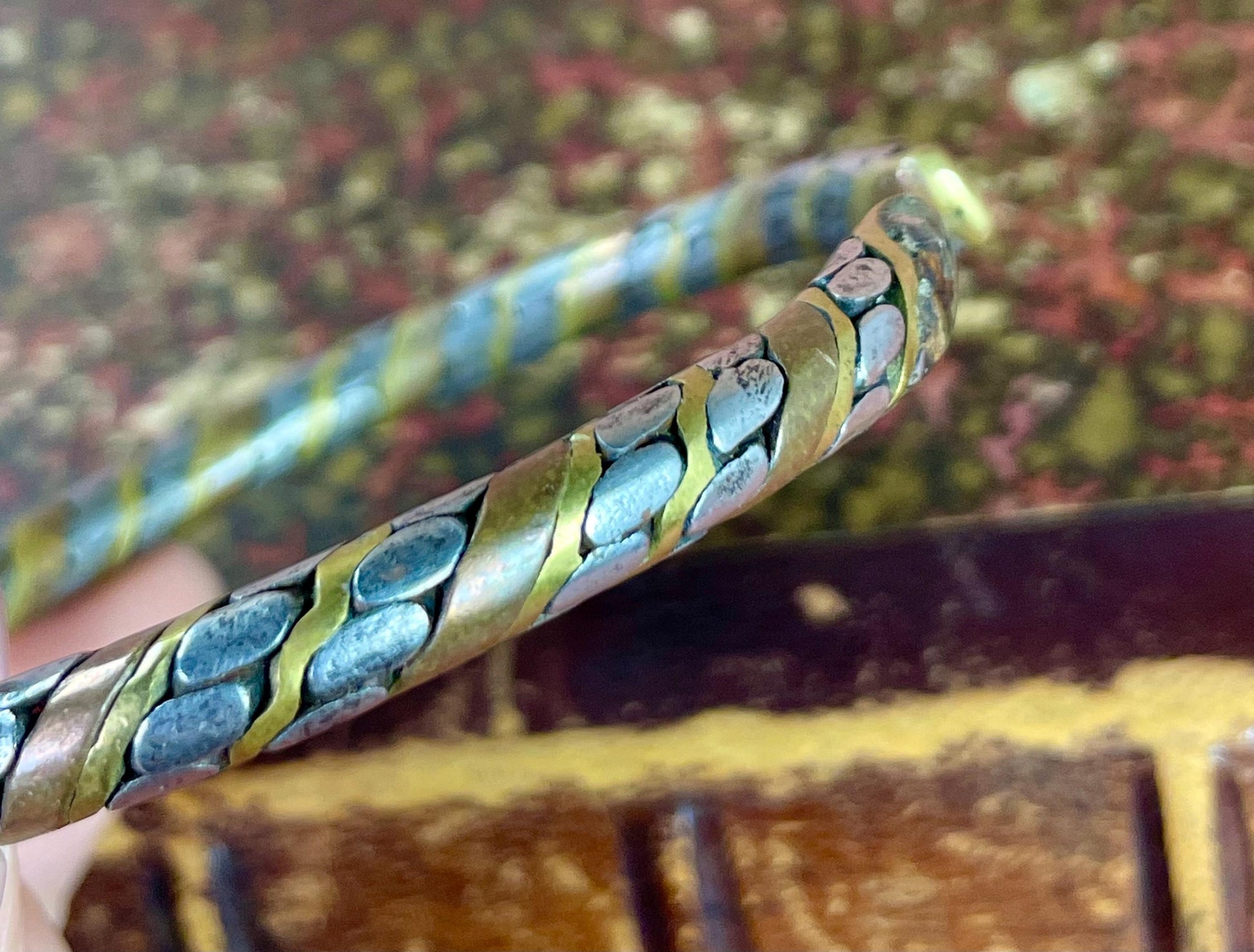 This unique bracelet cuff features an intricate design of intertwined copper, brass, and untested silver, offering a bold and stylish look. Perfect for those who appreciate distinctive, handmade jewelry.