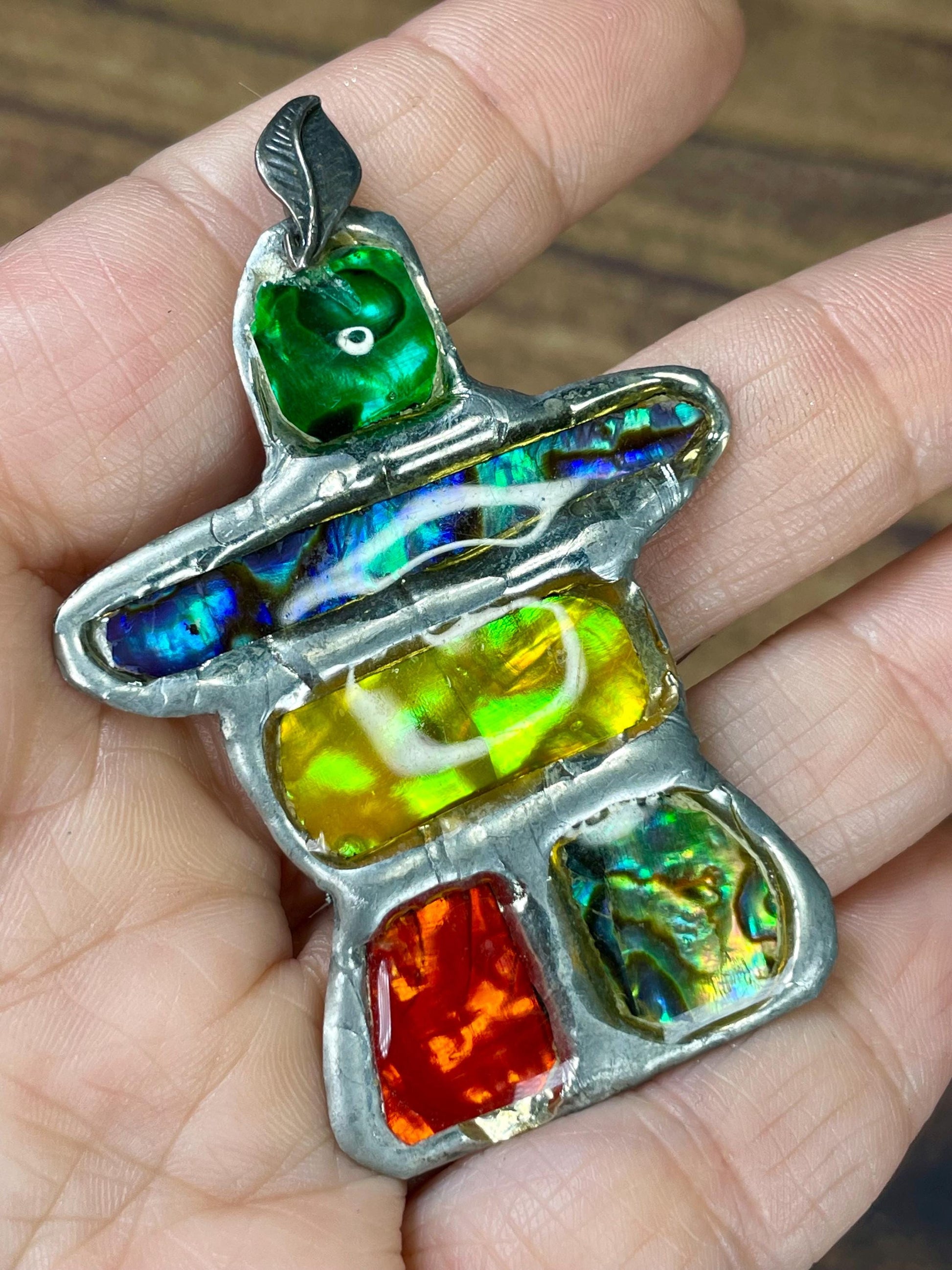 Handcrafted Inukshuk pendant featuring vibrant, multicolored inlays in a silver-tone setting. A striking, symbolic piece full of color and character.