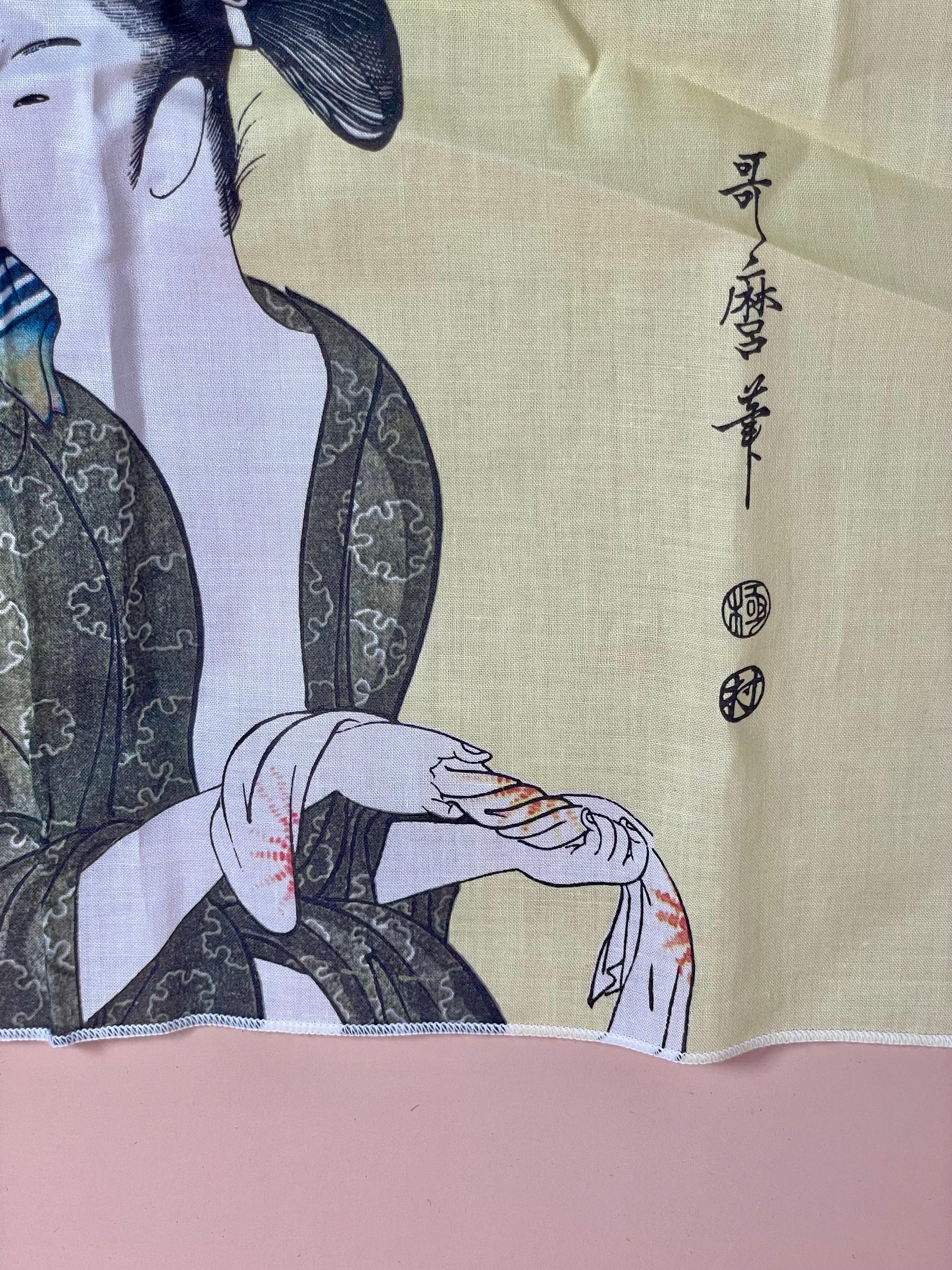 Set of two fabric squares featuring beautiful ukiyo-e style prints, inspired by traditional Japanese art. Soft, lightweight material perfect for display, sewing projects, or gift wrapping. Each piece showcases intricate details and vibrant colors in the classic style of Kitagawa Utamaro’s bijin-ga portraits.