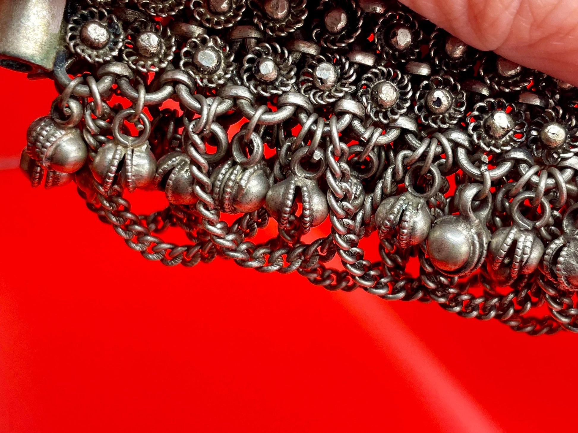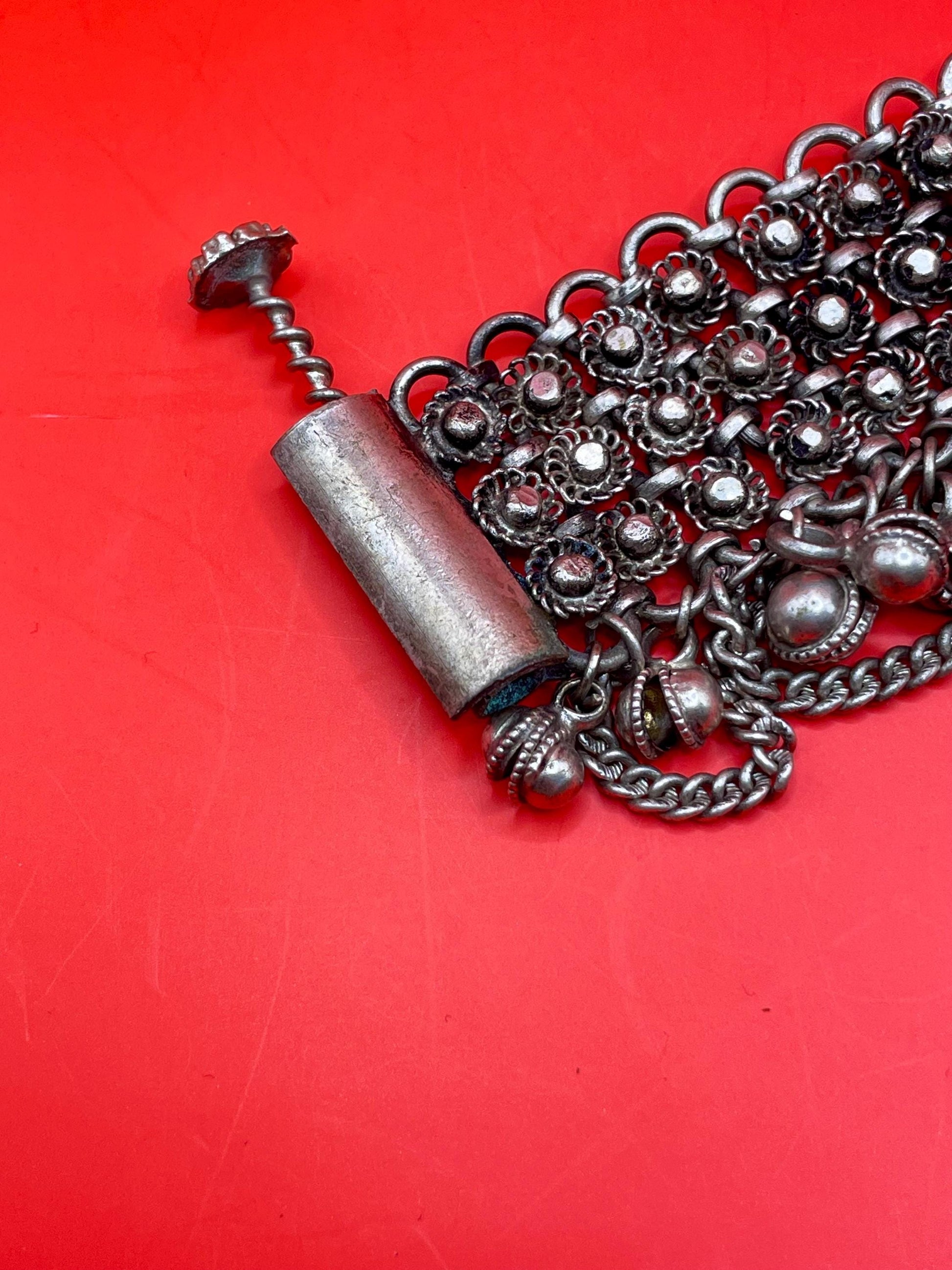 Jingly intricate meta chain bracelet. Flower topped a crew metal closure.