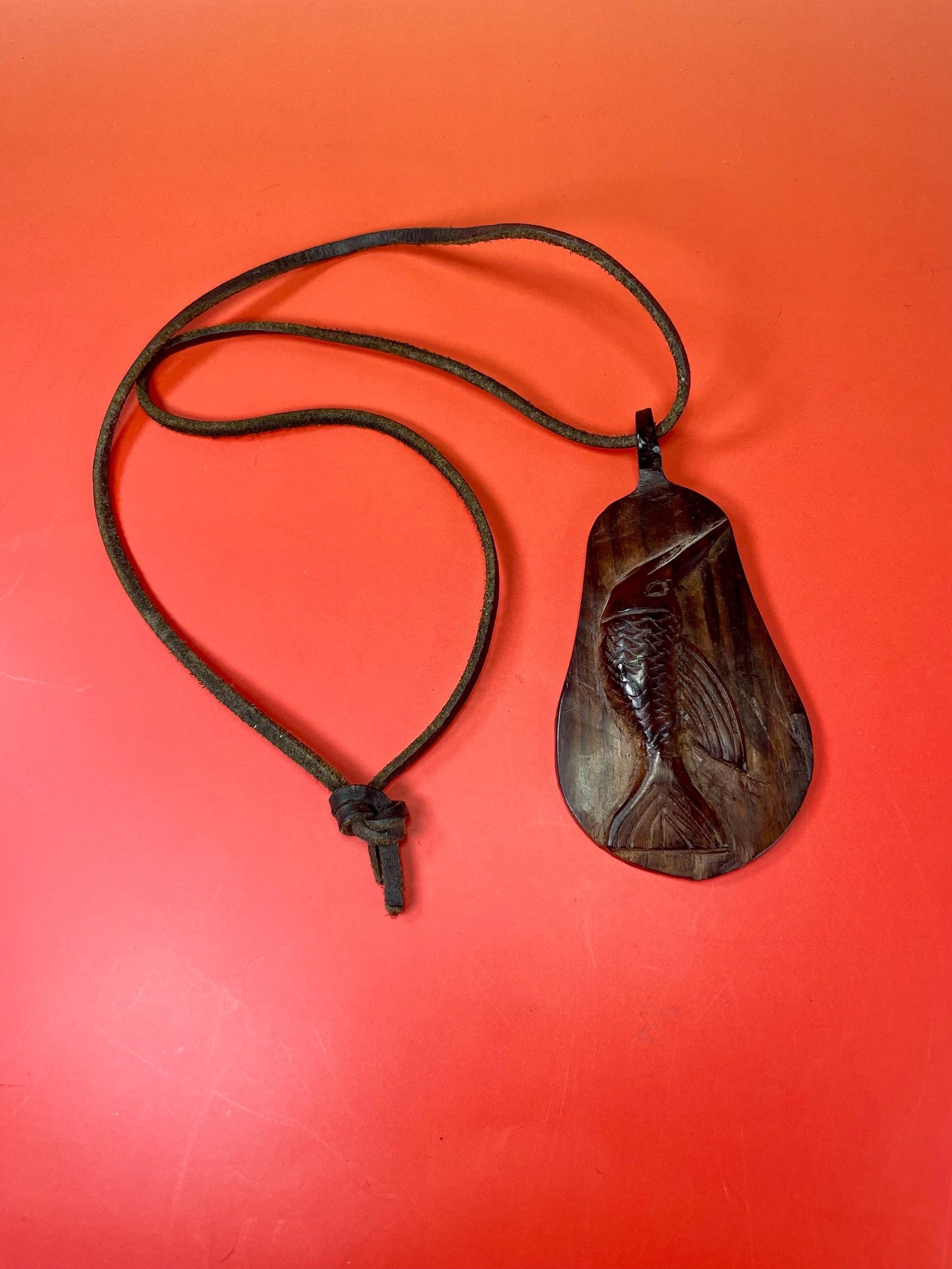 Approximately 4 inches x 2.25 inch pendant. lovely carved swordfish on a 23 inch leather cord.